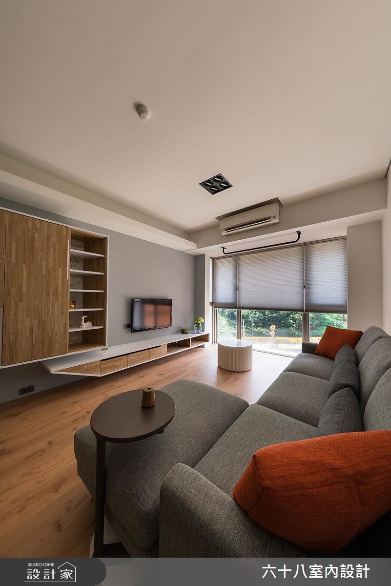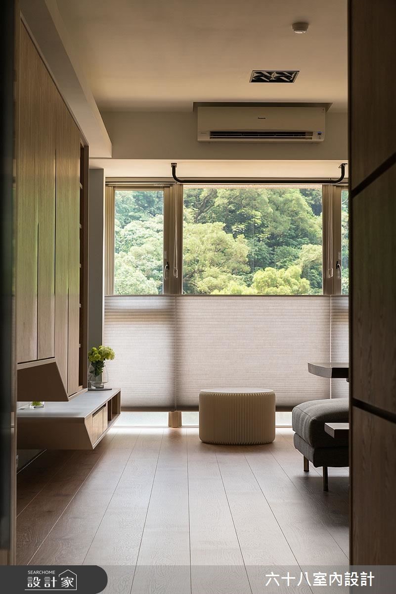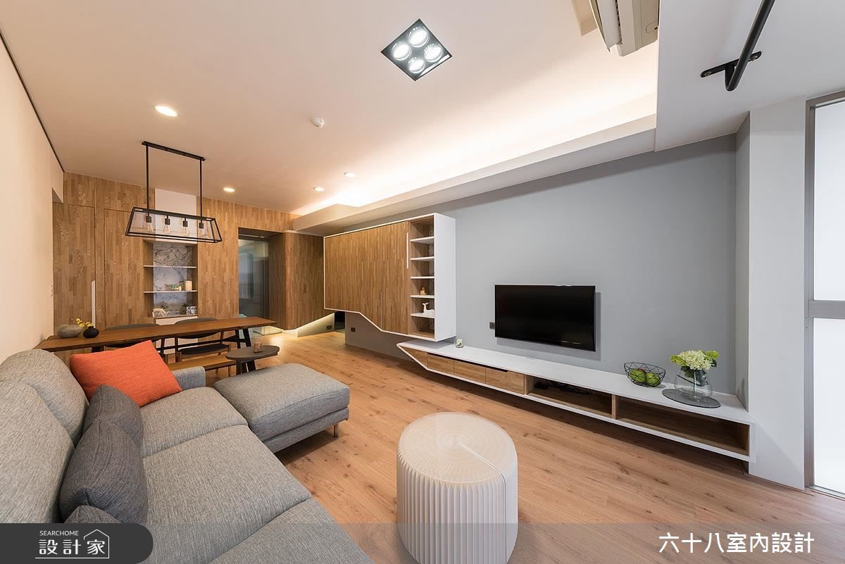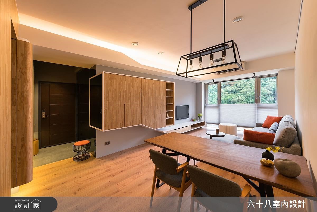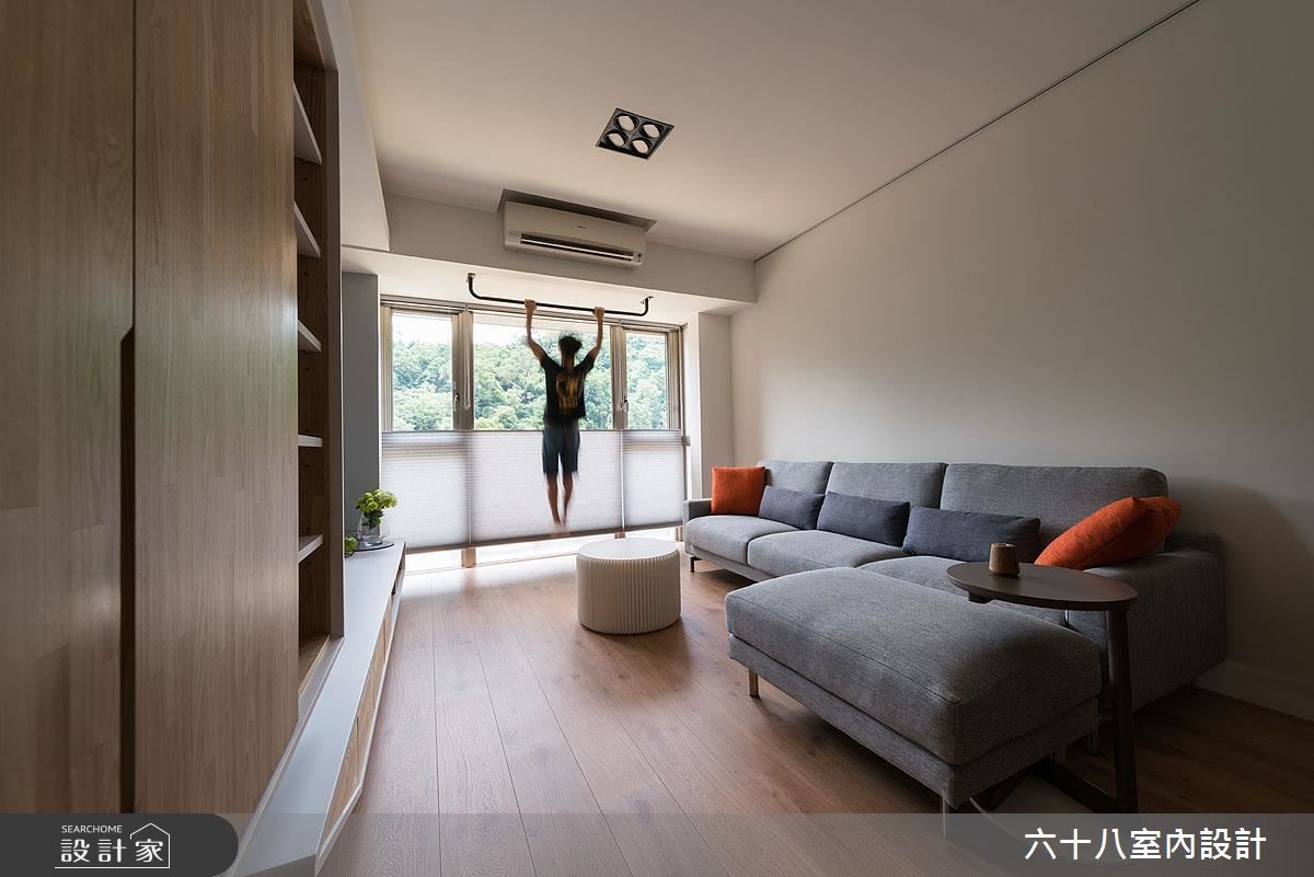 设计师引用休闲风格,于窗边摆放圆型沙发凳,成就赏景角度,开启空间与自然元素的对话。在景观、绿意、采光与木质的交织之下,凝聚充满盎然生机的居家气息。【切割修饰柜体线条,造律动视觉】从玄关开始,墙面铺贴大面黑镜,作为出外全身镜,也能反射空间无形扩容,另一侧则藉由柜体延伸与衔接,将玄关、餐厅与客厅加以串联。电视柜和鞋柜透过活泼的块体切割或圆弧修饰,调和出柜体线条的变化性;加上不落地的规划,搭佐隐藏灯光,型塑整体轻质表现。客厅则运用窗户引绿意入室,与餐厅的木质调性相互呼应,搭配天光照亮,创造舒适场景。此外,更在客厅天花上方配置单杠,让用户可一边赏景、一边健身,增添运动时的趣味性!
