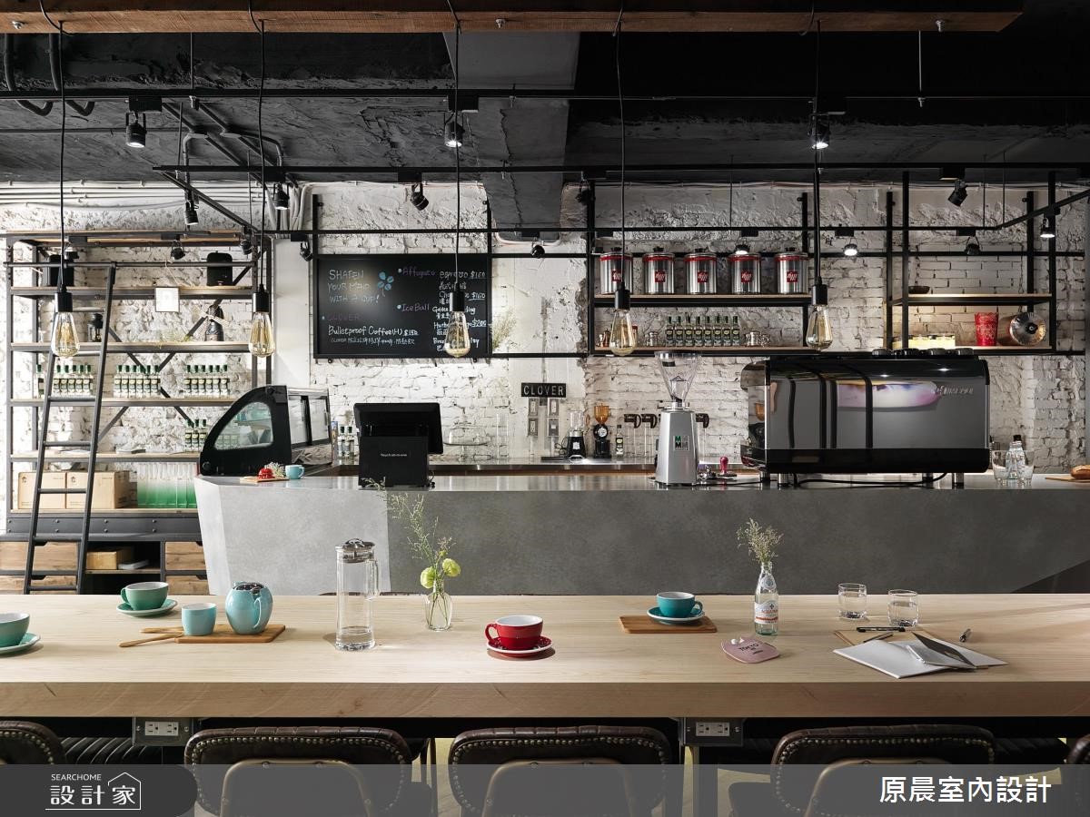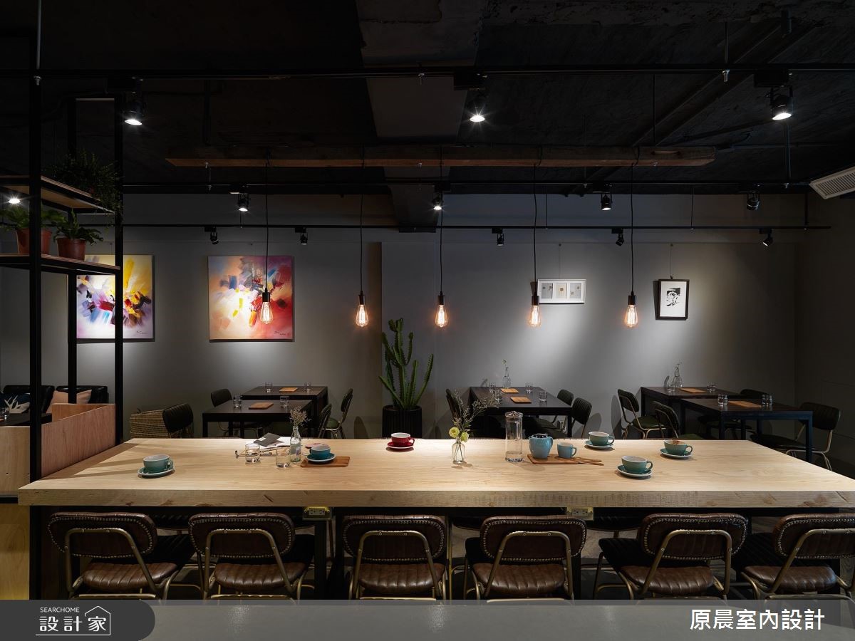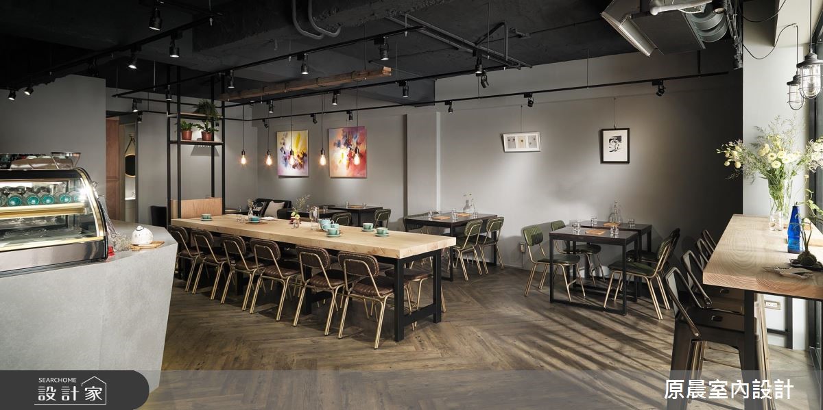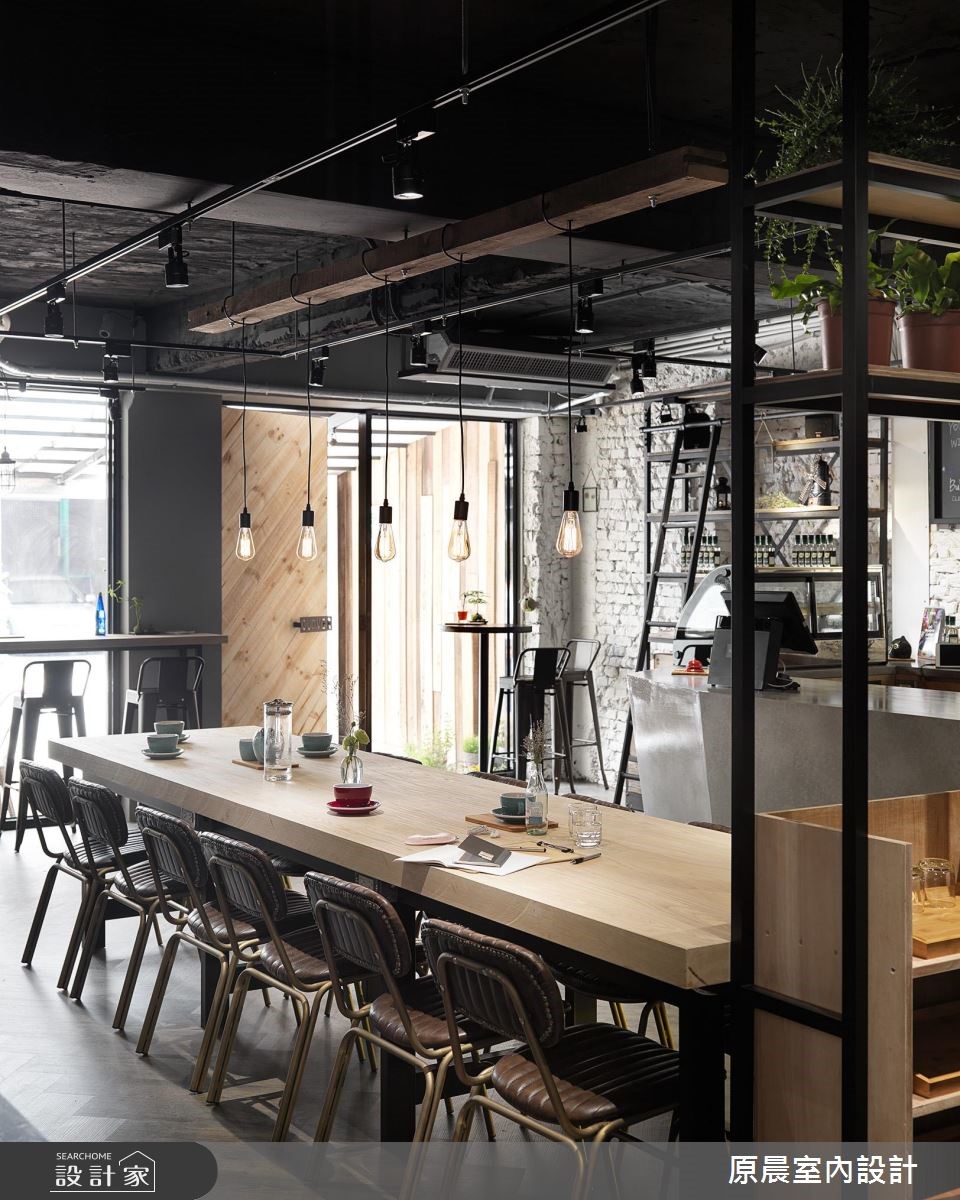 位于市中心的咖啡厅前身为待整理的老屋,原晨设计该如何将83平米空间打造为内外超过40个位子的个性咖啡厅呢? 【户外日光植栽区】利用透光顶棚打造采光佳的户外座位区,水泥粉光地坪与墙面搭配植栽,巧妙以木板垫高用餐区域,与走道形成区别。室内以人字拼的塑料地板延长视觉感受,减省预算,却达成一样的质感效果。透过精心动线安排,在两侧落地窗设置吧台,提供散客与窗景互动的机会。【混搭黑白灰裸元素】入门左侧规划为层架吧台区,吧台宛如一块有棱有角的大型石材,搭配间接照明与铁件收纳,营造利落与粗犷兼具的氛围。右方则为座位区,中间则是利用 10 人坐长桌作为分界,将裸露的砖墙漆成白色,搭配黑色的天花管线与灰色的墙面,形成富有个性的工业风格。