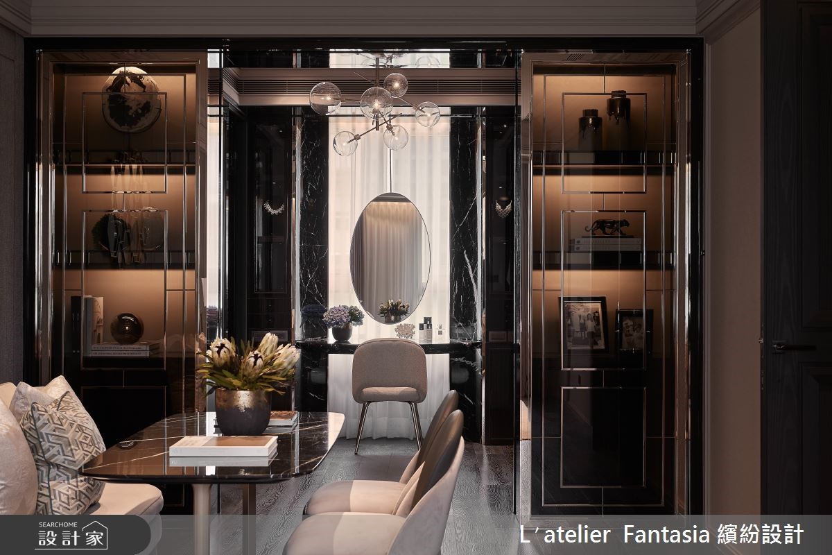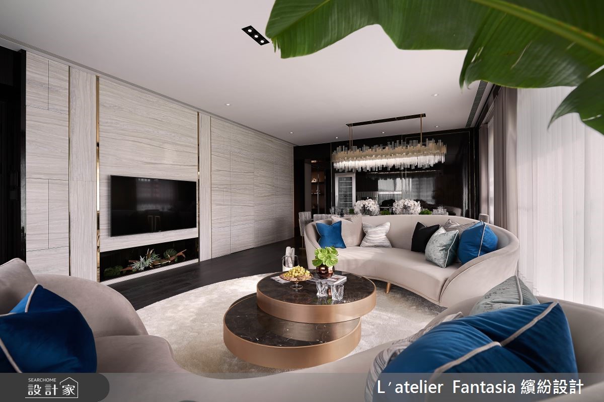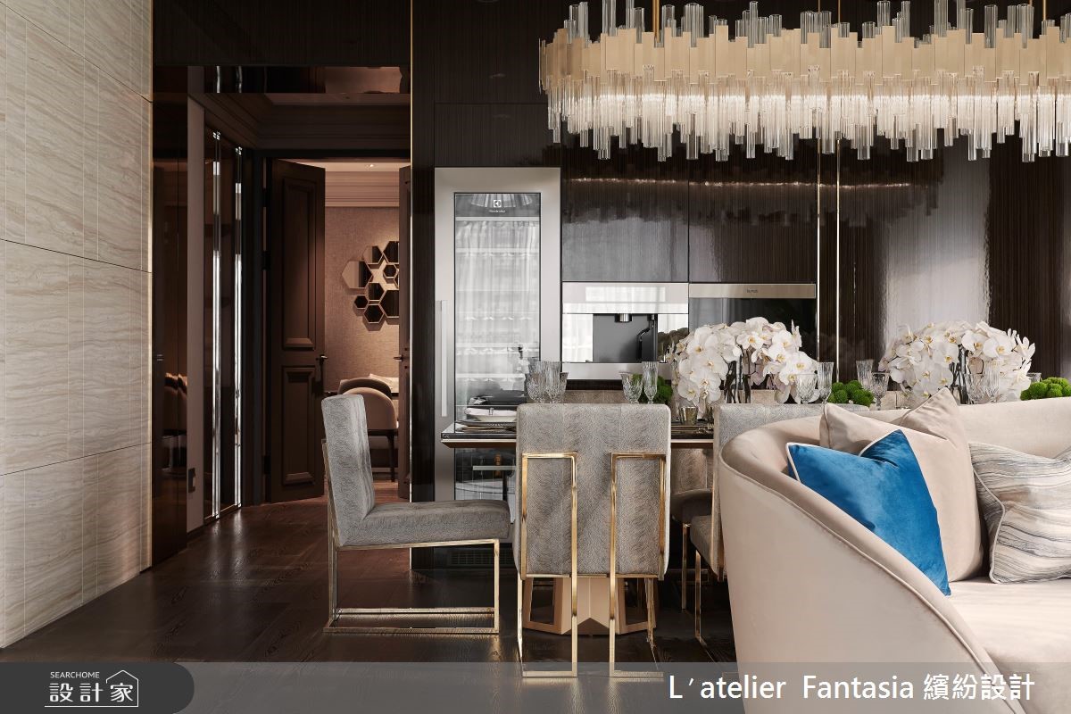 即便没有刻意的雕琢,也能有高级、精致的生活气质!152平米的新古典风居宅,设计师透过色彩、材质的擘画,保留了纯粹美好的生活品味,客厅处采双沙发设计,并将弧线造型的沙发椅相对,让生活主角成为眼前的彼此,日常中的对话、相处,都是值得珍惜的居家画面。【金属材质,让新古典时髦利落】有别以往新古典风格的繁丽印象,设计师以简洁利落的线条和金色材质,在细节处显现优雅内涵,电视墙贯穿客厅、餐厅,以大面积的石材壁面和金属框线,结合了卫浴、厨房门片,一并整合原本零碎的空间划分,变得更加大方时尚。【气派造型水晶灯成为用餐焦点】餐厅处可供8到10人用餐入座,宽敞的桌面除了用餐外,也可依据不同主题,适时变换桌上的花艺、蜡烛、餐盘配置装饰等,让餐饮时光更添趣致。而后方的深色柜体,则透过深邃的背景延伸了空间景深,也完美衬托餐桌上方的金色水晶吊灯,成为亮丽的主焦点。