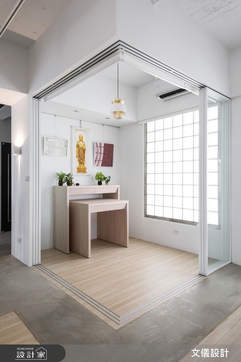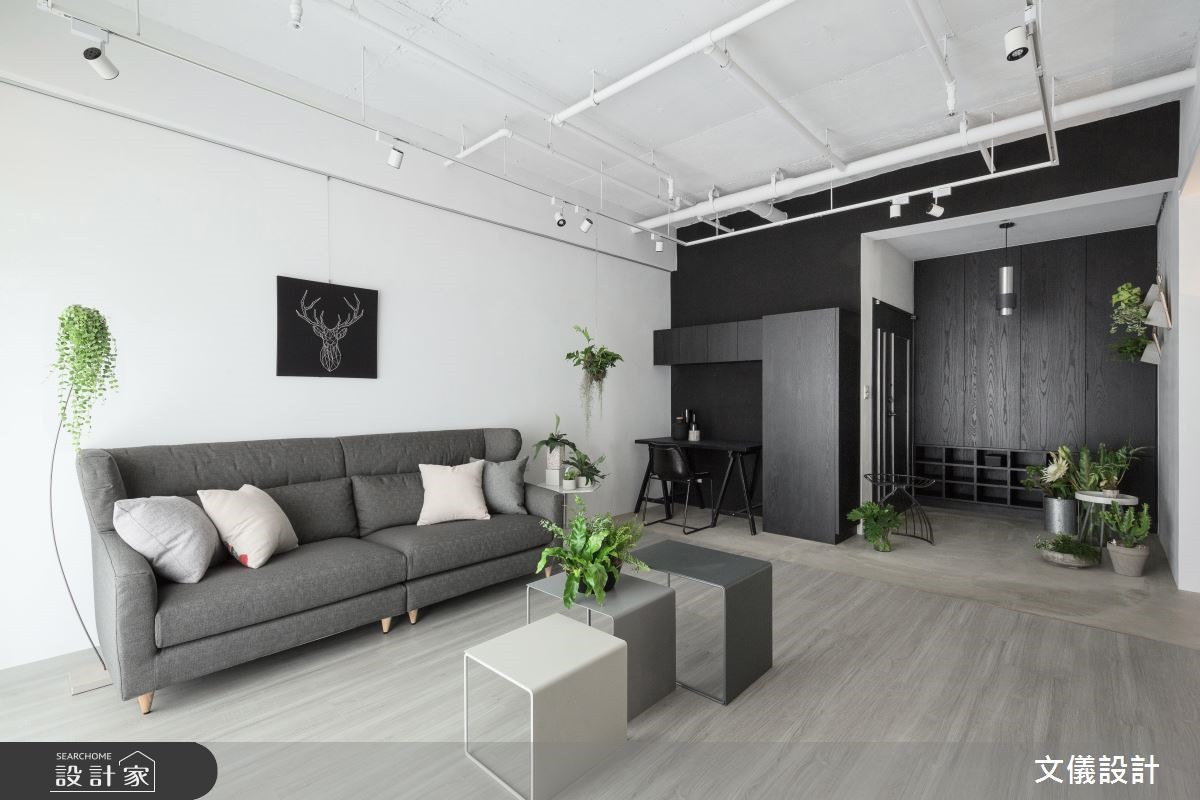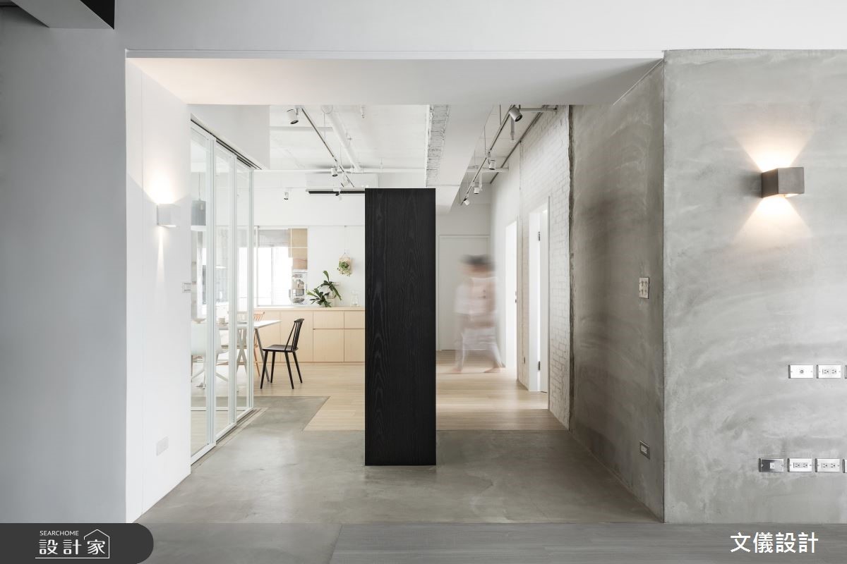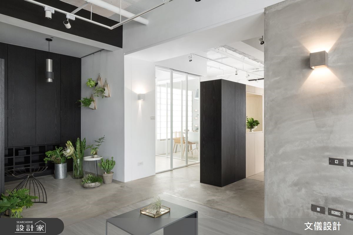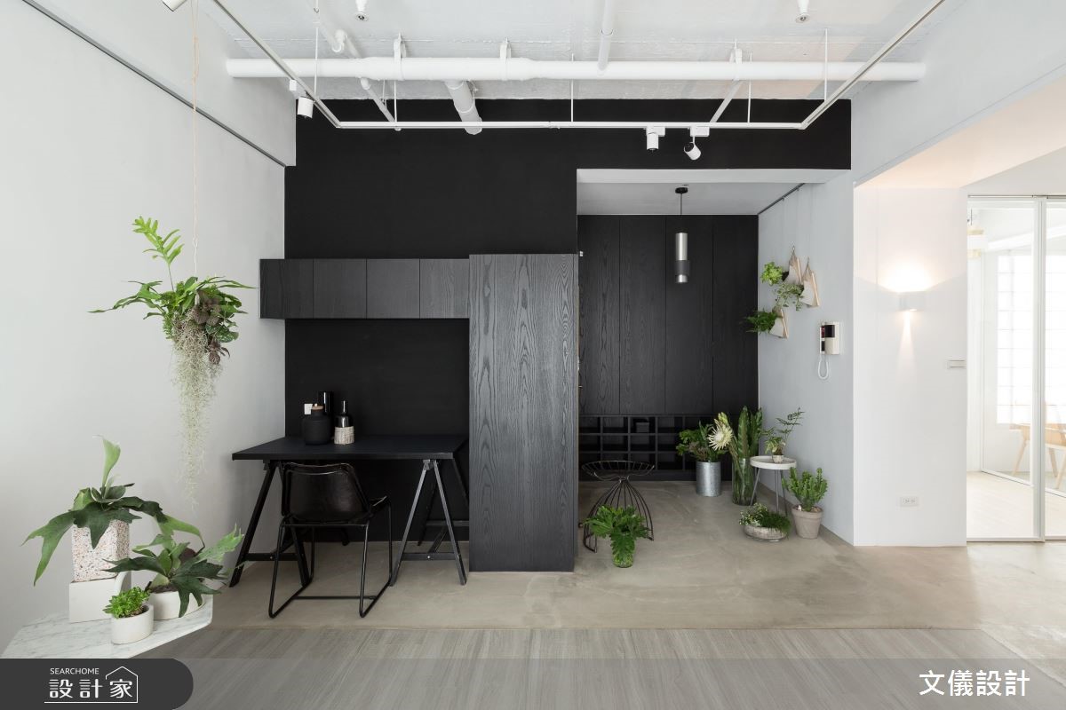 设计师不透过墙体定义空间,改用利落的黑白交接转换空间表情,同时保有明亮采光,凝聚宽阔的无压氛围,承袭着一家人对于自由生活的向往。化繁为简的设计手法瓦解特定风格局限,营造百看不腻的居家视野。【染黑柜体,刻画深刻视觉】藉由水泥地板与白墙,框塑整体的简洁架构,并加入黑白色调,搭佐温润的木质、少量的金属,于粗犷之中保留细腻温度。而错落穿插的绿意植栽以各种形式出没于视线之内,展现出生动的疗愈气氛。运用柜体切划动线,将木纹柜面采染黑处理,犹如一道深刻的线条,界定出餐厨与私领域的范围。餐厅内,注入轻盈的空间印象,采用清玻打造隔断,形成餐厅、厨房之间的通透联系。并藉着玻璃弹性推拉门的围塑,让一旁佛龛化为整体设计一部份,丝毫不显违和。