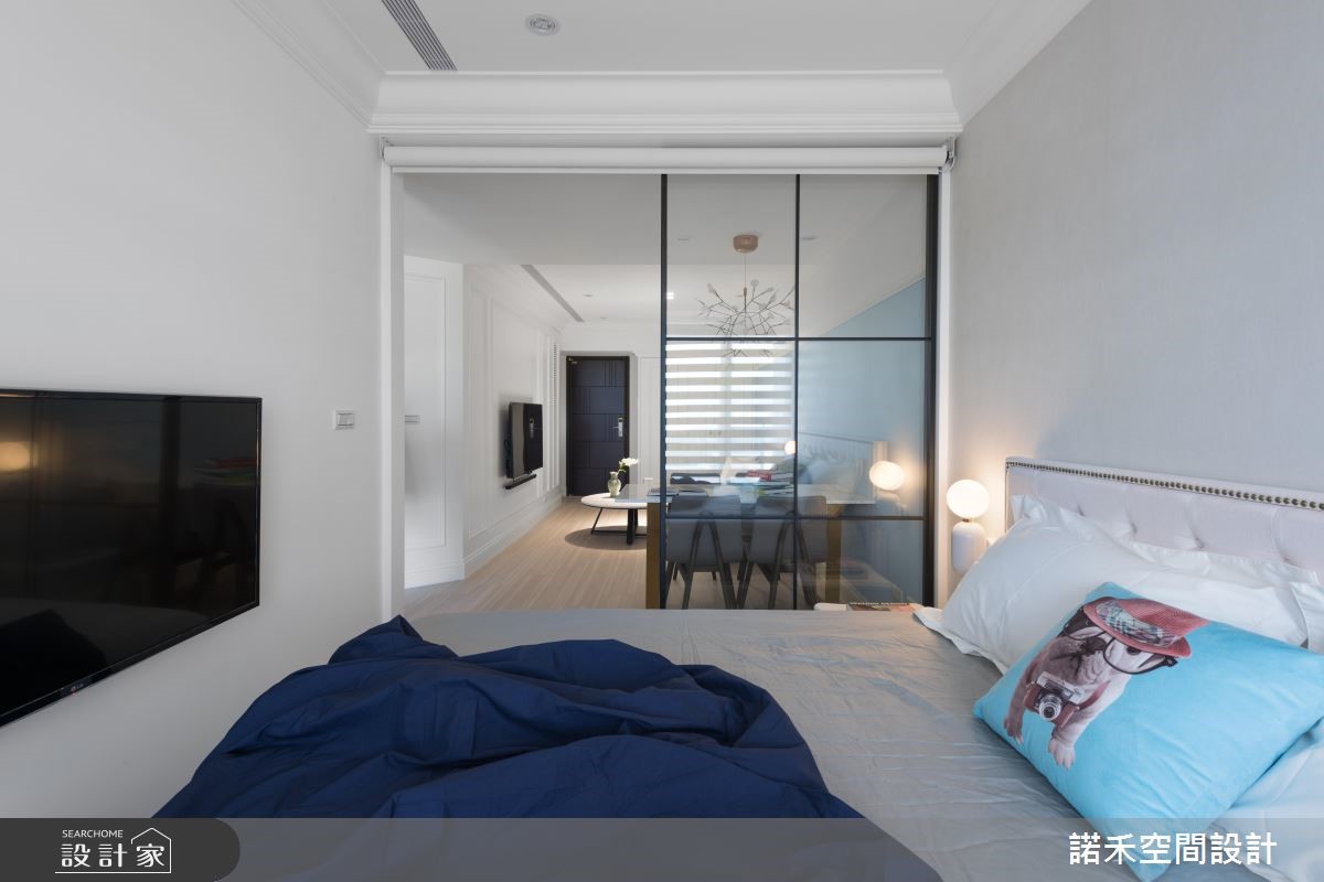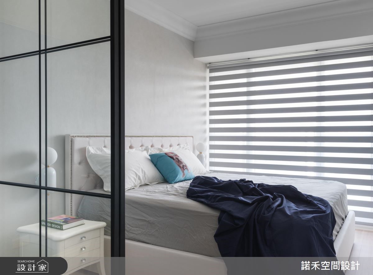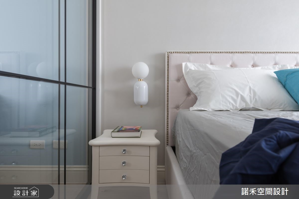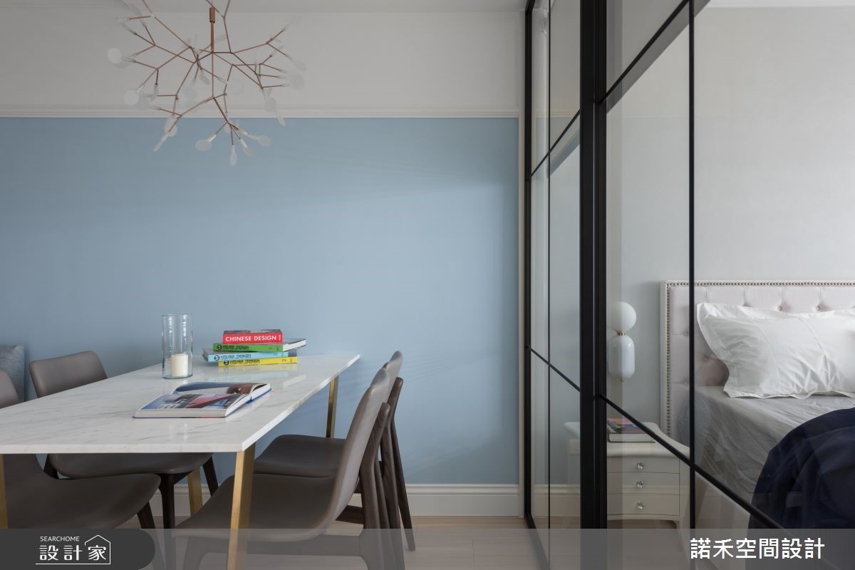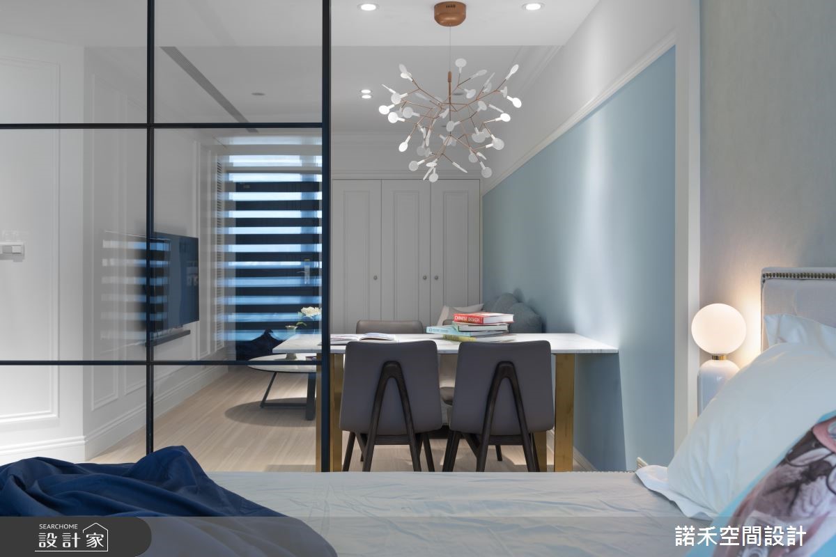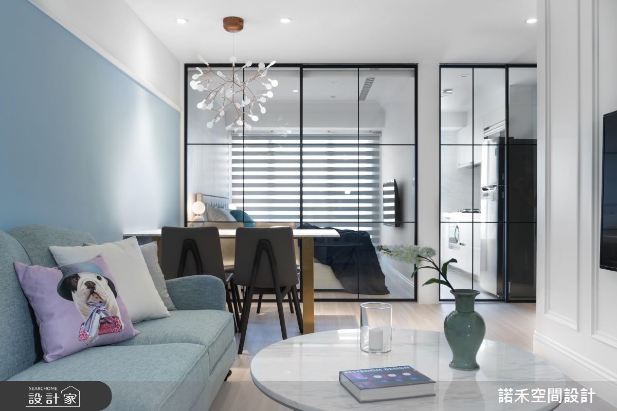50平方米美式风小户型,为新婚夫妻的婚后居所,设计师,不仅加入美式风韵,更集结采光、通风、唯美色调等元素,打造出丝毫不显闷热压迫、小而美的生活风景。【玻璃隔断,引入阳光与风景】采用玻璃横拉门当隔断,顺势将卧房窗外采光及景观带进客餐厅,并藉由通透的玻璃建材,型塑开阔无碍的空间感,同时于壁面挥洒浅蓝色调,带入蓝色海洋的浪漫惬意,搭佐简约线板雕琢、不厚重的家具选配,使公共空间显得明亮不狭隘。【纯净白色调,调制舒眠氛围】卧房则运用白色作为基底,勾勒出纯净的空间质地,以抱枕、造型床头灯等点亮视觉焦点,并透过与公共区域畅通的视线连接,以及轻柔的木百叶窗配置,促成轻盈好感的寝居质地!