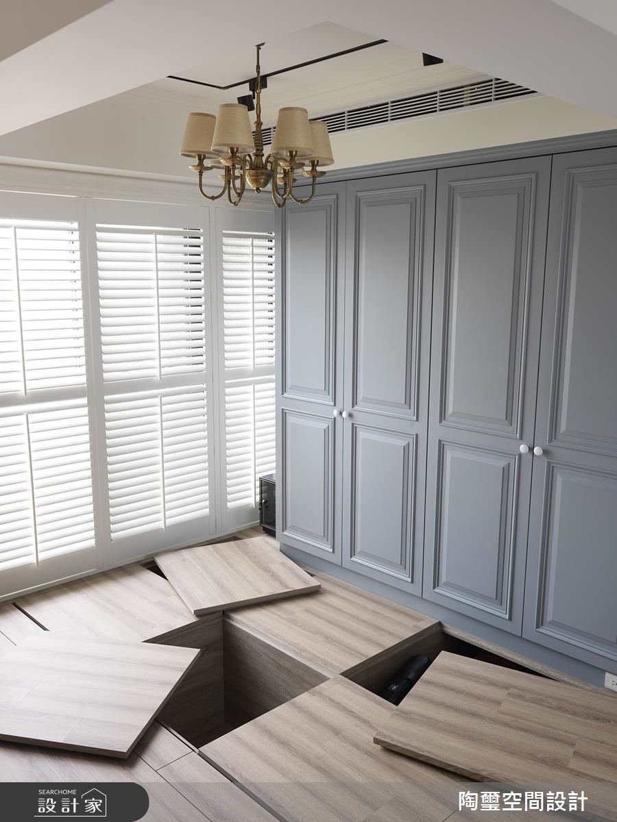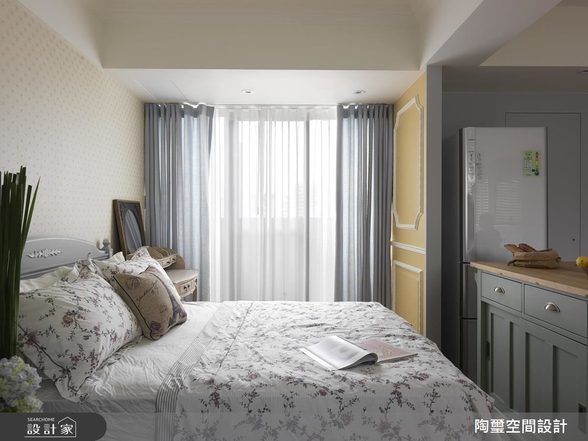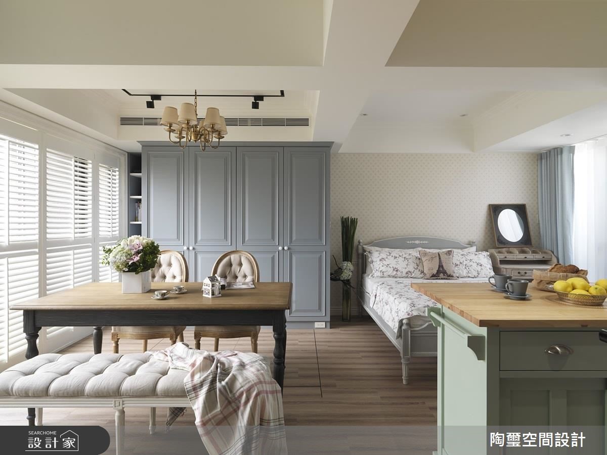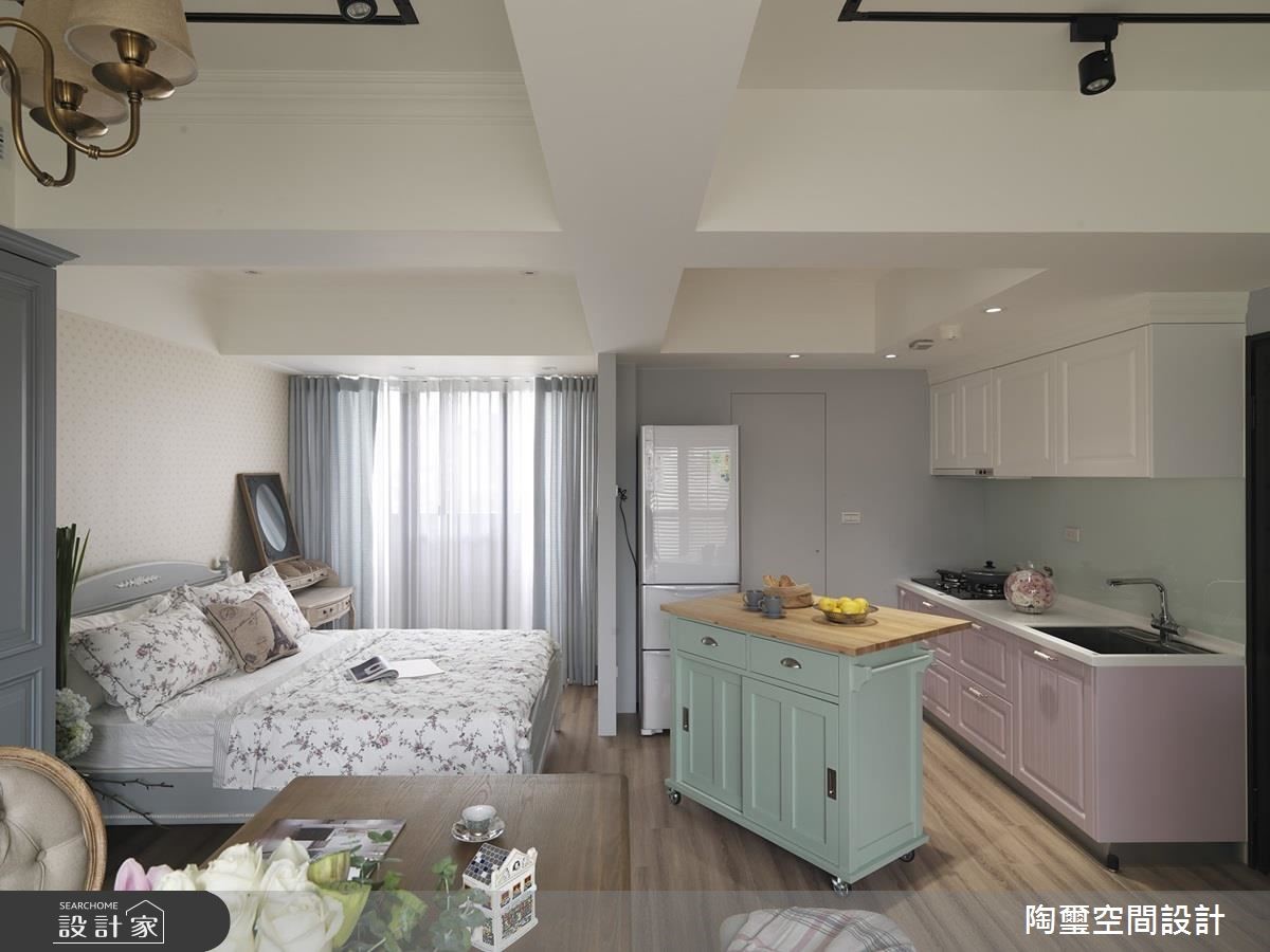 仅仅36平方米的空间必须容纳小夫妻的日常作息,该如何将原先只提供套房架构下的小户型扩张为蕴藏烹饪、收纳等完整机能的新婚宅,陶玺设计给出完美的解答。【小户型也能拥有梦幻乡村宅】由于空间有限,设计师以全开放设计安排动线,划分为1室1厅格局,入门左侧为客厅与多功能餐厅,右侧则为厨房与卧房。所有公领域的家具、配件皆为可移动式,大幅提升小空间的机动性,另外更因应睡眠需求,设计师为卧房增设推拉门,随时能拥有隐私。【来过粉嫩棉花糖系新婚生活】为了打造地道乡村风格,电视墙是带着大理石纹理与栅栏的经典壁炉造型,而一字型厨房与收纳柜门则以简约线板呈现。在家具软件与建材选用上,以木百叶超耐磨木地板、木质餐桌、钉扣单椅、碎花及格纹彰显温柔乡村特色。全室以缤纷不扎眼的粉嫩色系,完成唯美氛围营造,包含婴儿蓝柜门、粉红厨具、薄荷绿移动式中岛与鹅黄色造型线板。