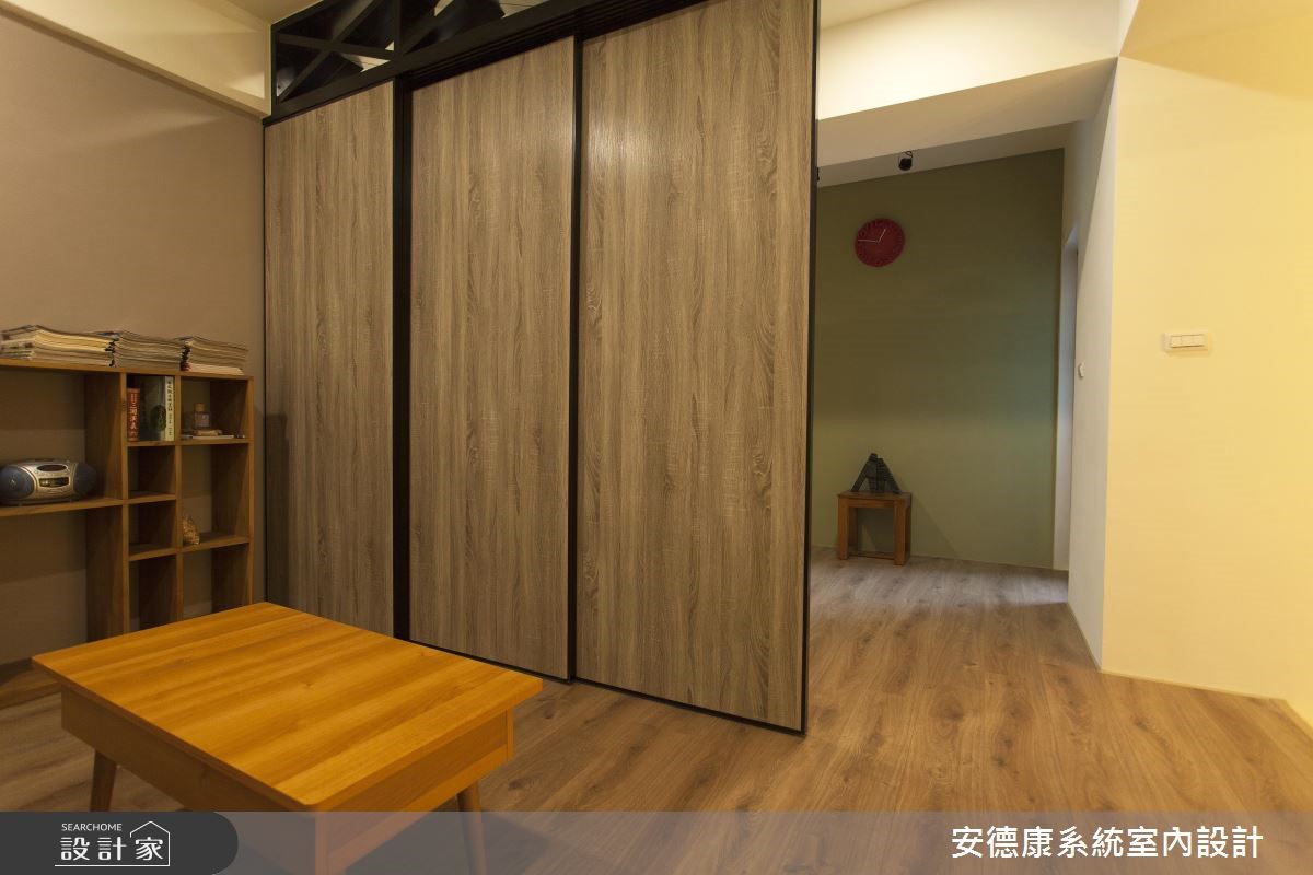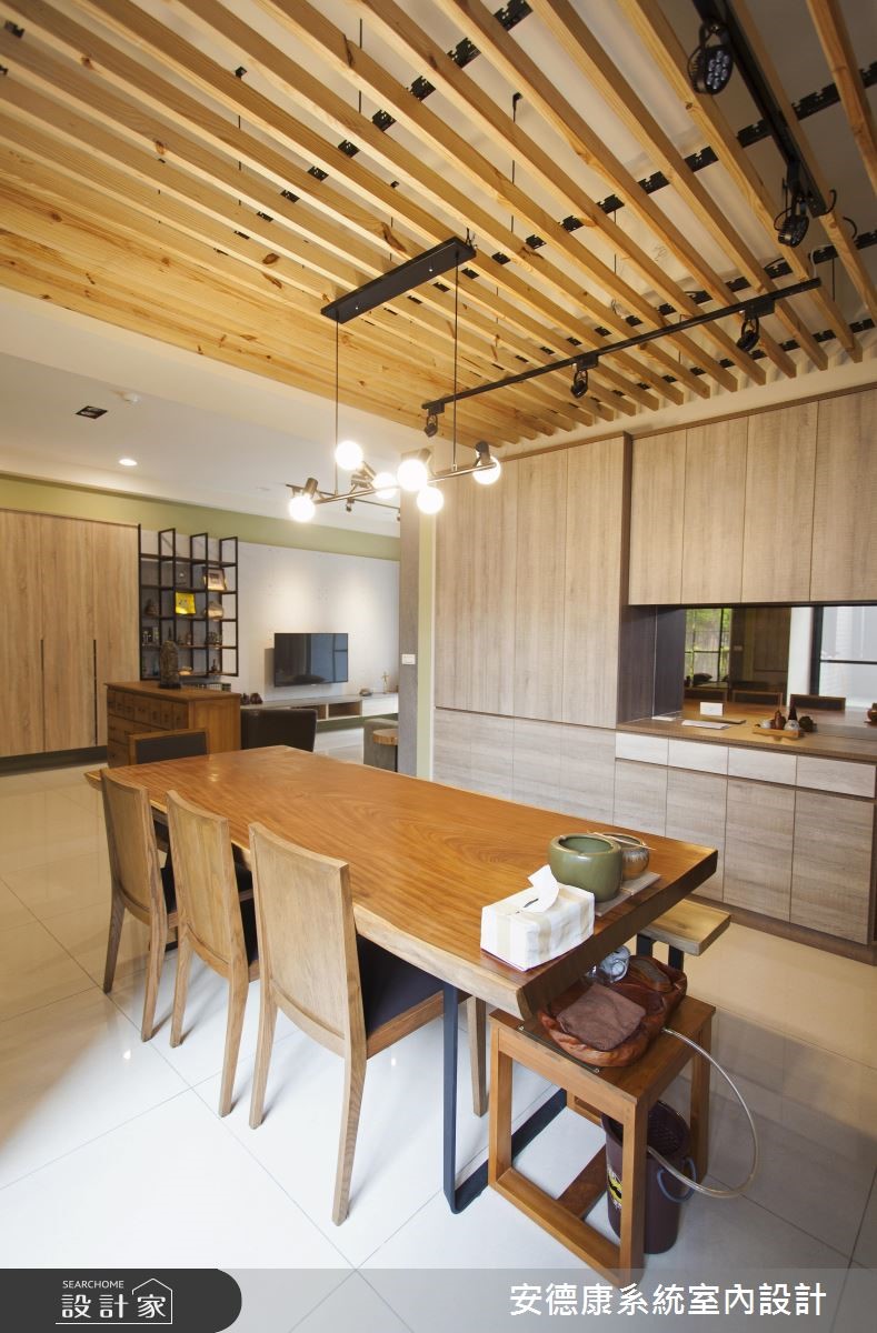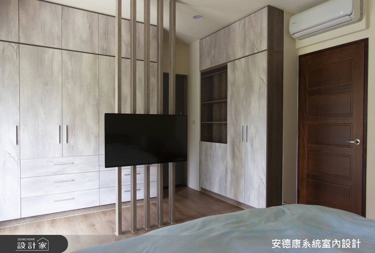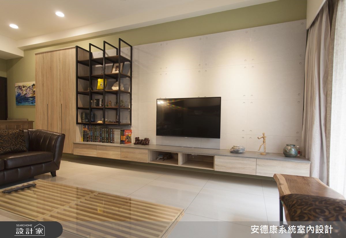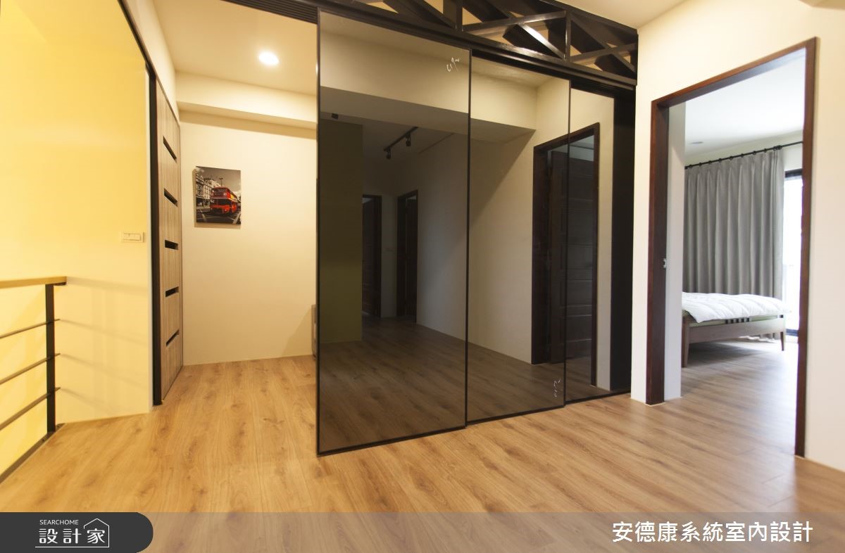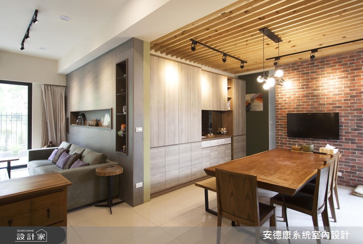 132平方米的复式楼中,设计师着重于动线规划与宽敞视野,并运用采光搭配建材,营造略带感性的温柔氛围。收纳机能则表现于大型柜体上,打造出深具时尚感的空间魅力。 【善用梁下设置柜体,扩充机能】一楼玄关入口处,藉由一座五斗柜界定出玄关、客厅的各自范围。电视主墙则采仿清水模水泥板铺陈,彰显宁静质朴的简单背景,再运用仿铁件的系统板材设计吊柜,创造出轻工业风的视觉亮点。沙发背墙上方正好有大梁经过,下方畸零空间设置柜体,让视觉变得完整,而柜体选用仿板岩的板材,注入些许粗犷风格,形成生动画面。餐厅选用文化石砌筑主墙,并配置壁挂式电视网罗视听娱乐,且特选的实木大方桌呼应与天花木质格栅,凝聚温润气氛。二楼起居室,以超耐磨地板塑造温柔气氛,另设置活动推拉门,背面刻意作成茶镜材质,让此处不仅兼具起居及独立客房之用,也借着镜面扩容,放大空间的视觉比例。