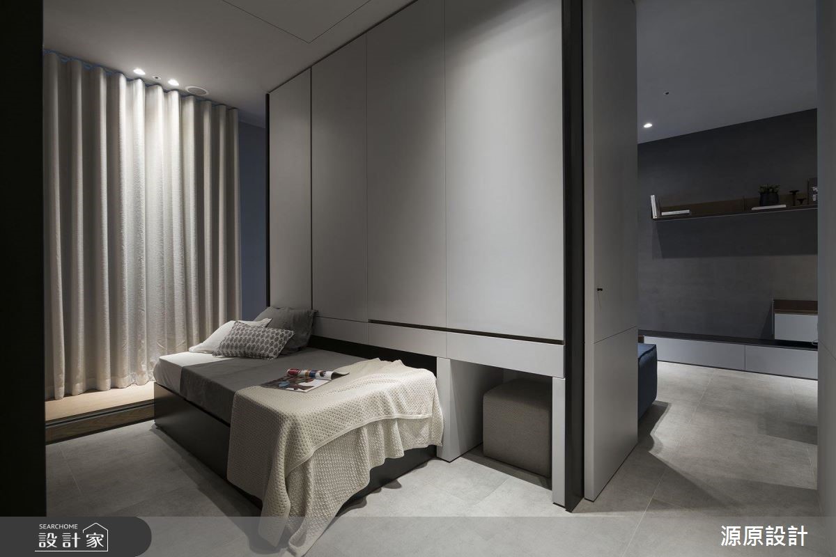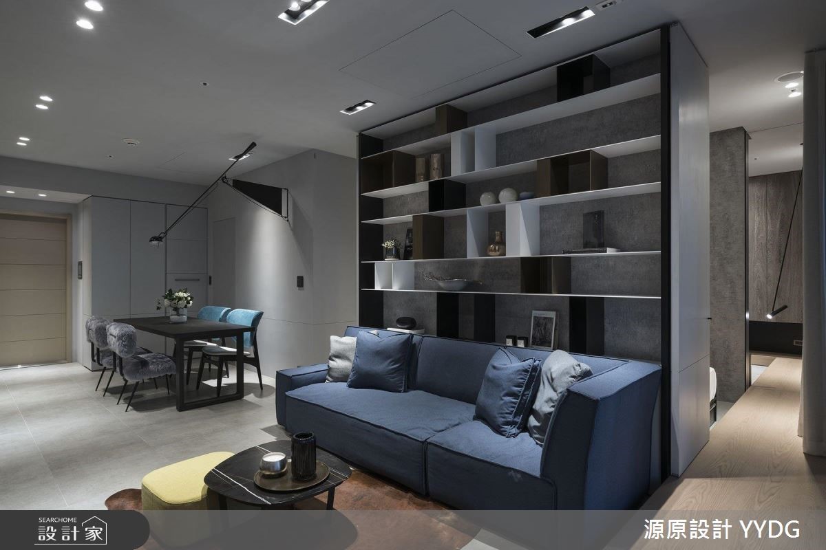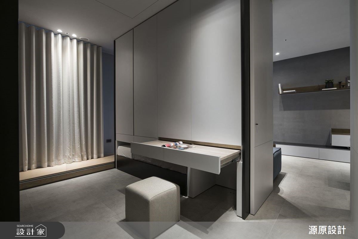 轻松推动柜子,就能立刻多出一室!79平方米的现代风样板房,以享受工作及生活的年轻SOHO族为范本,一个大书柜的多维面貌。可在生活、工作和聚会中自由切换属性,具灵活度的居家空间,适合小户型的格局配置。【大书柜机动弹性,收纳更灵活】如果平时喜欢约一大票朋友在家聚会 ,或是常待在家里工作,这处时尚简约的现代风居家就是适合这样的屋主。以黑、灰、白等利落的色调和线条为基础,设计师藉由可移动的柜子,让客厅空间可以自由变大变小。柜体后方具有强大的收纳机能,可以藏下书桌、椅,和一张简易的床组,若有客人需要留宿,立刻就能转换空间的属性。主卧室的规画也运用了隐藏式的收纳设计,利用木质拉门,可以随时将梳妆台藏起,让卧室画面更加简洁清爽。
