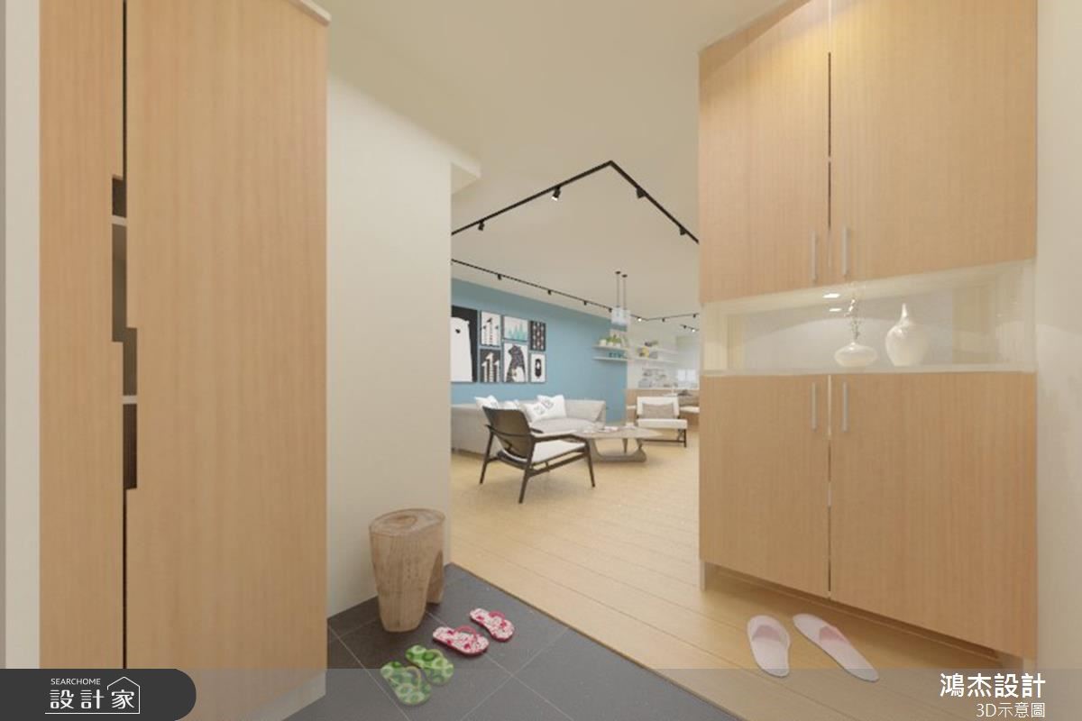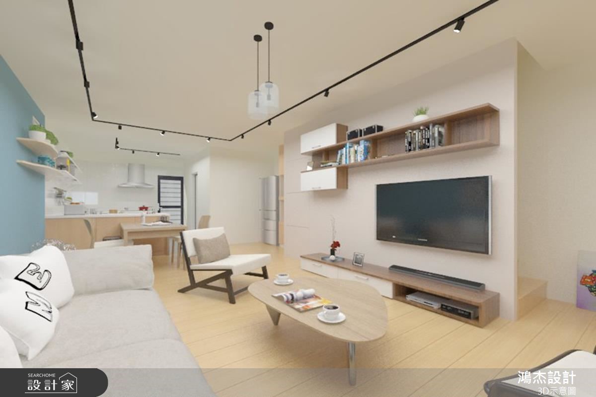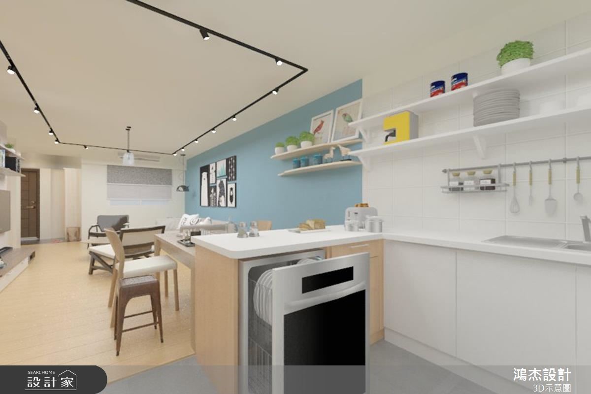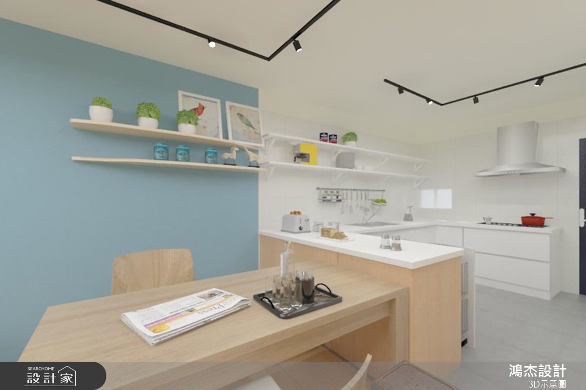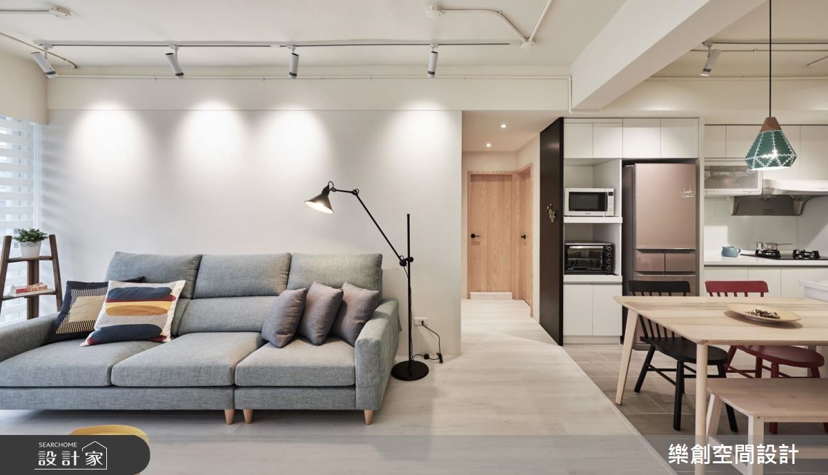 老屋以狭长屋型加上两侧房屋的包夹,造成采光不足而导致阴暗的窘况。巧遇住家进行下水道工程,藉此挪动后阳台墙面,且将房屋前后的外墙设置采光窗,让自然光源随之引入,并撷取北欧风改造,实现温馨宜人的室内宅居。 【错落隔板,满足机能与美感】入门后的玄关区,以系统柜打造木纹质感的鞋柜,柜体中央结合微型展示空间,再搭配嵌灯的间接照明,酝酿简约明亮的北欧风序曲。柔和的原木质感铺叙整体地坪,白、蓝、大地色系妆点领域,形塑干净清爽的室内氛围。无刻意装修的天花板,利用铁件质感的轨道灯贯穿公领域,壁面上结合隔板与开放柜体的设计,可依心情替换对象,随心所欲诠释日常的美学风格。轻薄壁面成为电视主体墙,结合展示收纳机能,满足实用需求更丰富立面设计。沙发背墙以粉蓝色粉饰,挑选几幅挂画,加上风格抱枕的配搭手法,替简单空间赋予视觉层次。开放的餐厨领域里,餐桌与中岛以L型摆设,导引出行走动线,壁面则利用隔板串连两者领域,满足机能与美感需求。