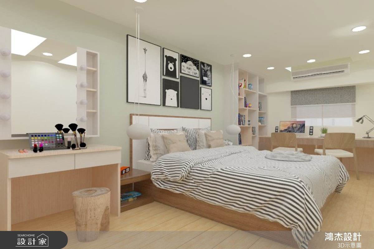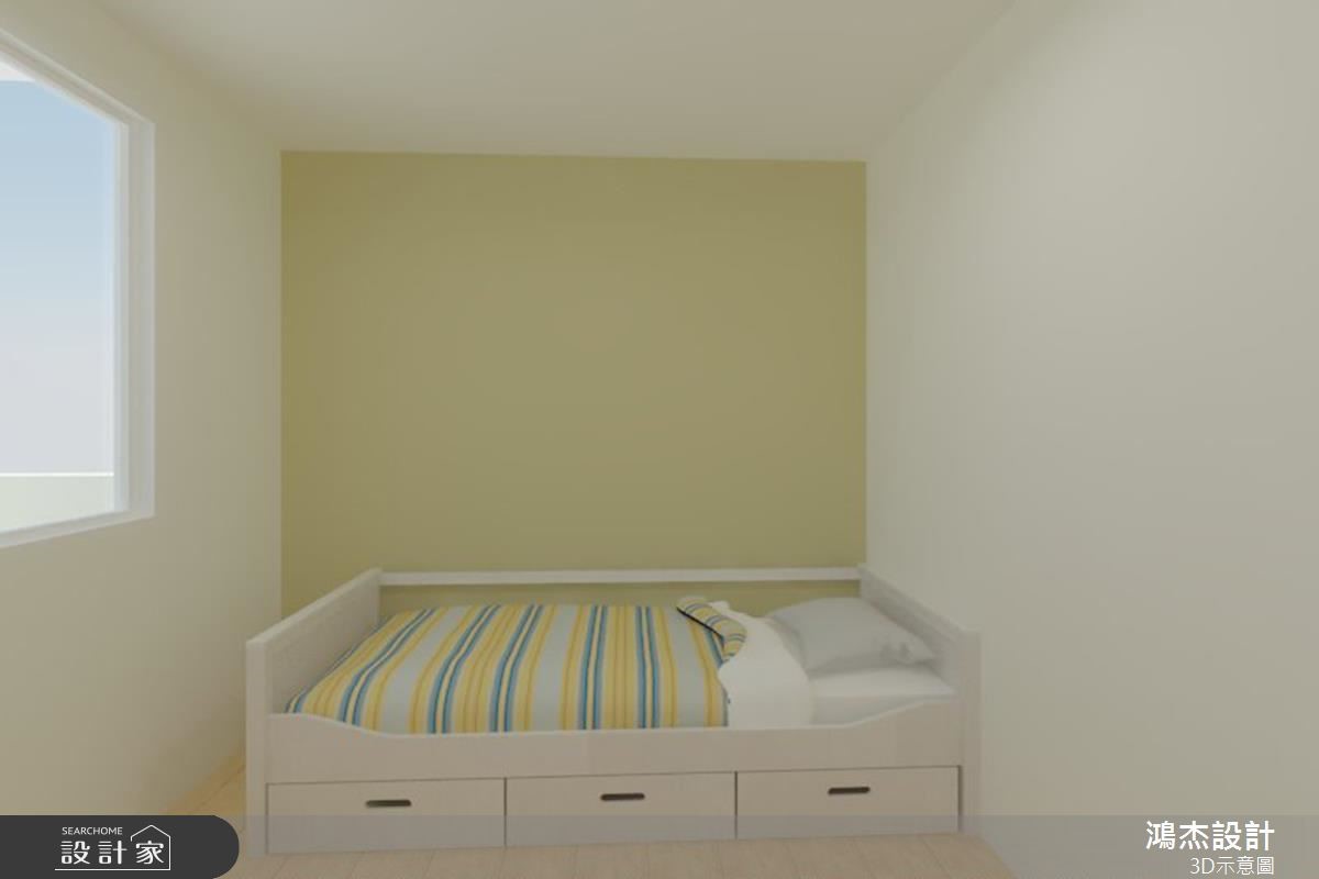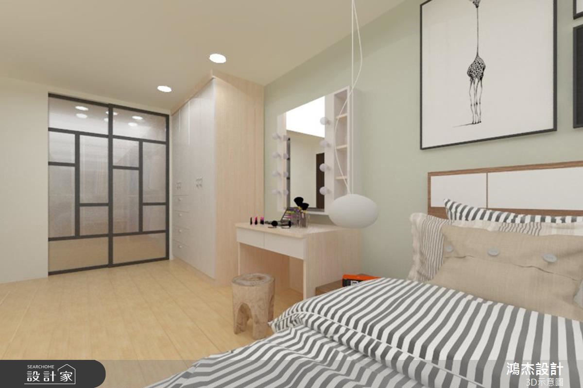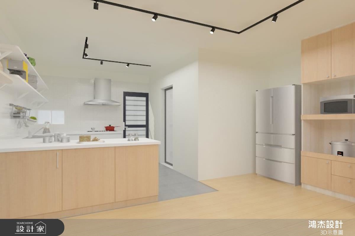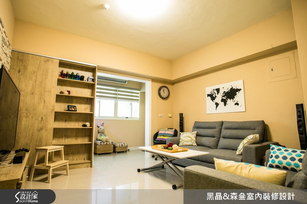 老屋以狭长屋型加上两侧房屋的包夹,造成采光不足而导致阴暗的窘况。巧遇住家进行下水道工程,藉此挪动后阳台墙面,且将房屋前后的外墙设置采光窗,让自然光源随之引入,并撷取北欧风改造,实现温馨宜人的室内宅居。 【错落隔板,满足机能与美感】入门后的玄关区,以系统柜打造木纹质感的鞋柜,柜体中央结合微型展示空间,再搭配嵌灯的间接照明,酝酿简约明亮的北欧风序曲。柔和的原木质感铺叙整体地坪,白、蓝、大地色系妆点领域,形塑干净清爽的室内氛围。无刻意装修的天花板,利用铁件质感的轨道灯贯穿公领域,壁面上结合隔板与开放柜体的设计,可依心情替换对象,随心所欲诠释日常的美学风格。轻薄壁面成为电视主体墙,结合展示收纳机能,满足实用需求更丰富立面设计。沙发背墙以粉蓝色粉饰,挑选几幅挂画,加上风格抱枕的配搭手法,替简单空间赋予视觉层次。开放的餐厨领域里,餐桌与中岛以L型摆设,导引出行走动线,壁面则利用隔板串连两者领域,满足机能与美感需求。
