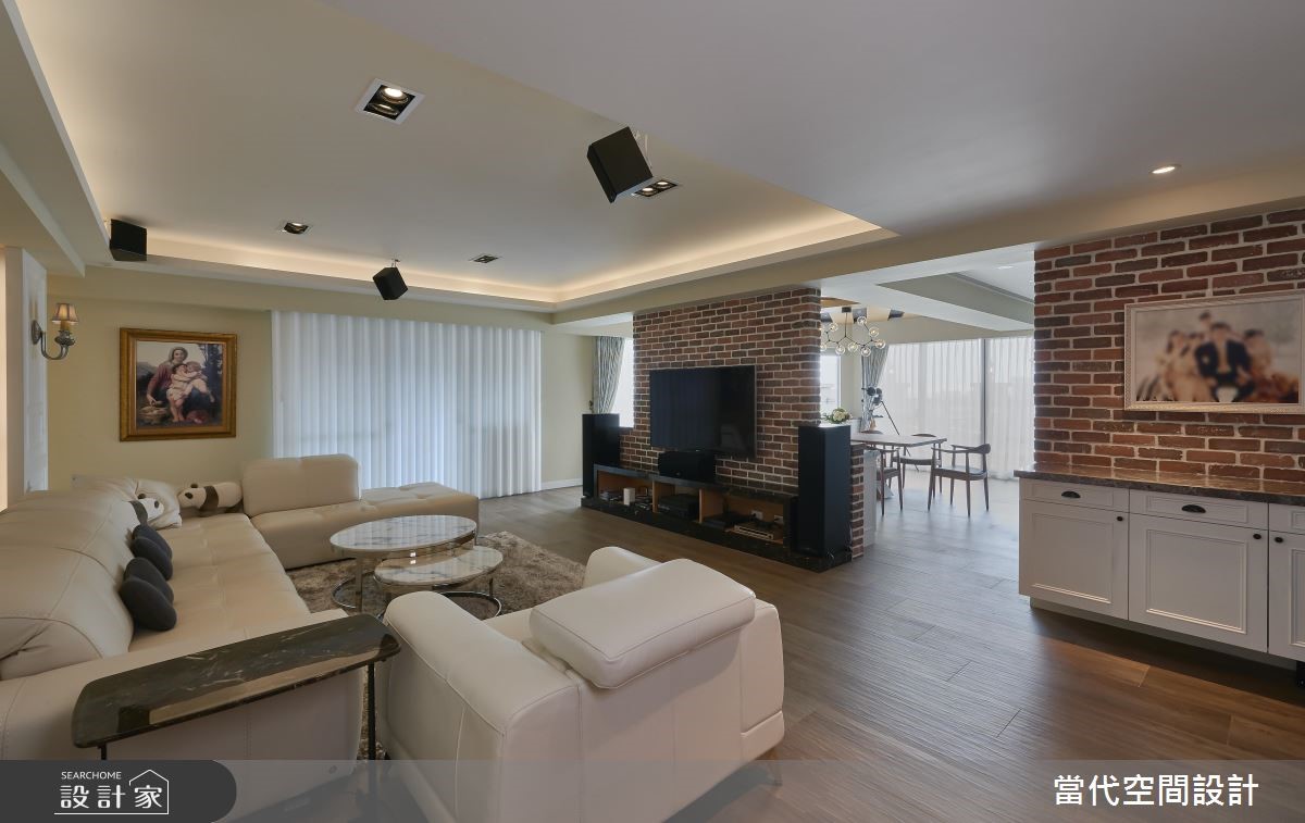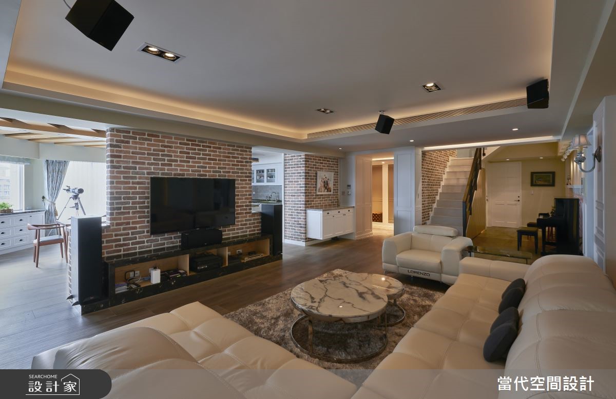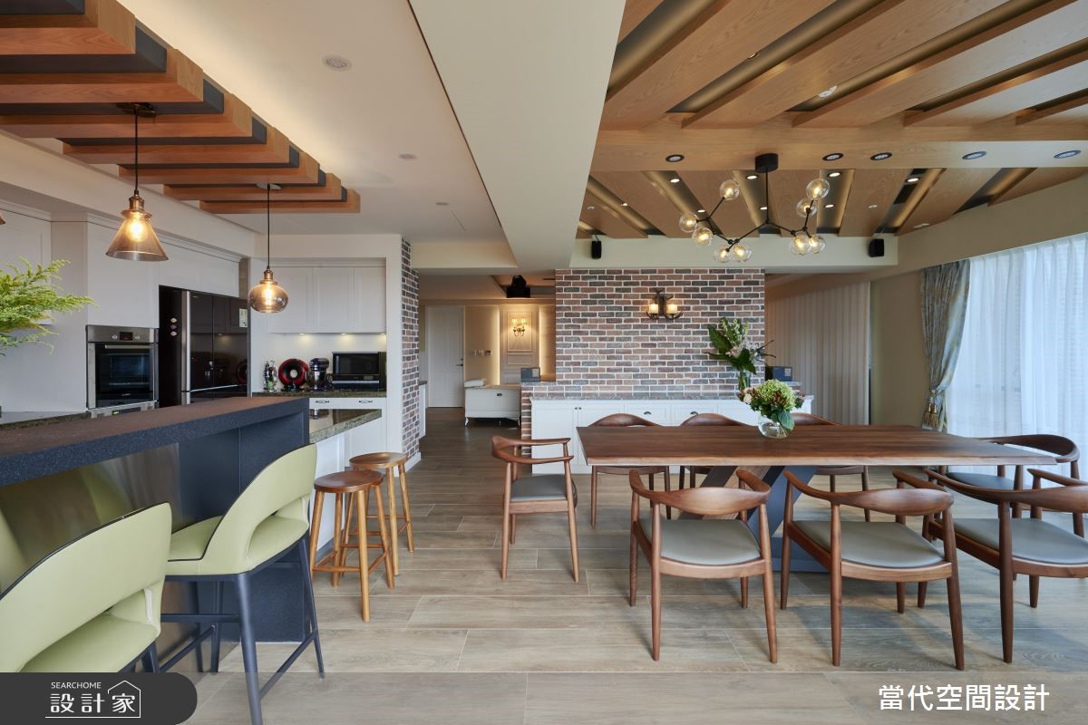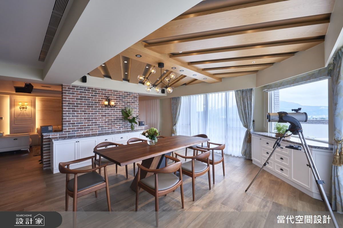原是二手房的复式楼,在经由设计师的巧思重塑,挹注美式风加以改造后,不仅让室内每个场域都精彩,更搭配日夜皆美的户外景致,让住宅也能坐拥景观餐厅般的美丽视野!【回字型设计打造自由生活动线】公共空间以不做满的电视墙取代实墙,串联客厅、餐厨区,创造回字型自由动线,并在墙面复古红砖的砌筑下,形成与窗外蓝天的趣味对比,天花造型亦充满着界定意味,于客厅采用利落框架、用餐区则选用木作铺叙,缔造二者之间的不同氛围。主卧融入细腻的美式新古典韵味,藉由壁纸凝聚立面质感,搭佐渐进式的起居动线,完善生活中的每个使用时刻;同时善用厅区楼梯上方的挑高地带,以独特的格局及位置,打造出休憩兼书房领域,并配置大容量的书墙,使空间犹如国外图书馆般美轮美奂!