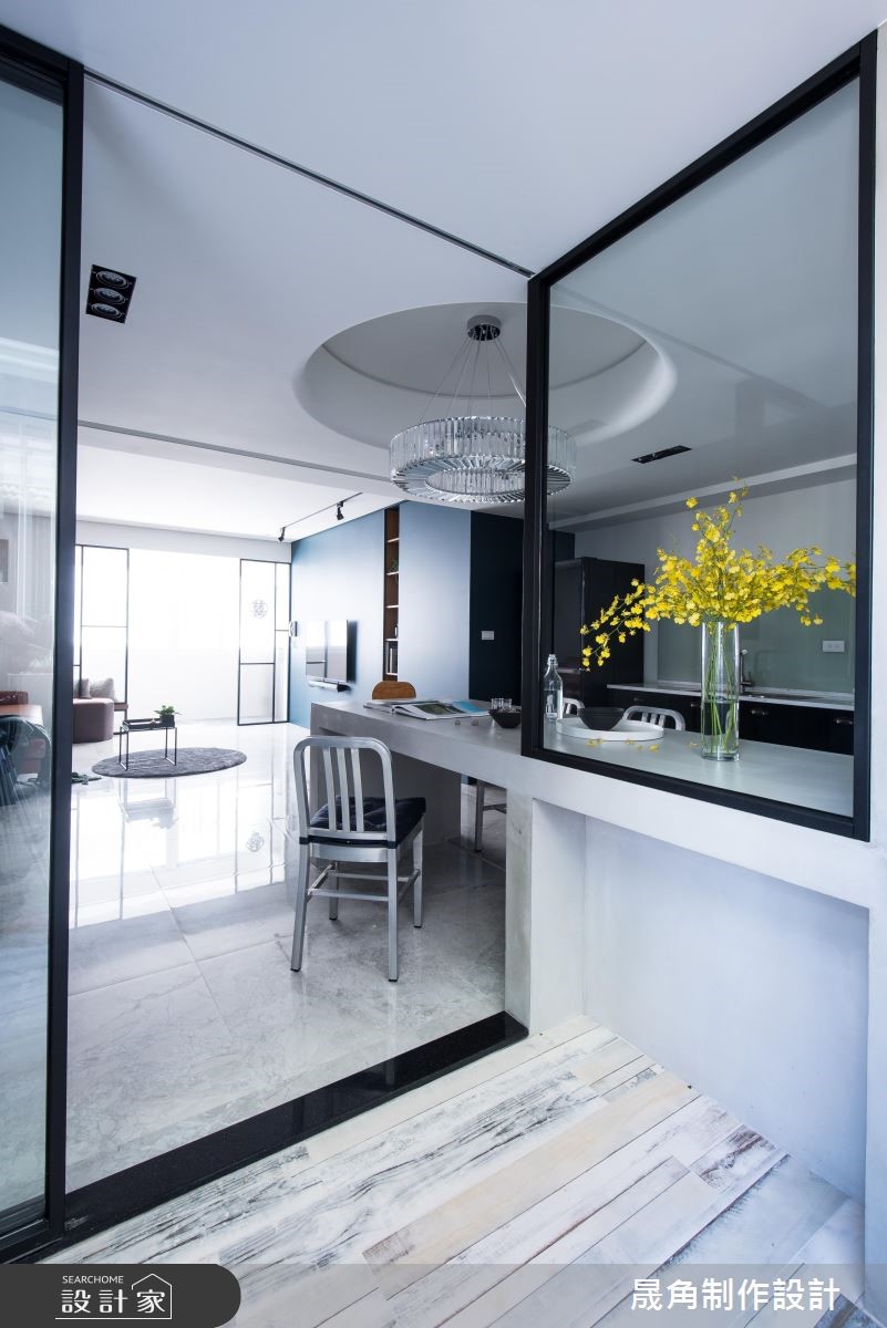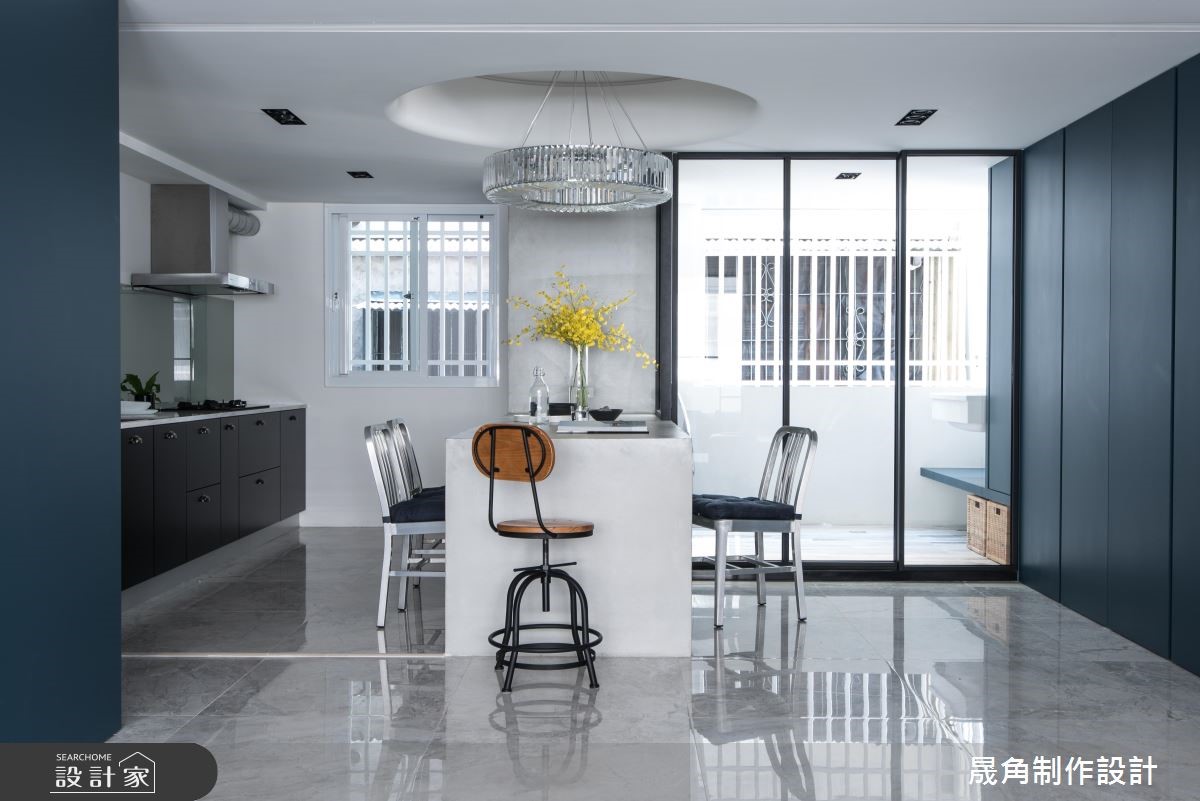 屋龄超过25年的二手房,设计师透过现代风格的重整,藉由通透隔断的处理,将餐厅、阳台与厅区加以串联,为室内注入明亮的采光效果,再搭配深蓝及浅白的对比交织,营造出年轻时尚的生活氛围。【清玻璃隔断,迎接自然日光】设计师藉由铁件、清玻璃搭构的界定隔断,将客厅领域瞬间外扩,不仅拉阔空间视野,更增添了格局层次;餐厨旁也运用相同建材,串起用餐区域与后方阳台的关系,让公共空间的采光、空气得以串联,达成光线引渡的效果。室内风格以白色为底,搭上深蓝色点缀,呈现令人惊艳的色彩张力,再搭配充满复古情怀的沙发座椅以及趣味挂画,构成赏心悦目的风景。而主卧内,引用简约建材,透过天然感的木作、壁材,与柔和光氛等,让空间显得简单舒适,营造舒适自在的私领域情境!