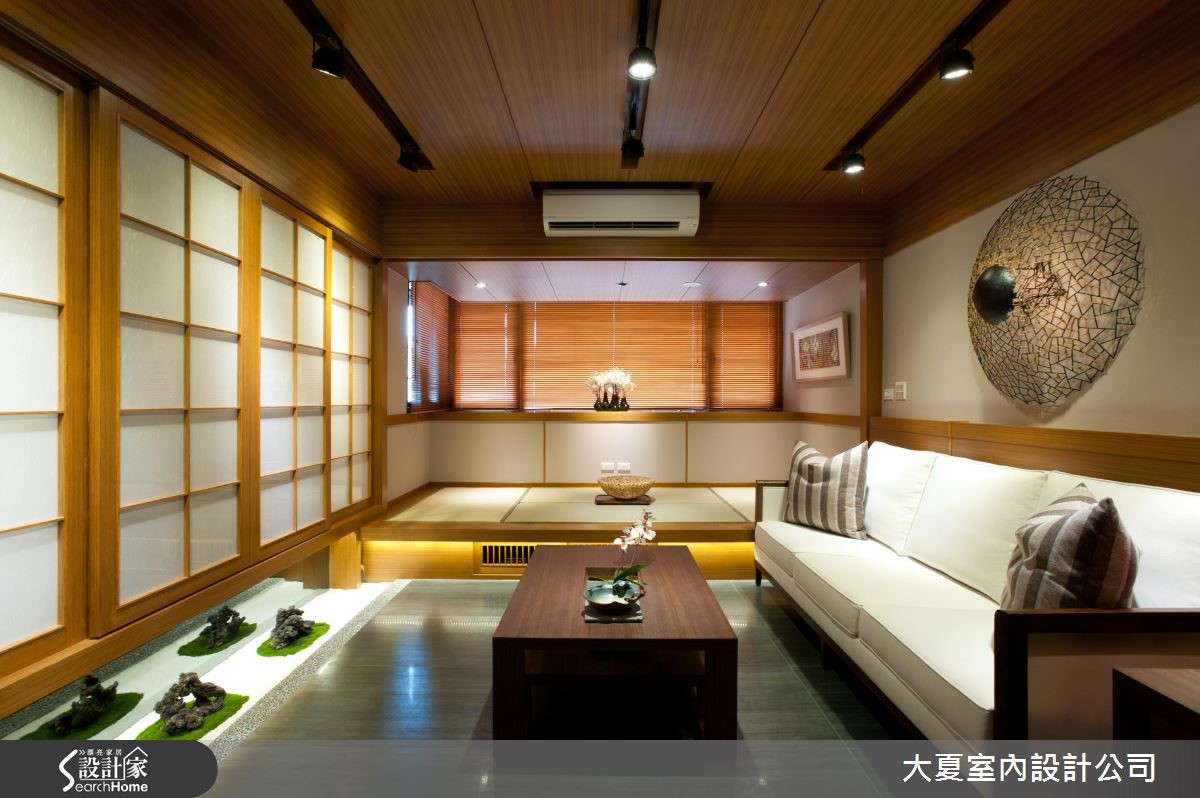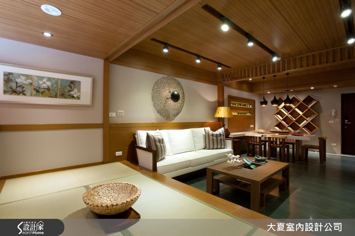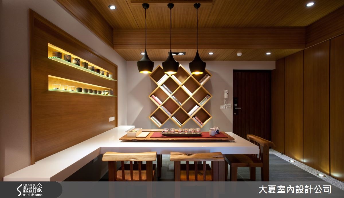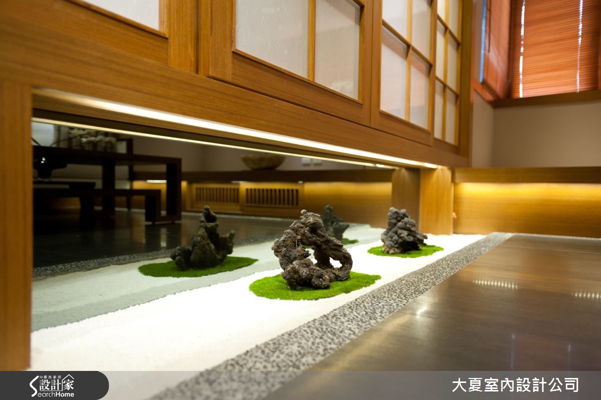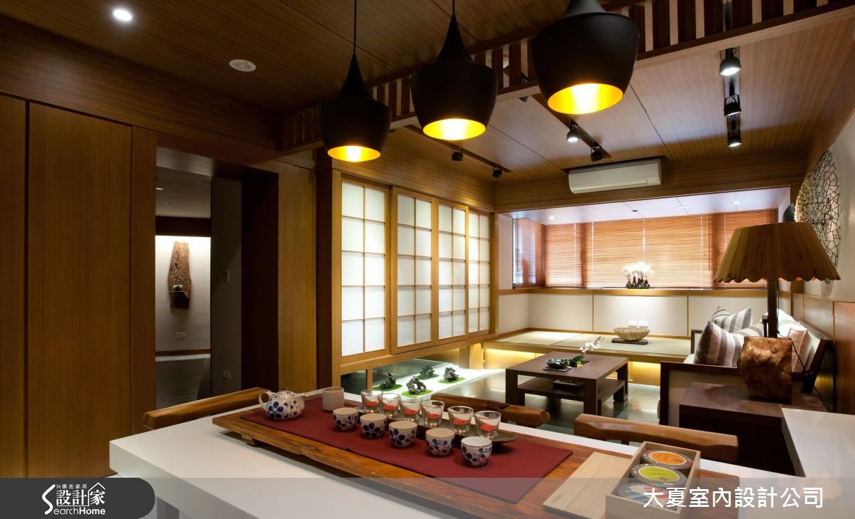 藉由大量的木纹质材,晕黄意境的内嵌光源,加上榻榻米、格栅与茶具展示的和风元素,调和出安定、静谧的禅风雅居,满足一家三口向往的日系风雅生活。【注入木石材质,流露淡雅恬静】推开大门入室后,沿着地面以抿石子铺陈的走道直抵电视墙,沉浸在幽静的日系氛围里。架高的木作拉门下方,让白卵石、人工草皮与奇石创造出一幅雅致的干景设计,与茶几上的莲花意象相互呼应。上方的日式格子门则利用四片内嵌云龙纸衬底,隐约的视觉呈现让人想一窥门后的景致,将拉门敞开后,原来为电视墙设计;沙发背墙以巨型的网状壁灯点缀,替客厅空间聚焦。餐厅空间洋溢着人文艺术的氛围,以白色人造石特制一张T型长餐桌,茶壶器皿摆设于桌面。壁面则利用两排镂空造型,搭佐嵌灯设计,将屋主收藏的茶具陈列其中。另一侧则嵌入菱格状的木纹书柜,随著书籍不同角度的摆放,创造出富层次的美学生活。