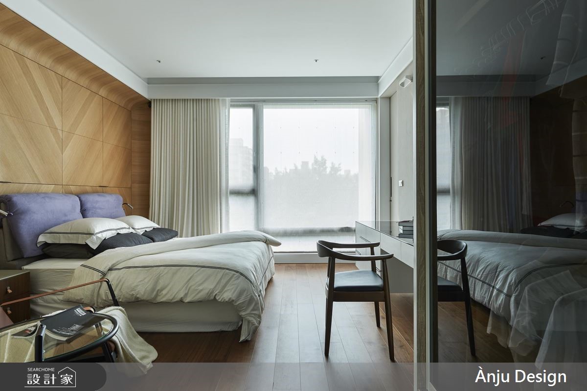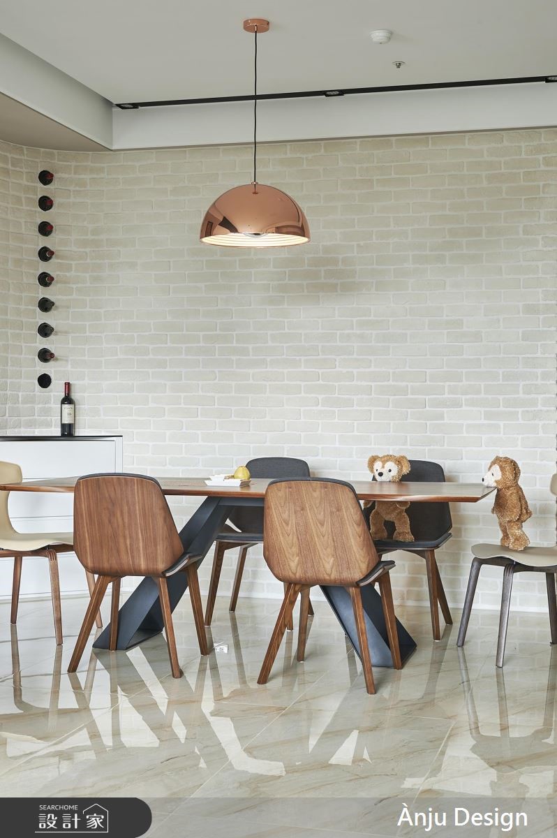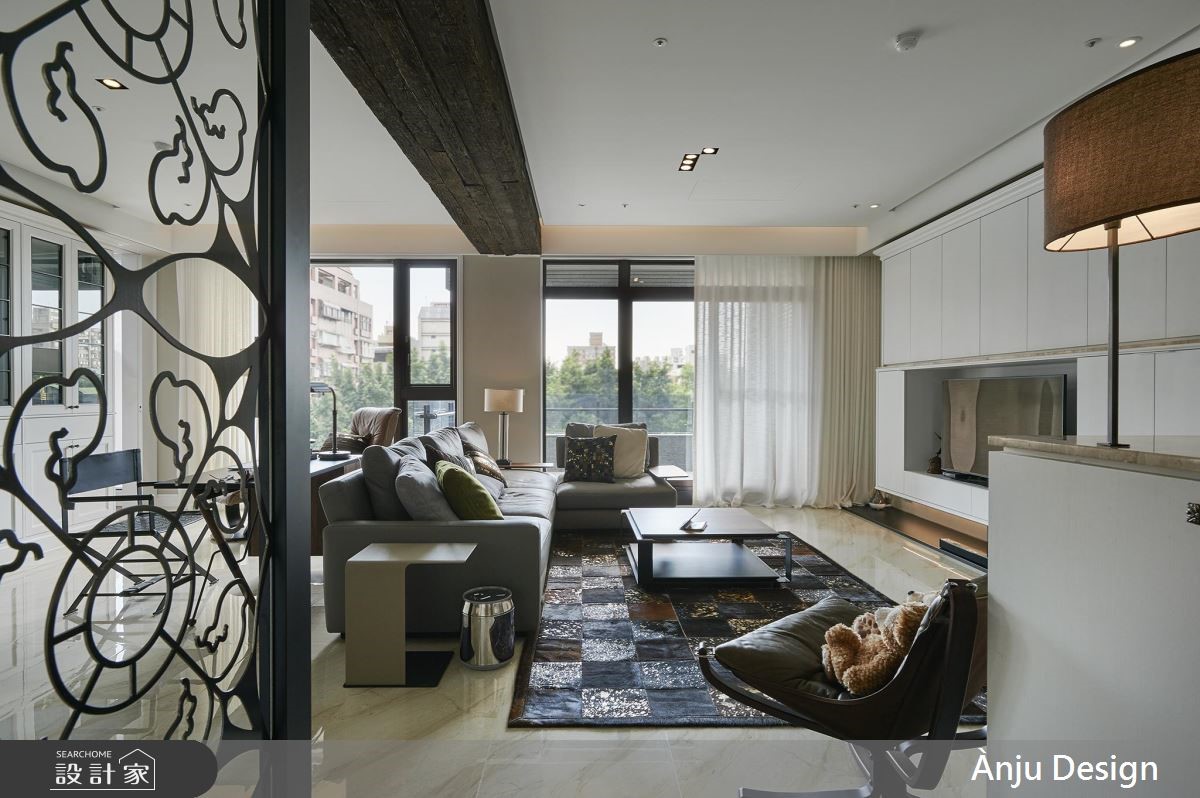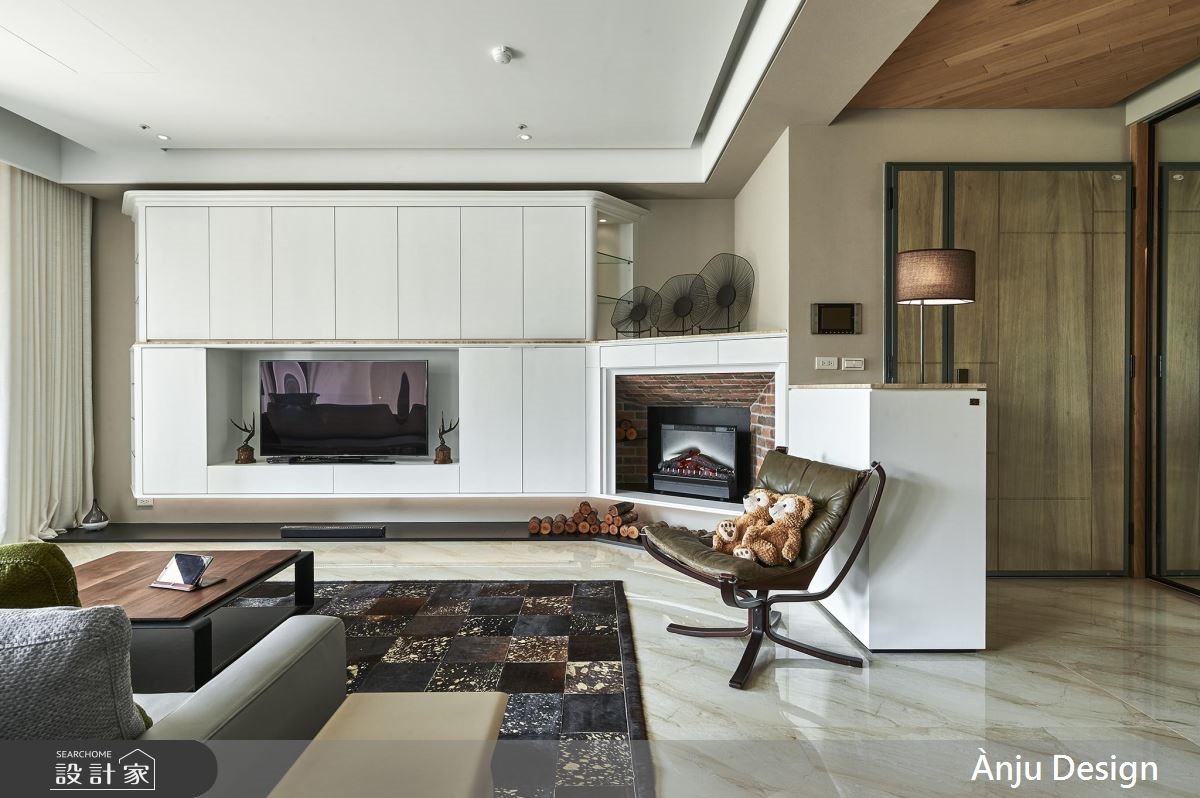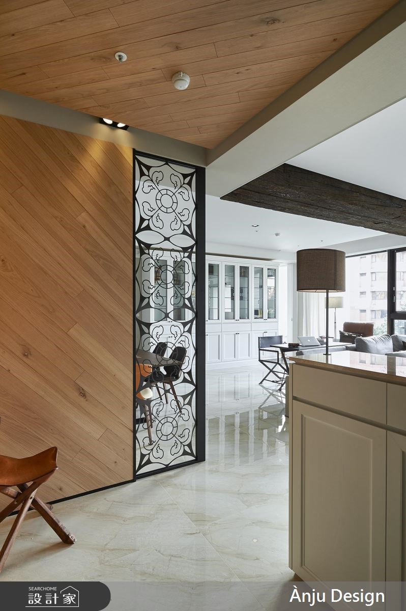 明亮、舒适,也具有现代时尚感的139平方米美式风住宅,设计师以开放式设计串连户外窗景,让生活空间更加宽敞、清爽,并揉合自然木质的温朴,以及美式线板的典雅细致,打造优雅又时尚的美式生活情境。【温润木质调和,打造温馨居家】玄关处便引植了自然木皮的温润色彩,从进门的那一刻起,就能感受到质朴的自然气息;走进公共领域,宽广的空间中结合客厅、餐厅、书房等机能性,天花横梁改变常见的隐藏式设计,在表面覆上粗犷木质,以材质巧妙地与玄关相互呼应,洋溢着浓郁的原木况味。餐厅处则在玄关的雕花屏风后,向内延伸一面米色文化石墙,成为颇具人文感的用餐端景,并在转角处特制了置酒架和柜体,满足生活中的收纳需求;主卧室则藉由木质的自然温和感,在床头处作出大幅造型墙,边缘处以弧线修饰,有效弱化了梁柱的存在感。
