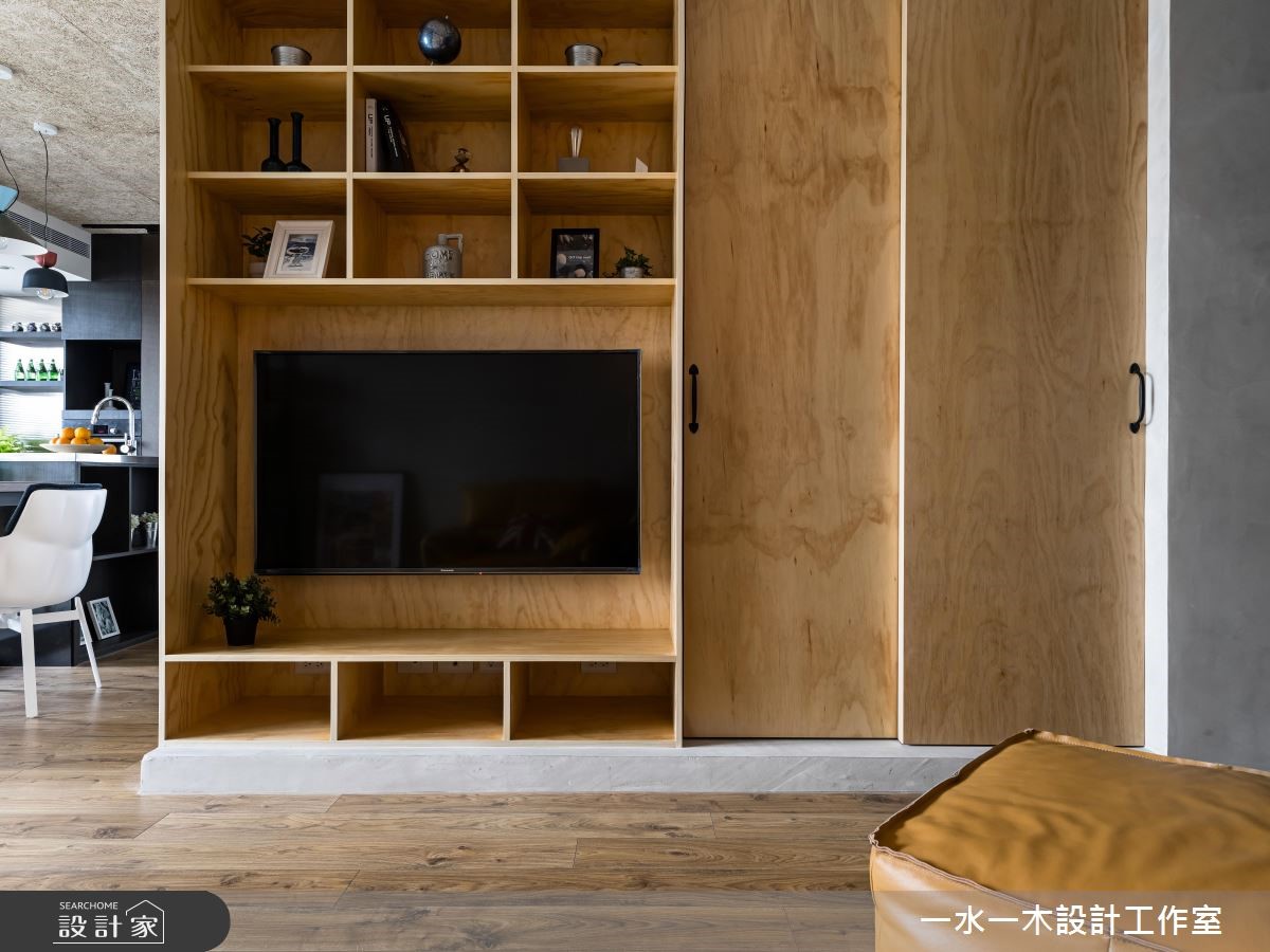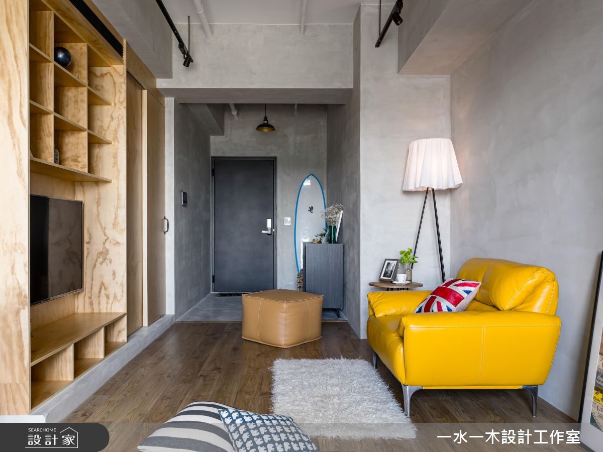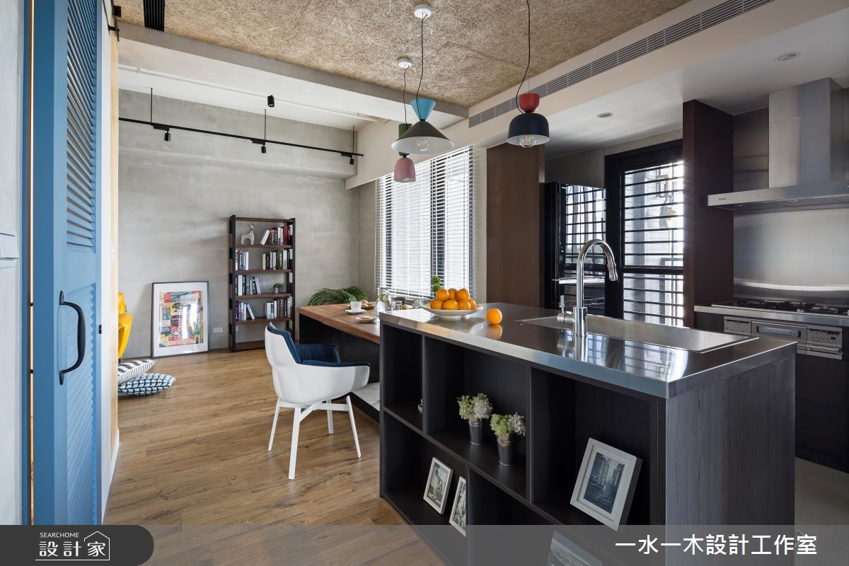 小夫妻带着新生儿想在新家展开生活,但是62平住宅却是特殊的L型格局,使空间更难利用。设计团队从无到有重新规划,顺应格局为一家三口打造宽敞公领域,甚至拥有专业大厨房!【缤纷家具点缀,空间更有活力】设计师重新调整格局,顺应采光配置客厅范围,并沿梁下设置电视柜,避免产生畸零空间。餐厨中间以吧台结合餐桌,创造多维用度,并将厨房延窗设置,烹饪时光佐以明丽窗景。全室以开放式设计串连客厅与餐厨空间,形成L型动线。由于屋主偏好工业风格,因此不做吊顶,裸露管线并涂白,搭配铁艺轨道灯,型塑黑白对比的视觉。而客厅背墙则采用水泥粉光,呈现工业风的粗犷特质。同时家具选用樱草黄的单人沙发、蓝色编织坐墩;餐厅则以马卡龙色的北欧吊灯点缀,为工业居家注入缤纷活力。