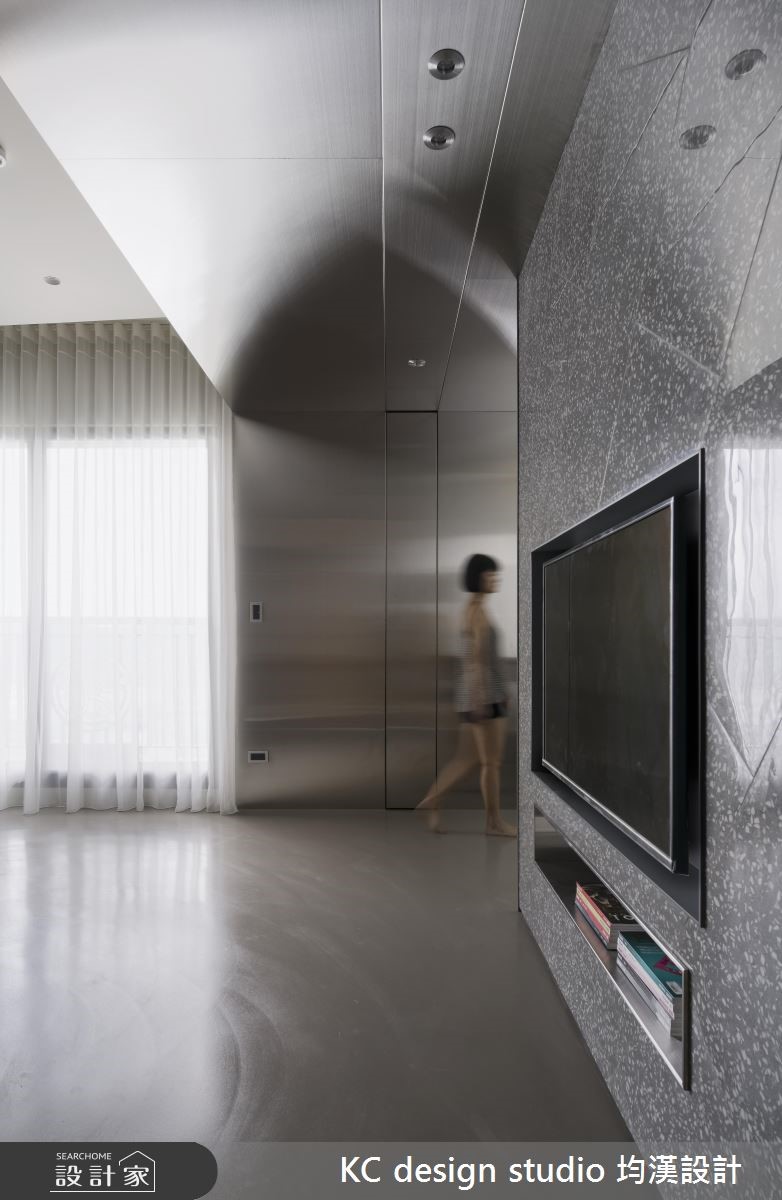 因为喜欢台湾,进而在台湾购屋置产,对来自香港的屋主来说,回到这个73平米的家,就是好好享受度假时光。【简朴灰质材的反璞归真】热爱简约现代风格的屋主,将房子委托均汉设计进行规划,设计师以色调、纹理浓烈的胡桃木以及水泥、盘多魔(PANDOMO)的简朴灰质为主,搭配不锈钢金属、玻璃等异材质,打造出极具时尚与舒适感的生活空间。 【水泥与木质的冷暖混搭】走进空间便有设计酒店般的时尚和舒适度,偏冷的水泥色调和具有温润暖度的胡桃木,形成恰到好处的冷暖比例。电视主墙利用磨石子磁砖,在水泥质感中揉合了自然石质的感受,并与天花处的大型不锈钢框架、盘多魔地板相互呼应,透过不同材质展现灰色调的丰富层次。【恰当好留白的度假心情】具有浓郁木纹和节点的胡桃木门片,隐纳了丰富的收纳量,其间也加入特制的黑色铁网层架,为温润的木质添注个性感,并可随着居住者的需求,随心所欲地调整上下高度和间距。卧室则将墙面留白,辅以简约的木质桌面造型,营造卧室的简洁和舒适感。