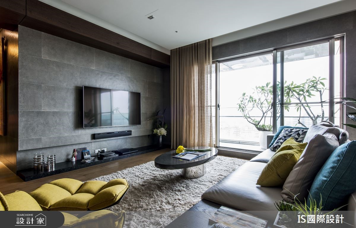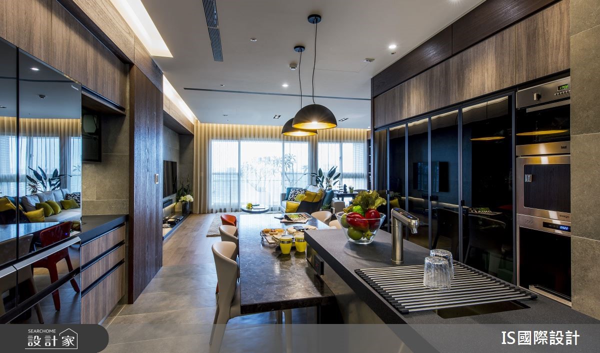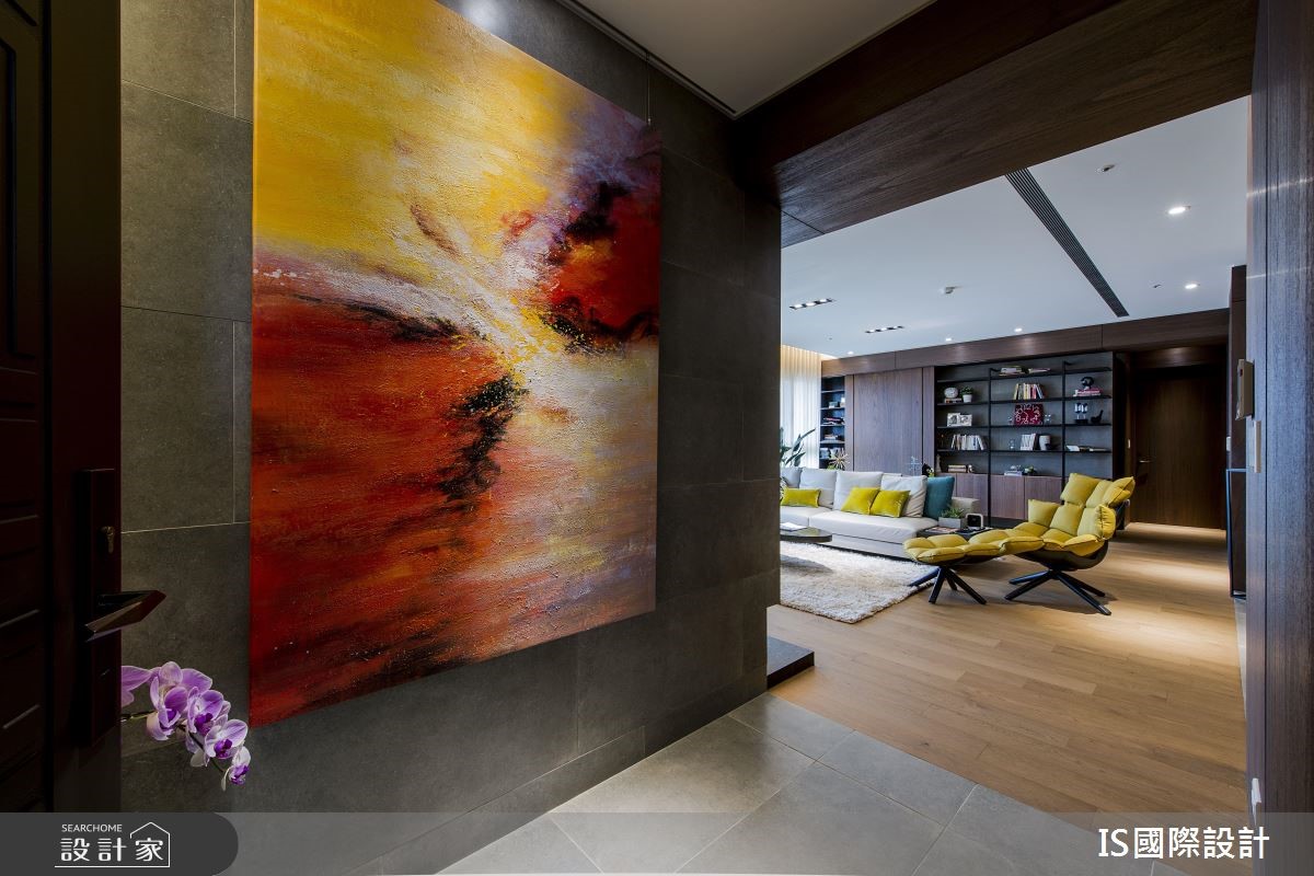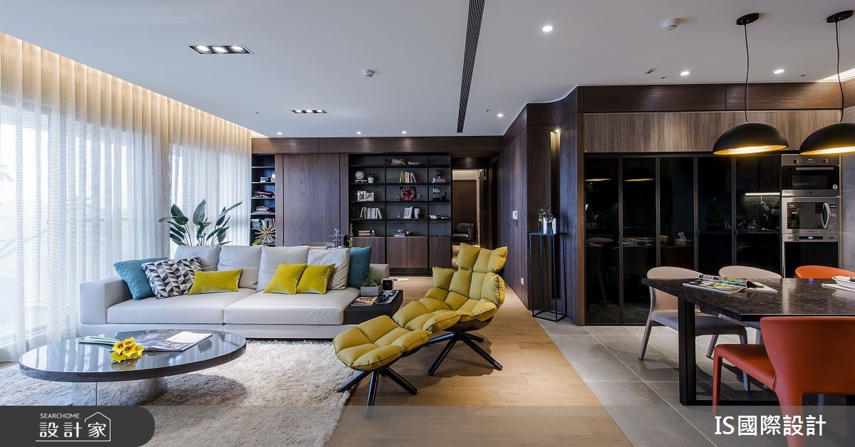 撷取深色木纹与石材的元素,调和出沉稳、静谧的自然住宅。随着窗外光氛的流泄,伴随枝叶绿意的引入,交织出惬意的生活态度,又不失大器的空间氛围。 【撞色设计,空间更显活力】迎宾玄关处,一大幅斑斓用色的艺术画作静置在石材墙面,彰显鲜明色彩。开放的公领域里,藉由材质变化来转移空间主题。像是客厅以木纹地坪搭配石材电视墙,花卉绿植点缀其中,注入休闲自然的风格。并透过蓝黄跳色抱枕与座椅,提升视觉亮度。沙发后方形塑开放的书房领域,底墙以深色木纹打造风格书柜。并利用整面推拉门与展示层架为设计。而深色的原木质感横越廊道,持续延伸至餐厅领域,隐藏式把手的柜体,加上镜面材质的收纳设计,体现时尚俐落的现代风格。