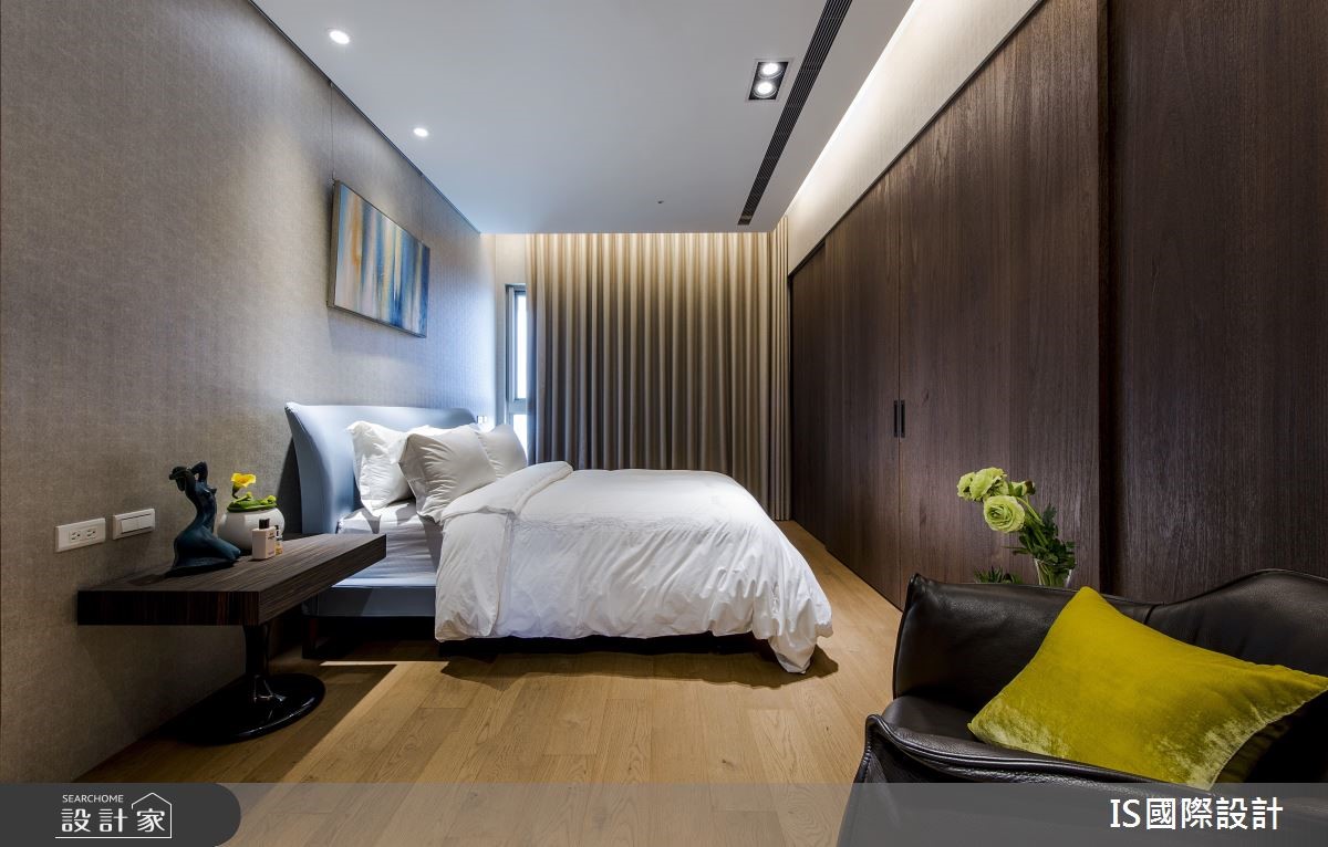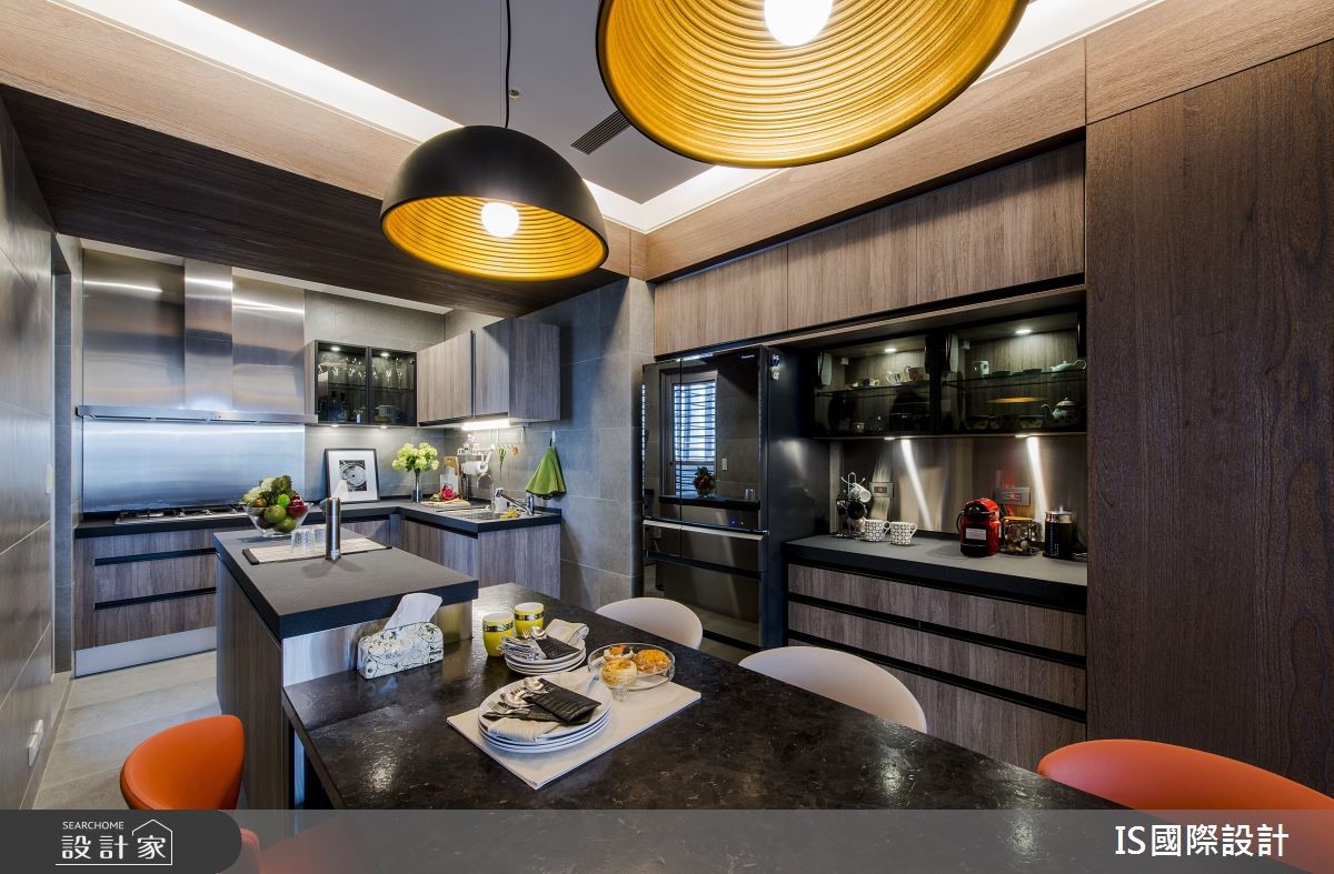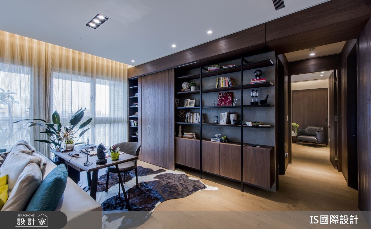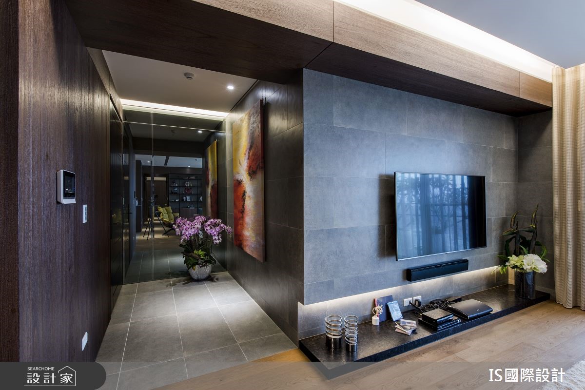 撷取深色木纹与石材的元素,调和出沉稳、静谧的自然住宅。随着窗外光氛的流泄,伴随枝叶绿意的引入,交织出惬意的生活态度,又不失大器的空间氛围。 【撞色设计,空间更显活力】迎宾玄关处,一大幅斑斓用色的艺术画作静置在石材墙面,彰显鲜明色彩。开放的公领域里,藉由材质变化来转移空间主题。像是客厅以木纹地坪搭配石材电视墙,花卉绿植点缀其中,注入休闲自然的风格。并透过蓝黄跳色抱枕与座椅,提升视觉亮度。沙发后方形塑开放的书房领域,底墙以深色木纹打造风格书柜。并利用整面推拉门与展示层架为设计。而深色的原木质感横越廊道,持续延伸至餐厅领域,隐藏式把手的柜体,加上镜面材质的收纳设计,体现时尚俐落的现代风格。