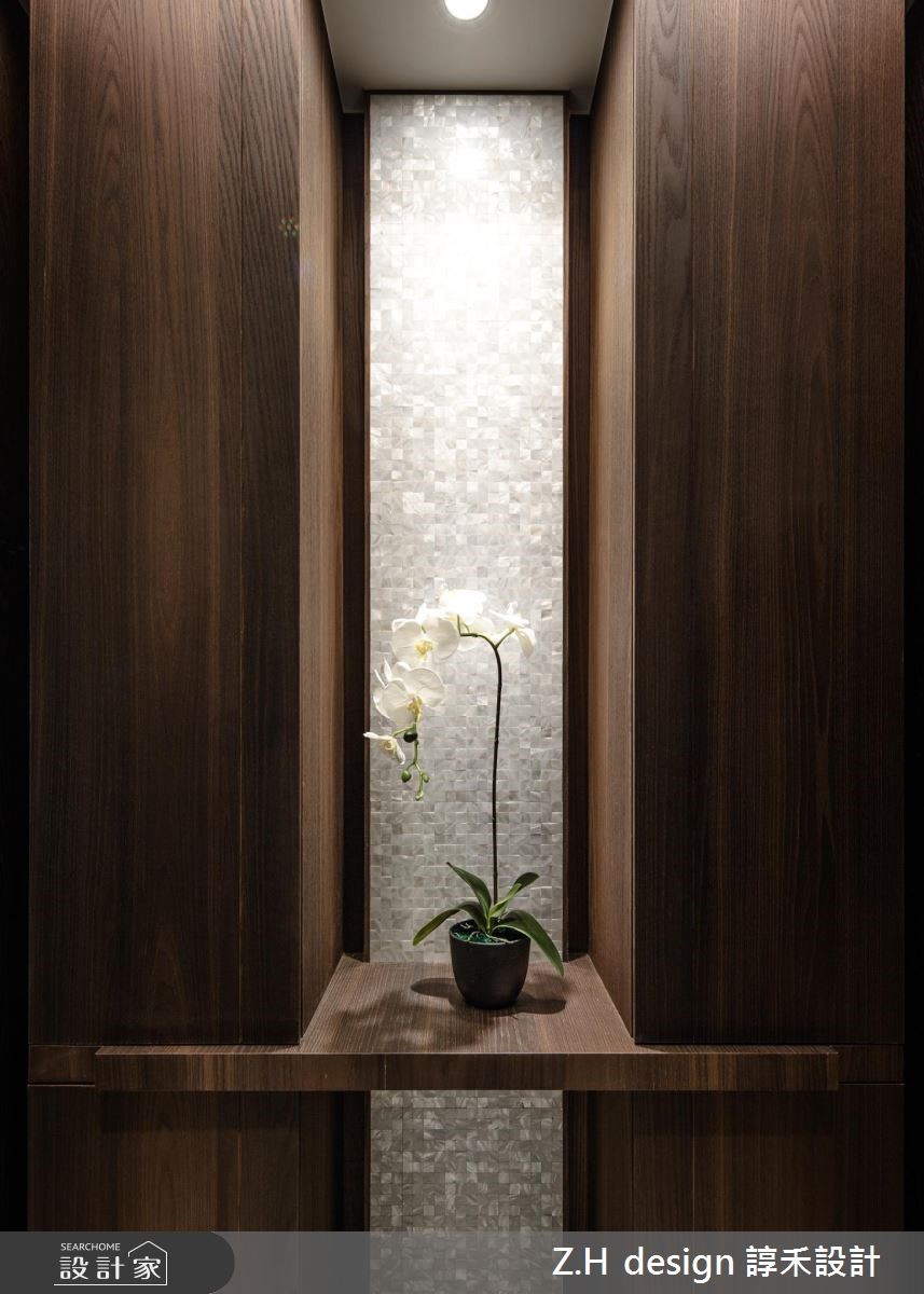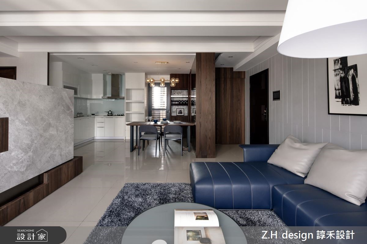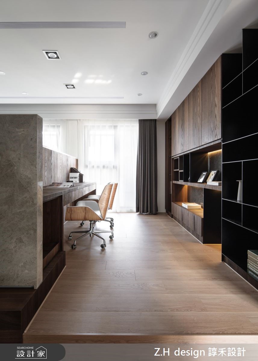 182平方米的现代风大宅,设计师打破封闭尺度,加入开放通透的开阔视野,除了增加室内采光,亦将机能动线回馈给使用者,透过低调却暗藏细节的设计手法,营造令人一再品味的细致居家。【矮墙隔断,保留视觉通透感】公共领域以开放式格局规划,藉由电视墙划分书房与客厅区域,采用细致的沟缝修饰与建材的天然纹理,营造内敛而精细的客厅空间;而书房则刻意架高地坪,以大面积木皮塑造温润感,并设计大小不一的格柜书墙,打造充满温度的阅读区。餐厅则承袭着木质肌理,同时以深色镜面墙妆点,既维持整体的沉稳色调,也促使空间感放大;主卧内,运用半高床头墙作为界定,保持睡眠区与开放更衣室的独立性与穿透性,除了提供充足收纳,一旁更结合梳妆台,将所需的机能统整,营造舒适的私领域空间。