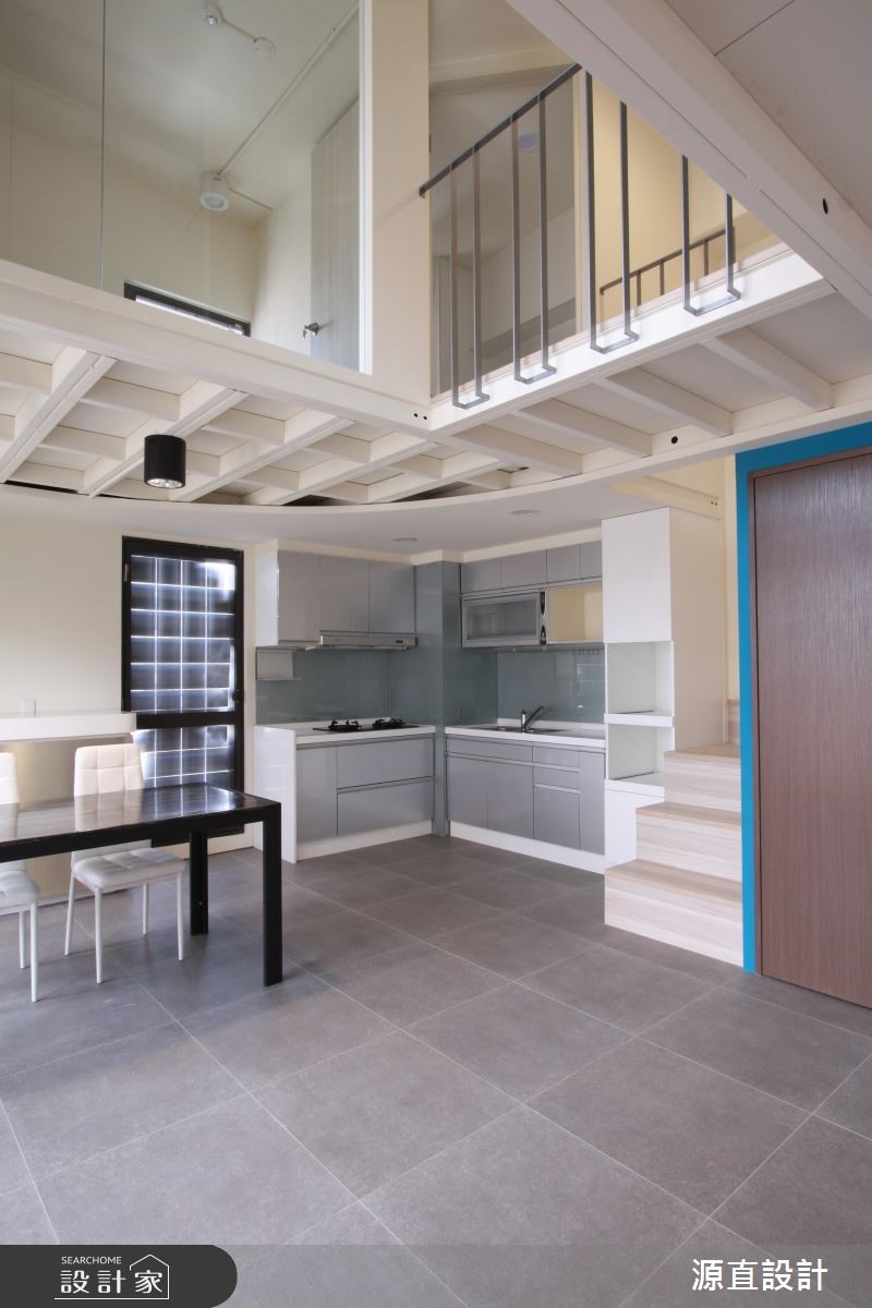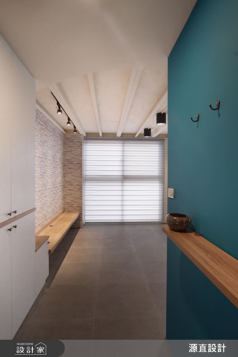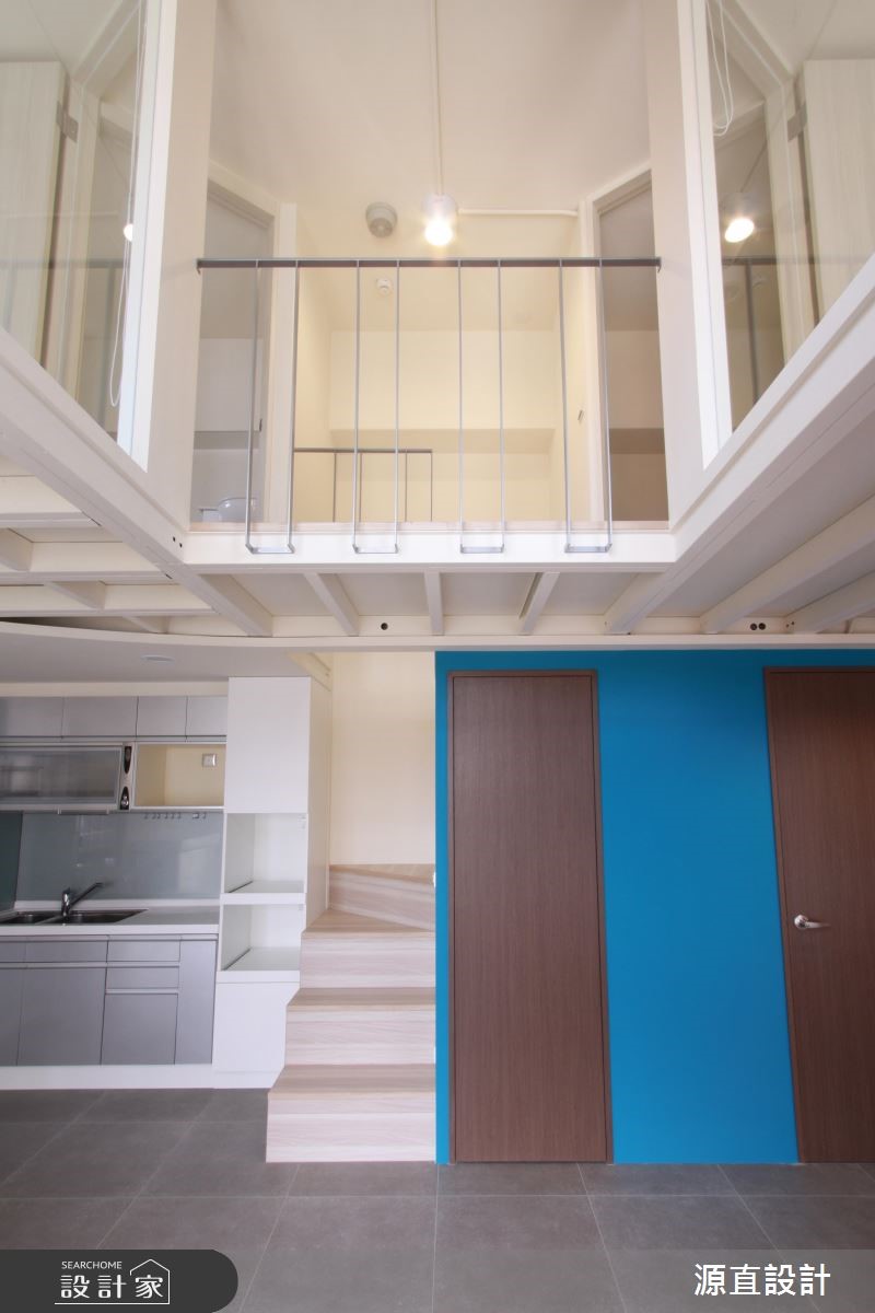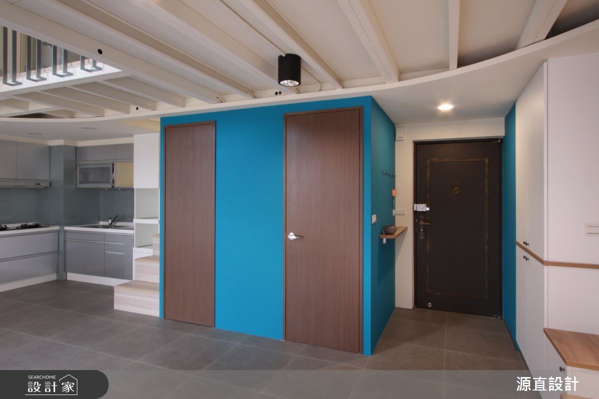 10年屋龄的99平方米复式楼,原为夫妻二人居住,后因小孩出生将格局重整翻新,并针对孩子的成长需求增加收纳机能,并增加一间儿童房及更衣室辅助,即使不换屋也能共享舒适生活。【跳色蓝墙,转换空间风格】空间以一面湛蓝色墙面做为开端,搭配隔板、衣帽挂勾、收纳鞋柜等,开启机能性十足的场景,并让此道蓝延伸导引入室,形成公领域的聚焦色彩。一楼客厅保有宽敞留白,给予孩子安心活动的空间,且在天花板作出线条架构,增添视觉上的活泼层次。二楼侧墙则加入清玻建材,搭配着围栏的穿透设计,不只兼具采光及活动安全性,也型塑出空中步道般的趣味视野。