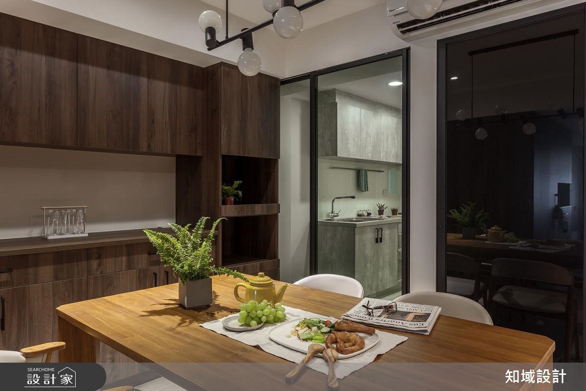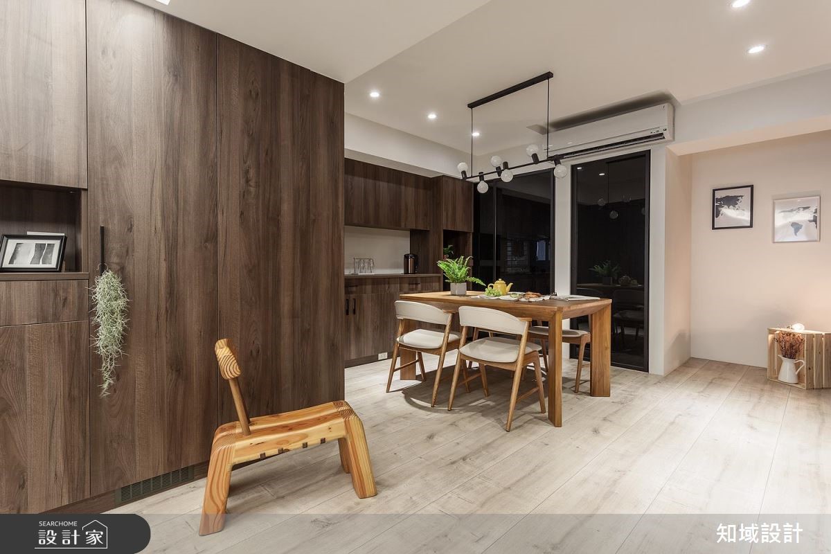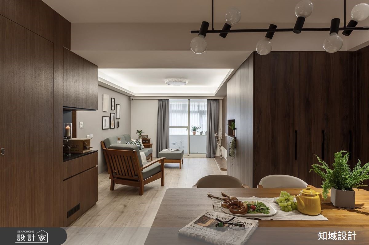 112平方米的老屋,设计师为让年迈双亲可坐拥更舒适生活,于是将空间加以改造,除了给予庞大的收纳机能,也藉由深色木皮包覆,凝聚温暖氛围,透过简约纾压的风格设计,打造老少咸宜的居家美感。【运用材质,创造和谐空间氛围】公共领域以深色木质作为主调,营造恬静安稳的氛围,于电视墙铺陈木皮背景,搭配细致沟缝处理,带出墙面的精致度,同时让玄关柜转折延伸,陆续接至餐厅领域,以超量的收纳柜开启机能实用性,而一贯的自然木纹,则让整体风格一致,注入安定人心的氛围。主卧则划分为三个区块,除了睡眠休寝功能,也额外区划出更衣间与独立梳妆室,并运用玻璃打造隔断,创造场域之间的视觉联系,并维持采光的流动,在保有实用机能之余,也网罗通透明亮的空间感。