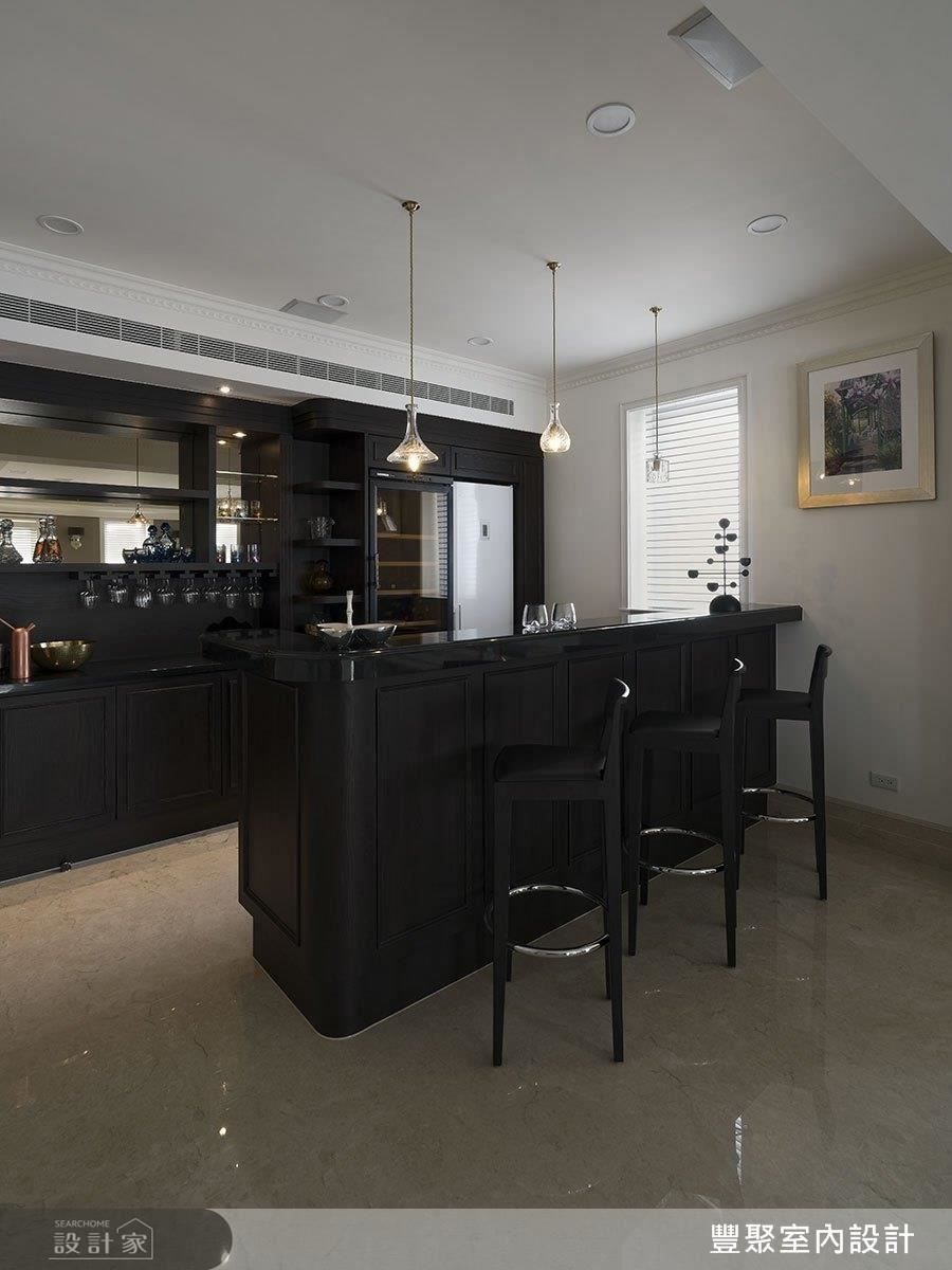 空间一角则规划为吧台区,以传统木作搭配橡木木皮染色,带出复古沉稳的老酒馆氛围,平日能够与家人一起小酌,感受生命中微醺的美好,假日也能邀请三五好友到家中,不仅带来便利的使用机能,又满足了男主人对家的梦想。