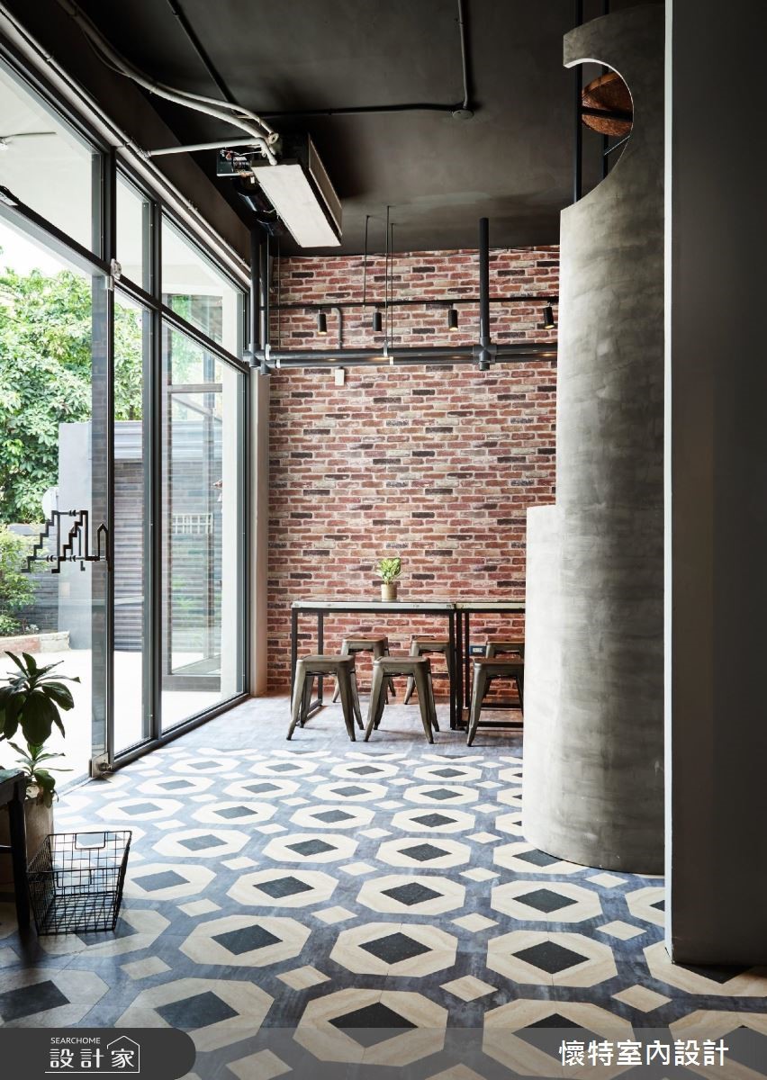 怀特设计将已歇业的早教中心改建成名为"小洋楼"的日式创意料理餐厅。外观由大面积玻璃与铁件组成,以工业仿旧风格交织绿意玻璃屋的特色,在热闹的街区成为新地标。 【玻璃外墙,让谷仓元素更灵巧】以米食为灵感,将谷仓概念贯穿本案;除了外观采用谷仓门片,收银台也利用水泥圆柱与筛篓注入富有谷仓意象的元素。针对截然不同的商业需求,在不影响结构安全的前提下,拆除过于细碎的隔断与开窗,以全开放式的玻璃屋框设餐厅周围,抹除内外界线。风格营造以去芜存菁的手法保留了白漆与红砖墙面,佐以乐土与红砖壁纸,搭配 塑胶管线、花砖以及木纹塑料与水泥地坪,彰显了工业风的复古与个性特色。