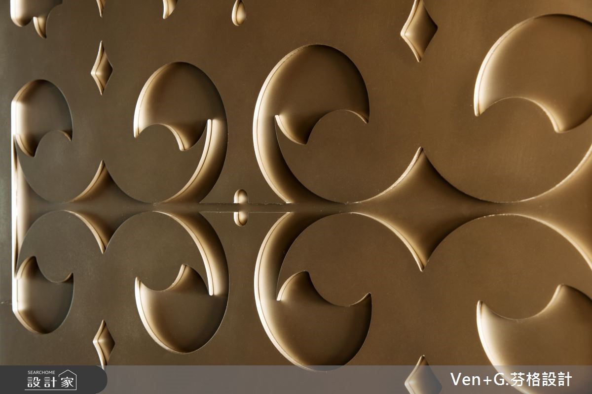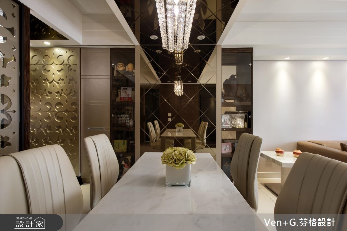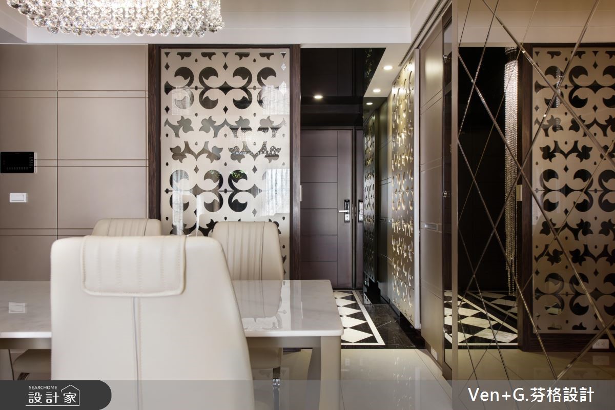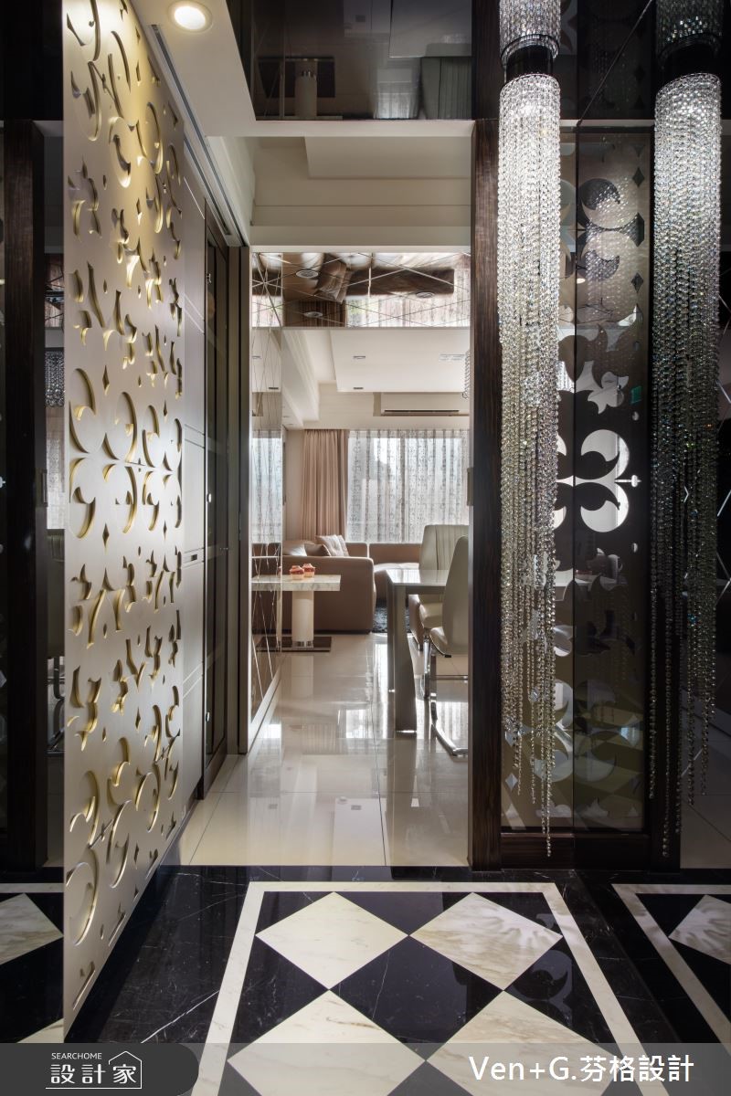 谁说奢华风格只能存于大宅邸,设计师在仅76平方米的空间里,延续原本的采光优势,透过金属喷漆、玻璃镜面以及水晶灯创造华美大器之姿,透亮的材质活用,替小格局空间创造放大、宽敞之意,令人惊艳不已。【善用材质,让空间双倍放大】玄关藉由右侧镜面让视觉感放大,并搭配水晶吊灯与金色系的立体镂空雕花作装饰,交织出微奢的美学序曲;开放式的公共领域,透过镂空蕾丝窗帘所洒入的自然光源,映照在大地色系石材铺设的电视墙上,调和满室优雅气韵,而大面积墙面也让视觉聚焦,更添壮阔气度。餐厅壁面以镂空雕花屏风延续华美风格,另一侧搭配菱格纹切割的茶玻质感,并向上延伸至天花板的大梁结构,营造放大室内情境的效果;主卧区,床头墙以绷布为底,两侧透过茶镜勾勒层次美感,电视墙则以全家的英文字母为代表,描绘立体造型墙,营造出典雅气息。