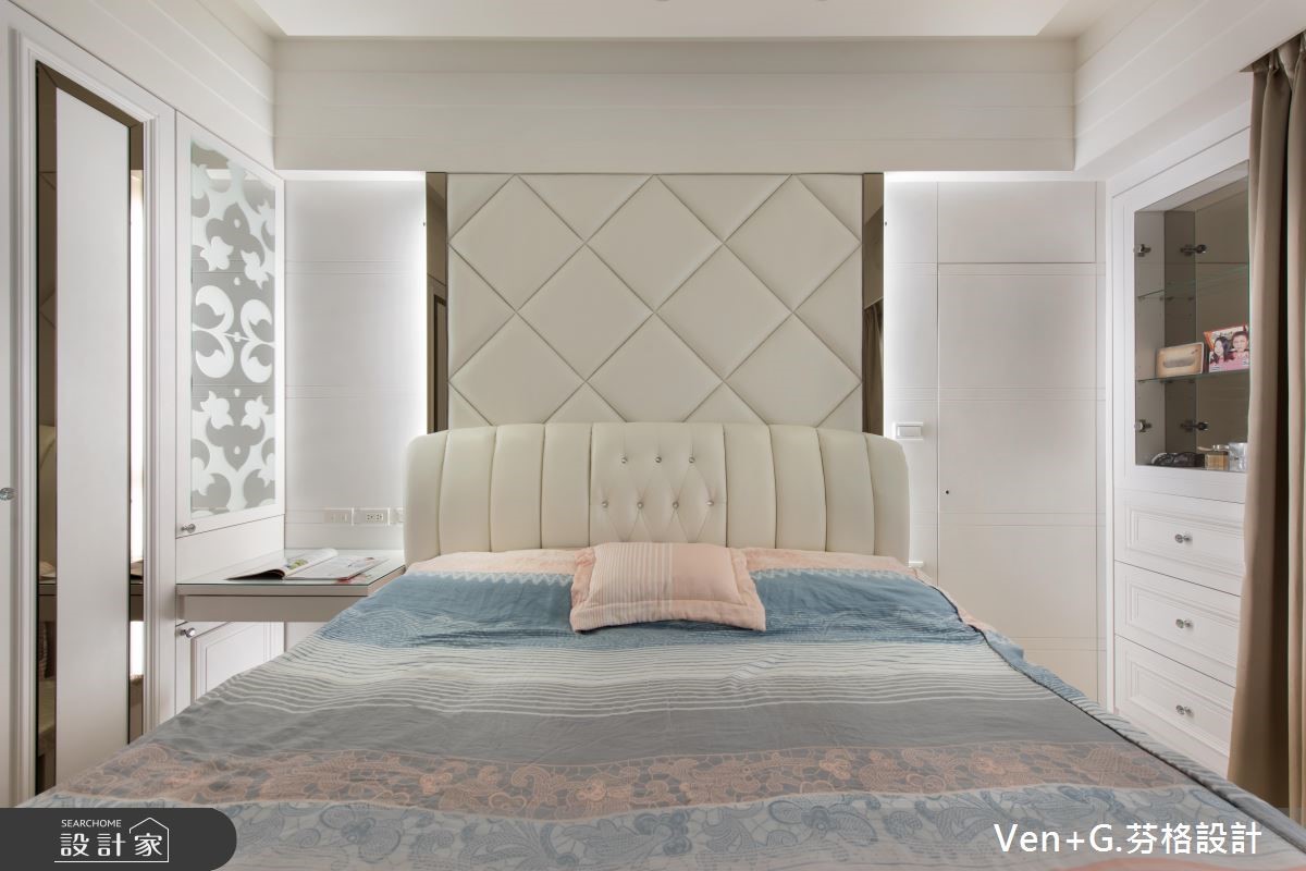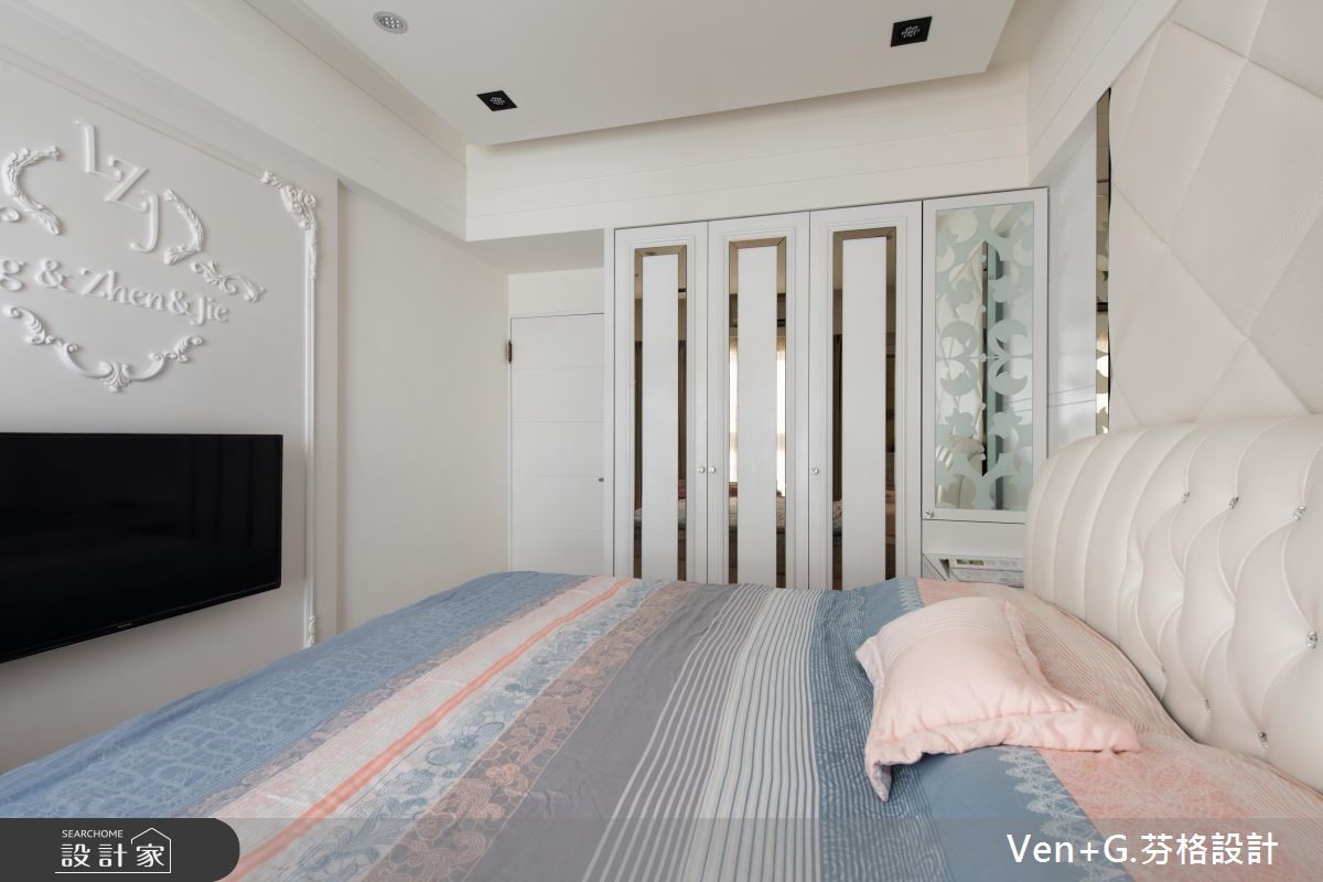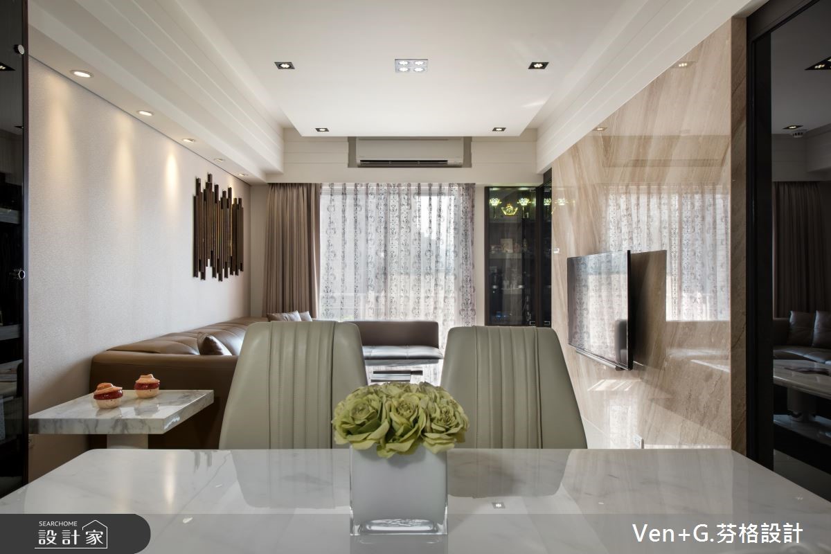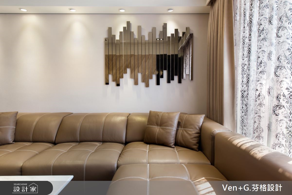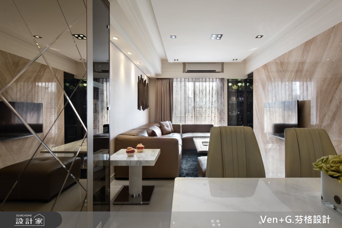谁说奢华风格只能存于大宅邸,设计师在仅76平方米的空间里,延续原本的采光优势,透过金属喷漆、玻璃镜面以及水晶灯创造华美大器之姿,透亮的材质活用,替小格局空间创造放大、宽敞之意,令人惊艳不已。【善用材质,让空间双倍放大】玄关藉由右侧镜面让视觉感放大,并搭配水晶吊灯与金色系的立体镂空雕花作装饰,交织出微奢的美学序曲;开放式的公共领域,透过镂空蕾丝窗帘所洒入的自然光源,映照在大地色系石材铺设的电视墙上,调和满室优雅气韵,而大面积墙面也让视觉聚焦,更添壮阔气度。餐厅壁面以镂空雕花屏风延续华美风格,另一侧搭配菱格纹切割的茶玻质感,并向上延伸至天花板的大梁结构,营造放大室内情境的效果;主卧区,床头墙以绷布为底,两侧透过茶镜勾勒层次美感,电视墙则以全家的英文字母为代表,描绘立体造型墙,营造出典雅气息。
