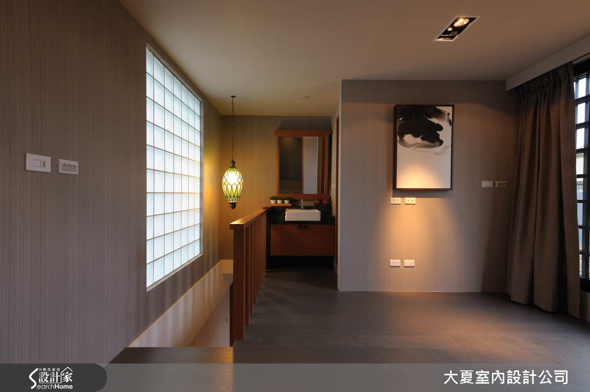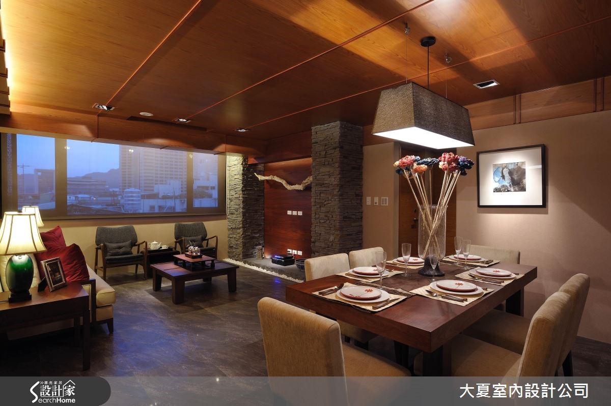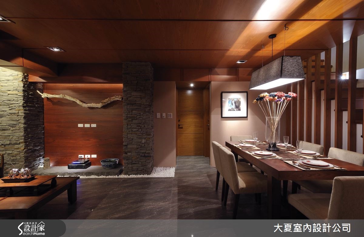 由于屋主偏好沉稳雅致的风格,因此引入日系禅风的特色,藉由自然的元素铺陈空间,深色调的石材和木质堆叠,搭佐间接照明的投射,形塑沉稳、幽静的禅风美学。【深色基底,造沉稳氛围】玄关运用玄黑石板铺陈地面,周围衬以白色卵石,传递枯山水的自然意象;右侧则以悬空的柚木鞋柜摆设,下方搭配嵌灯,伴随光源映照在柜体上,营造出内敛且诗意般的风格景致。公共空间里藉由深灰雾面抛光砖的铺陈,搭配木纹肌理的天花板,营造出安定人心的氛围。电视墙以略带红色的深色木质为基底,两侧搭以对称的板岩造型柱,中央的石板基座结合白卵石的滚边点缀,加上悬浮枯木的神来一笔,倾注原始的山林之美。沙发与坐椅以素雅质感展现,背墙上饰以红色立体画作,与赭红色抱枕相互呼应,绽放东方艺文神采。餐厅区以简约现代感的餐桌椅摆设,花艺与画作增添人文精神,一旁则以格栅界定出阶梯区,隔断嵌入玻璃砖替室内引入光意,酝酿优雅的东方文化之境。