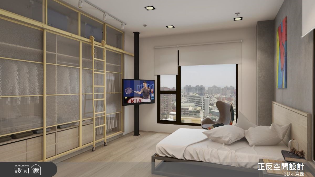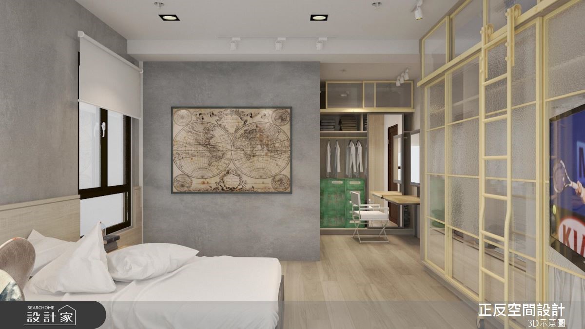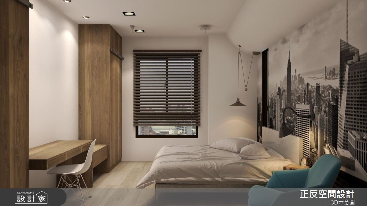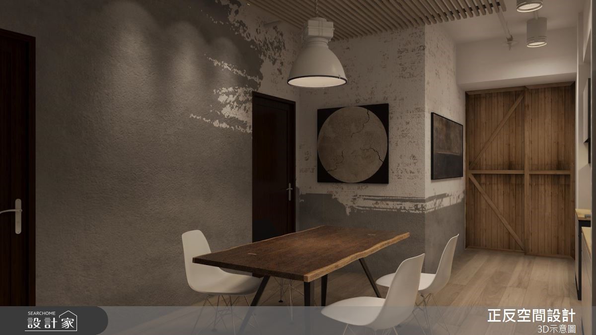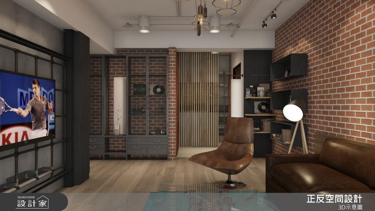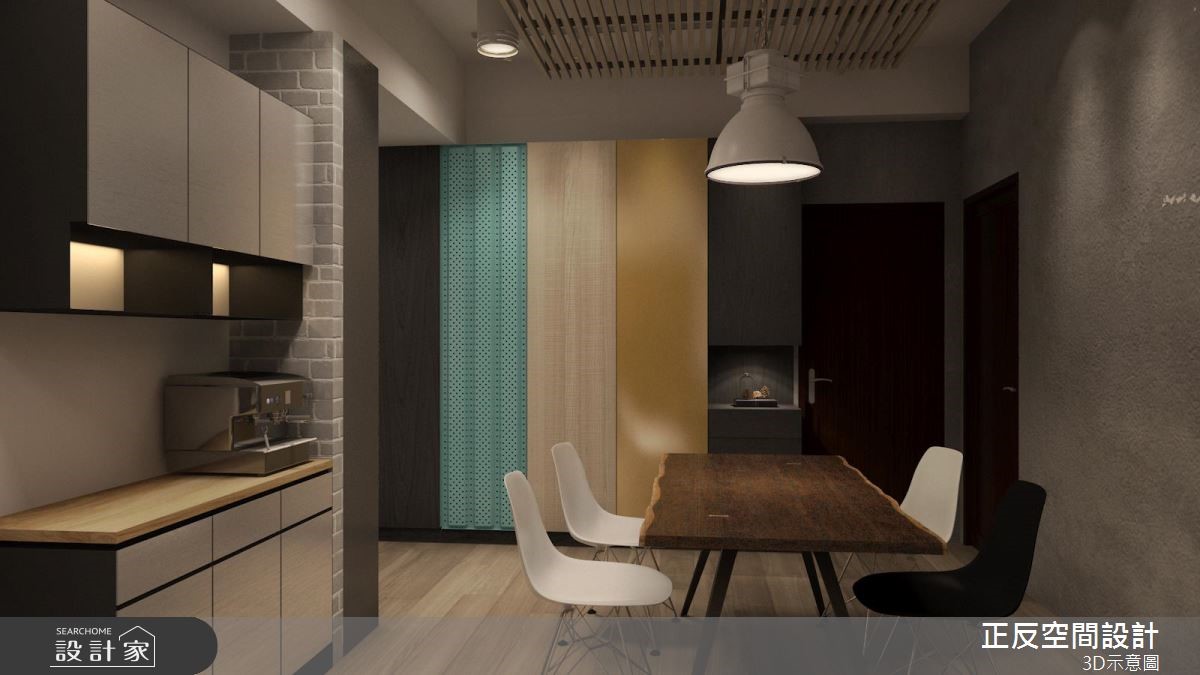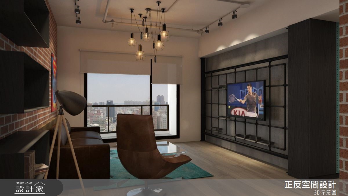 还原空间简单的结构墙面,局部以红砖墙点缀,加上粗犷铁件家具的配搭,以及深咖啡色系的皮革及原木家具的演绎,堆叠出陈旧感十足的室内样貌,诠释令人惊艳的工业风居家。【清水模搭配铁件,粗犷自然】大面落地窗的设计,将户外的城市风景收进眼底,同时引入充沛的自然光源。清水模质感化作电视墙基底,铁件交织出刚硬结构,电视以简单的方式悬挂而上;轨道灯游走在天花板两侧,中央垂挂几盏爱迪生灯,复古造型传递时代感的怀旧氛围。沙发背墙以红砖为材质,超人意象的画作,搭配一旁展示搁板里的书籍或藏品,呼应屋主的生活风格与性格。玻璃茶几与下方铺陈几何线条描绘的水蓝色地毯,透亮的材质与色彩感受,跳脱工业风的仿旧质感,注入一抹新颖的时尚光采。沿着电视墙后方的多色柜体来到餐厅领域,白色油漆随兴粉刷水泥墙面的手法,呼应工业风不受拘束的特质。原木质感的餐桌结合现代感的柜体与单椅,展现空间丰富及多样风貌。