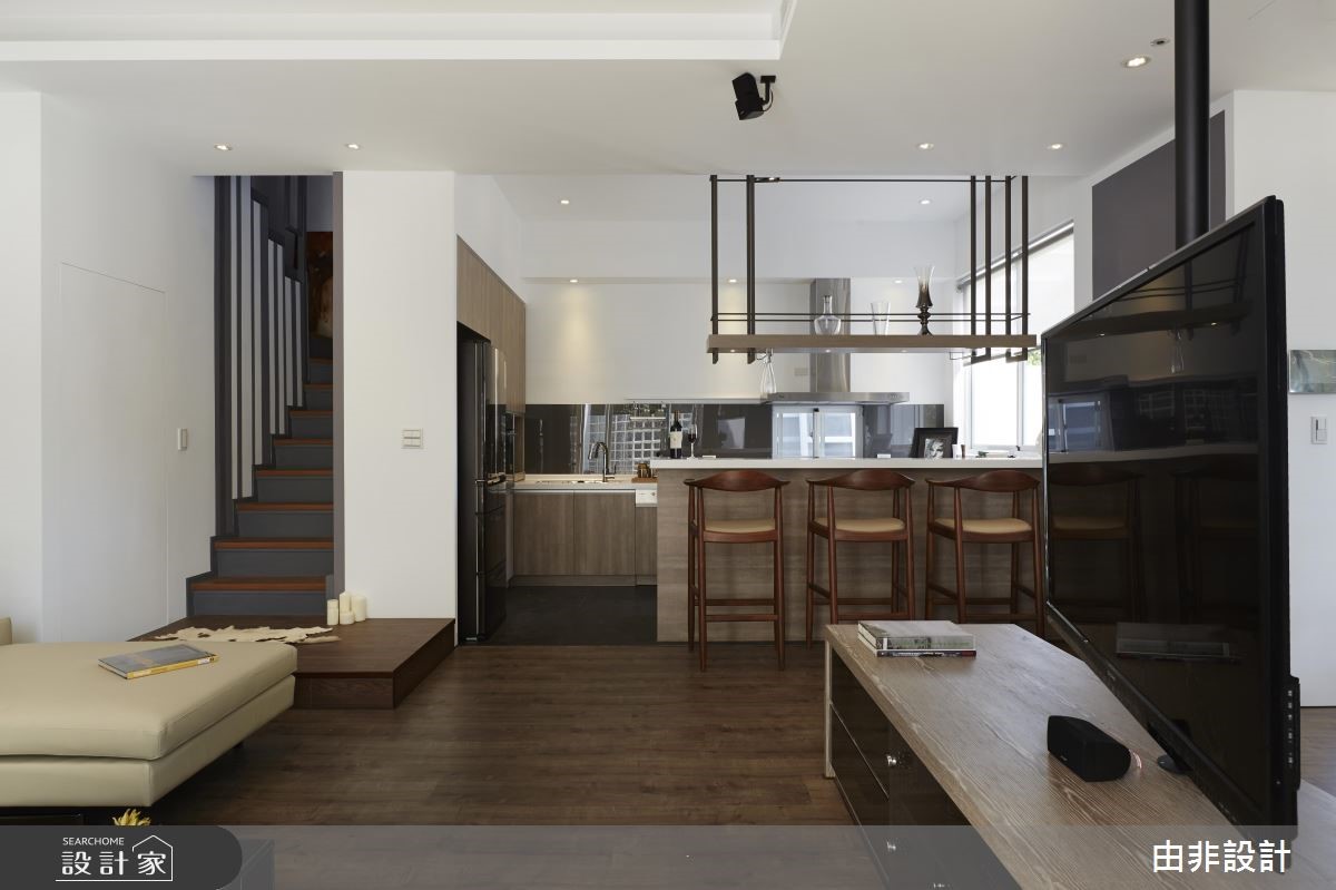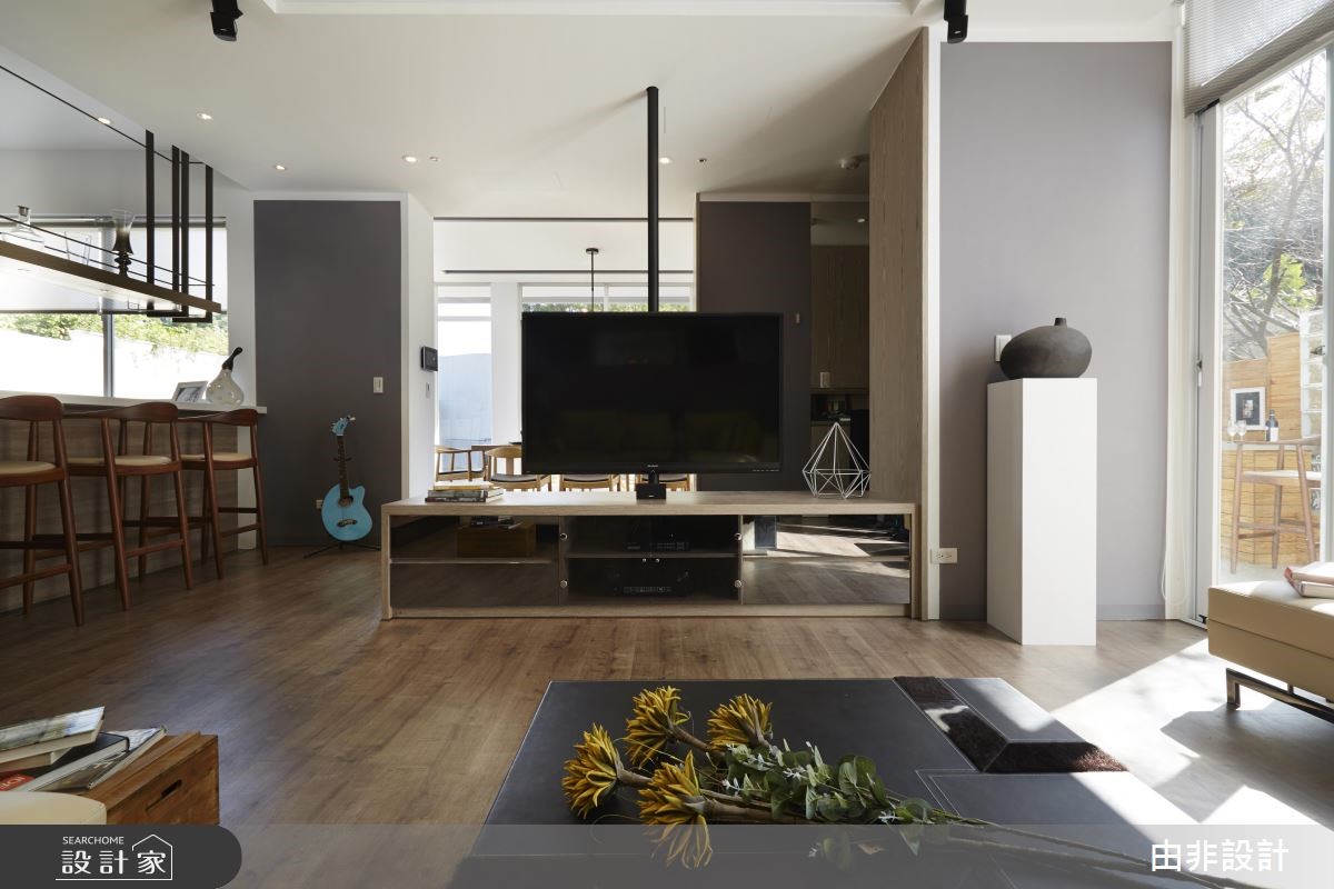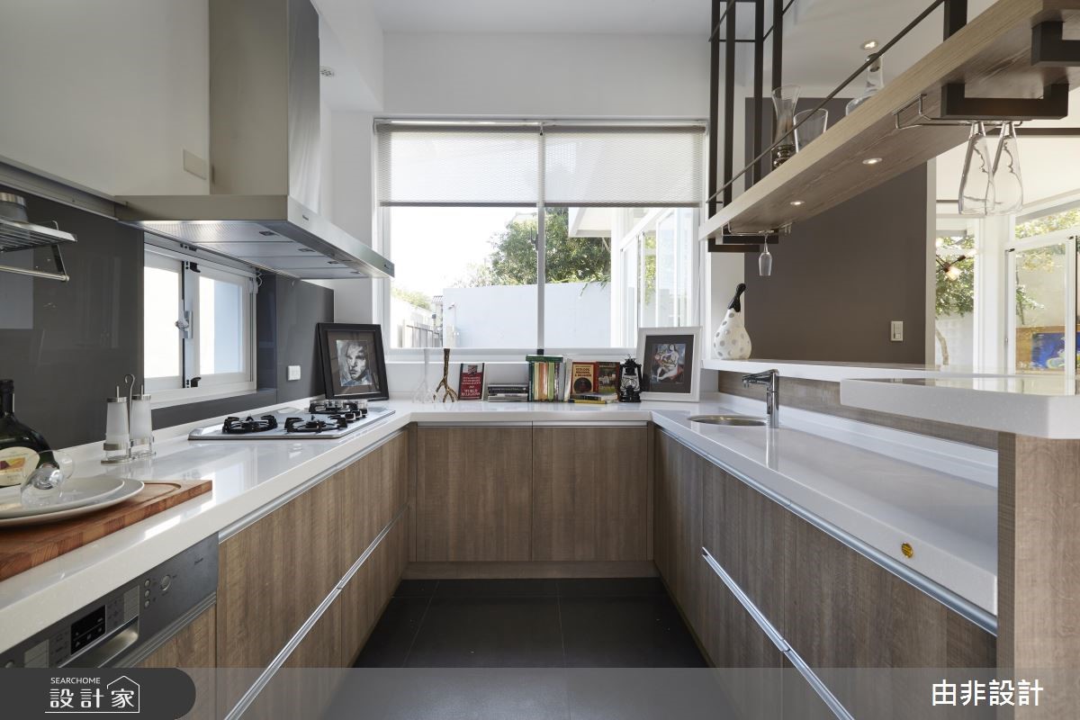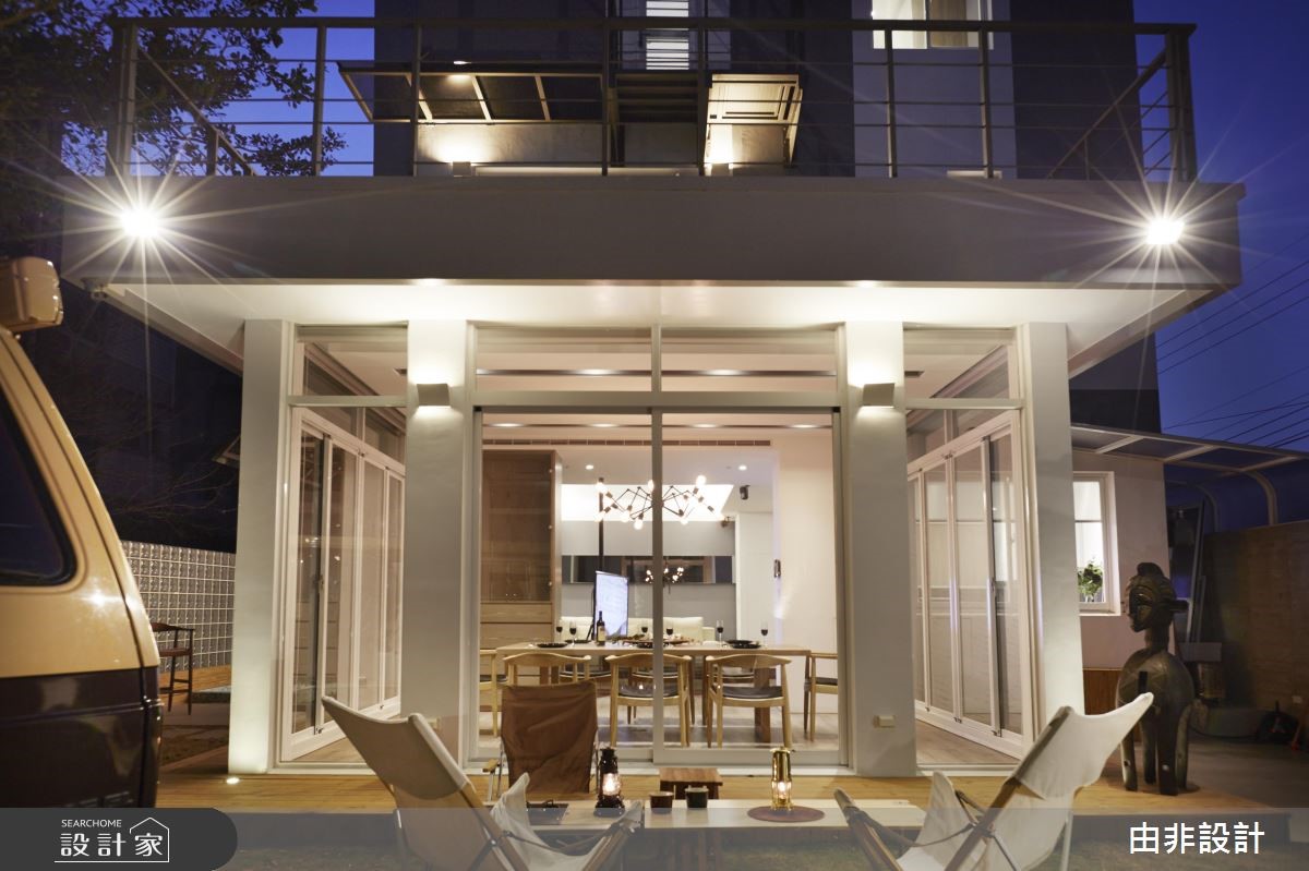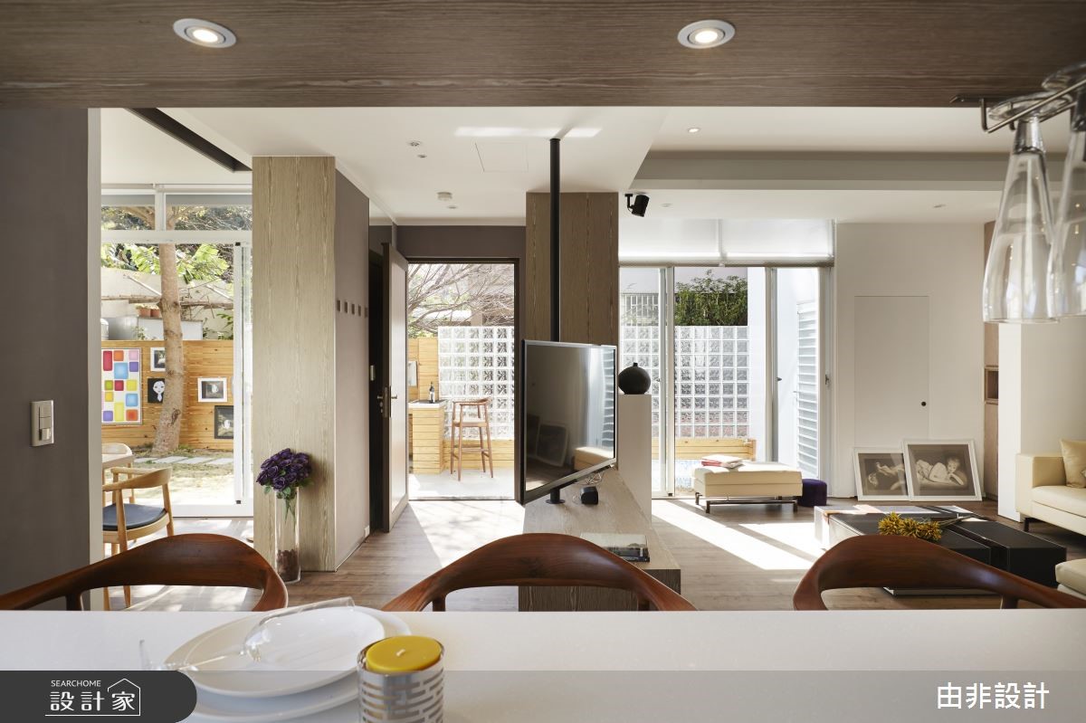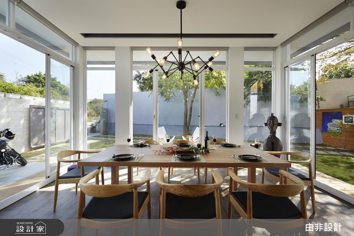 由非设计团队以19世纪荷兰理性主义建筑师伯拉格(Hendrik Petrus Berlage)的思想为概念,体现"在建筑中,装饰和装修是非本质的,空间的创造才是本质的。"彻底解构198平方米的老旧独栋楼。 【大开窗串内外,少隔断增互动】设计师团队认为,所谓空间不仅仅是向度,而是精神上的理性。抹除东方建筑常因伦理与体制结构所塑成的"亭台楼阁"概念,将空间设计回归到专业与人文本身,以实际理论方法及有效的预算配置,才能创造理想的设计价值。透过重塑建筑外观,以纯白色调与大面积开窗创造欧式现代风尚,延揽基地本身附有的庭园绿栽优势,使内外拥有完整的串连。内部公领域采全开放设计,以低彩度色调搭配实木地坪与家具,营造优雅与利落并存的感受。抹除制式电视墙,以旋转柱取代、入门玄关柜取代隔断、专业的U字型厨房与吧台结合,藉由许多复合式机能大幅提升空间内部互动,也与开放设计相呼应。