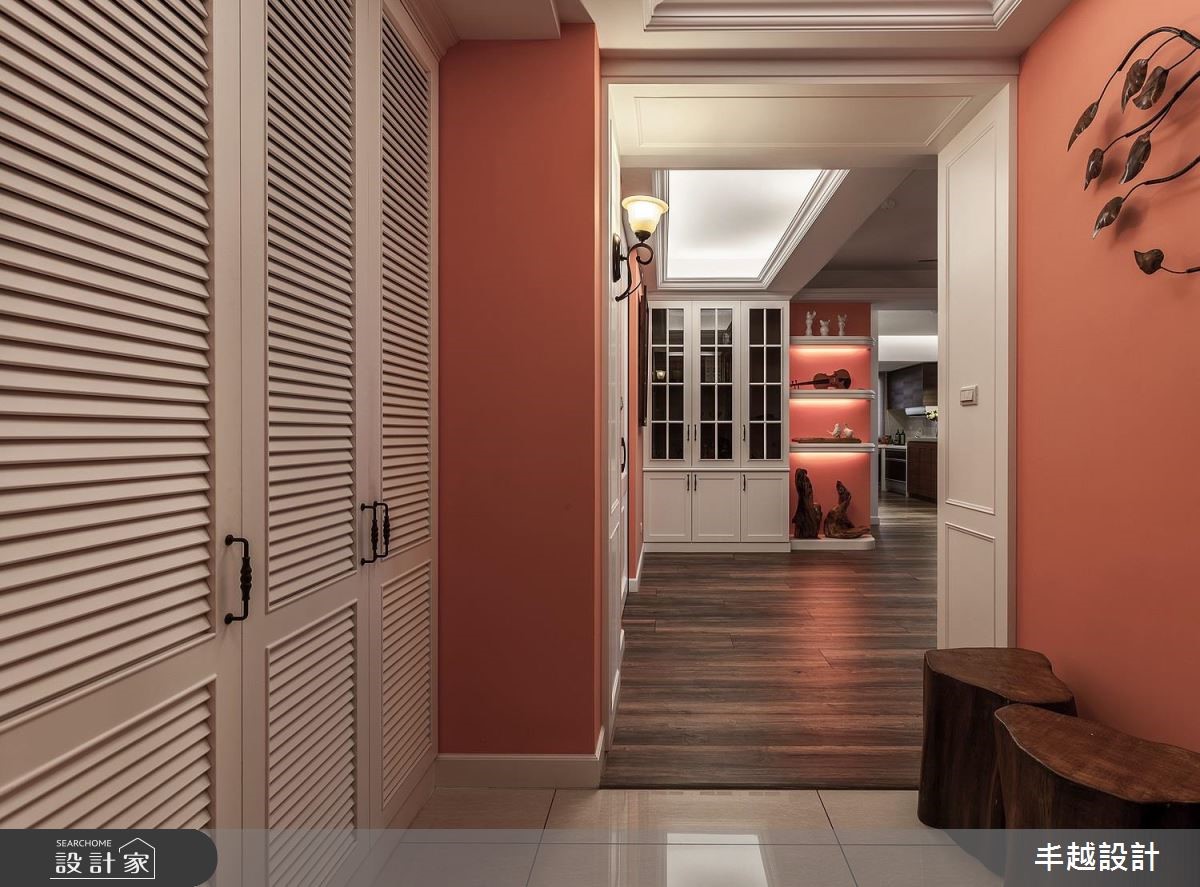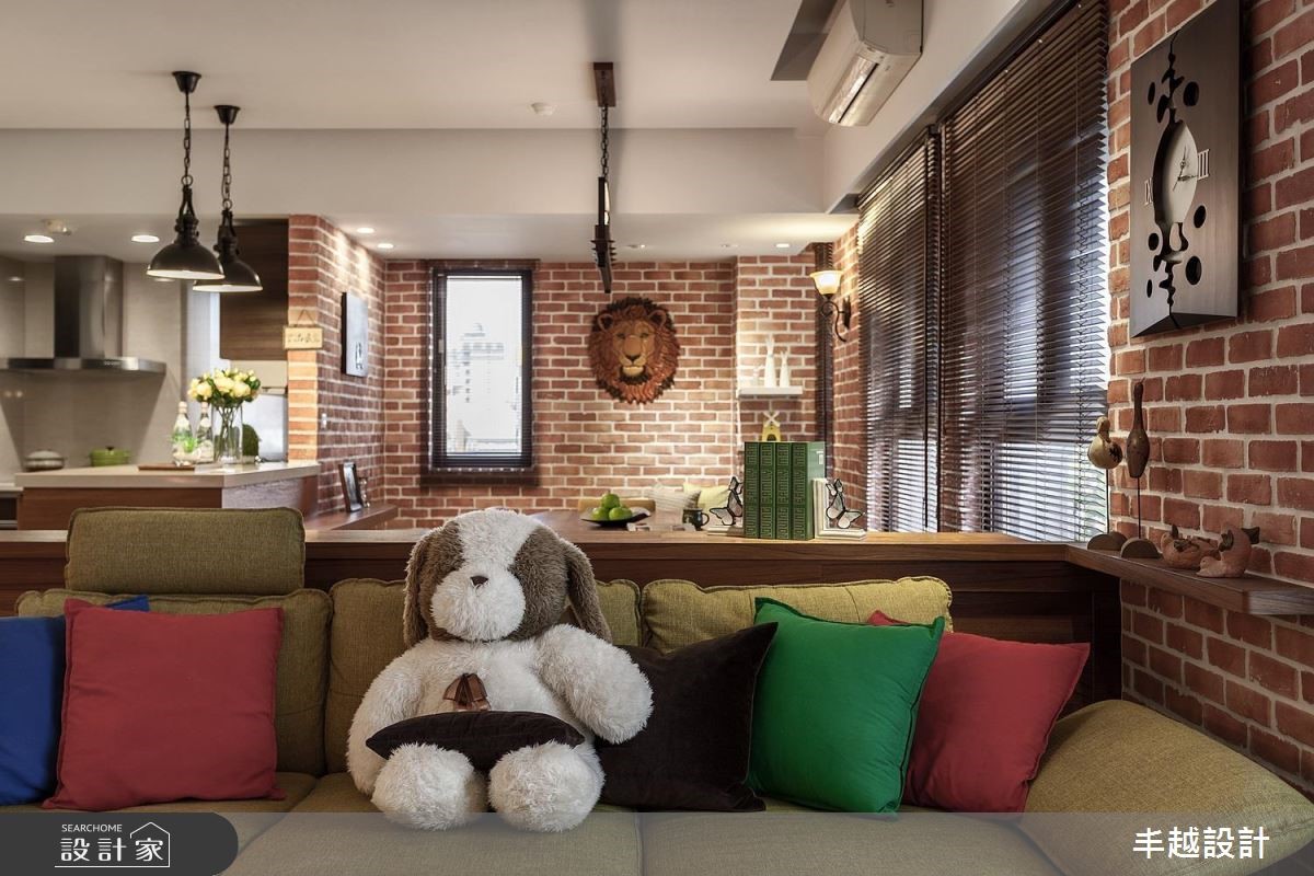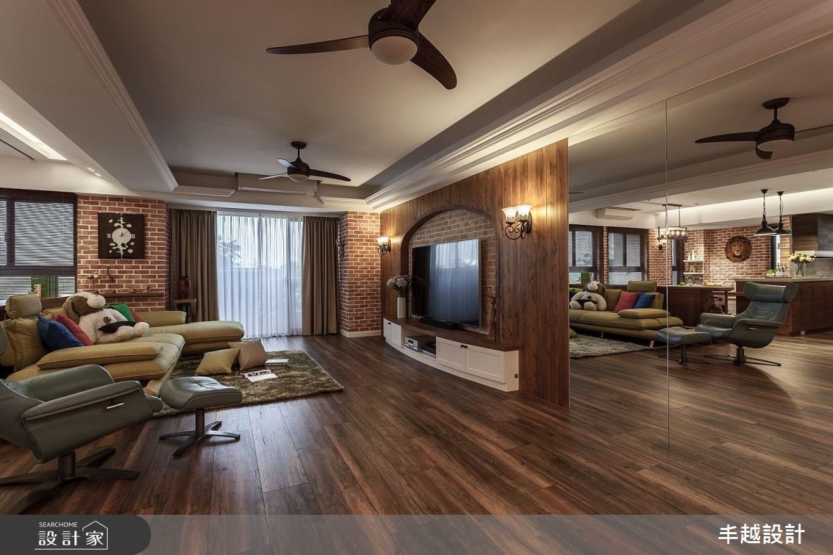 165平方米的乡村风大宅,设计师引用复古质朴的美式乡村基调,搭配开放式的格局规划,塑造出合理的生活动线,同时加入灯光、材质与色调比例等,让家同步网罗舒适度与美型格调。【摆件混搭,打造个性乡村风】玄关处,以储物量充足的百叶收纳柜搭上珊瑚色墙面,营造典雅的入门观感。步入室内,即可见明亮宽敞的公共领域视野,并以红砖墙、原木家具与跳色摆件等妆点,打造清新耐看的乡村韵味;电视墙更结合镜面材质,创造出双倍放大的空间视觉感。餐厅、厨房藉由中岛形成二者之间的串联,搭衬唯美灯光,烘托舒适好感的用餐氛围,并于一旁规划休憩飘窗,让空间拥有更多使用功能;厨房内则结合现代化的餐厨设备,注入自在舒适的烹饪体验,各项储物安排更满足一切收纳需求。