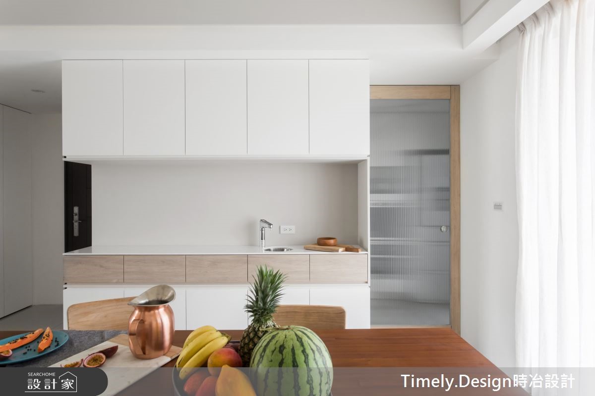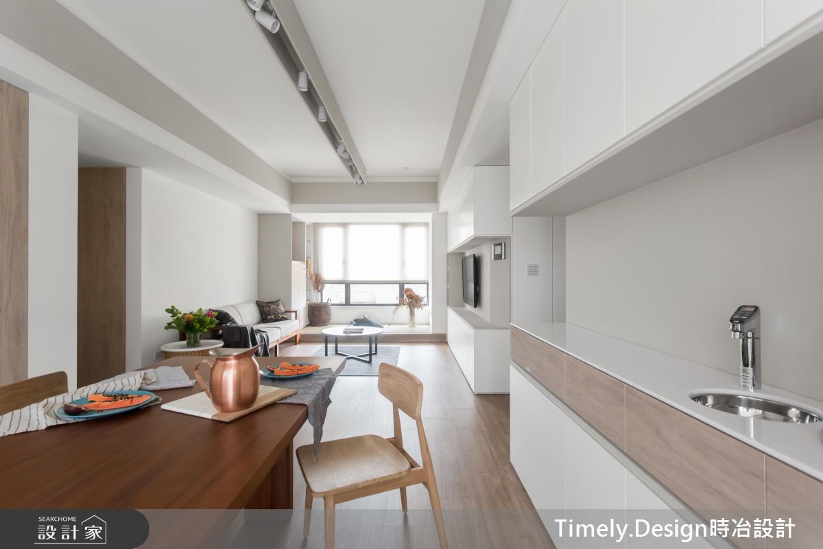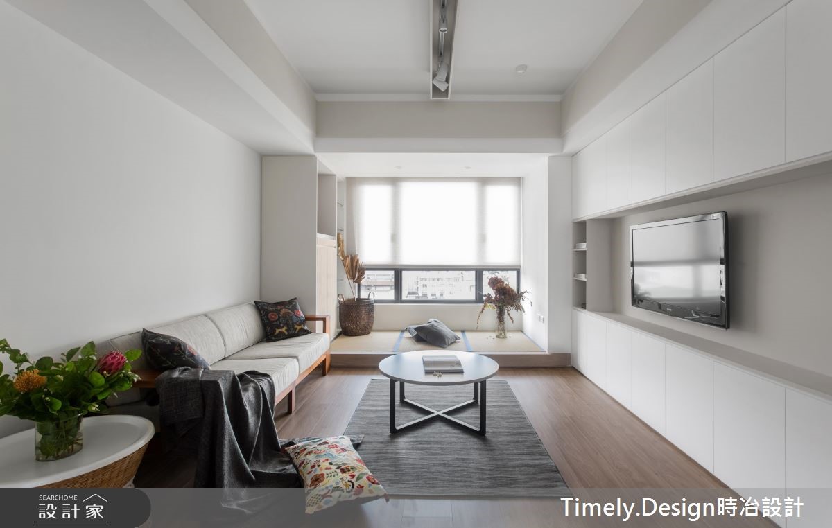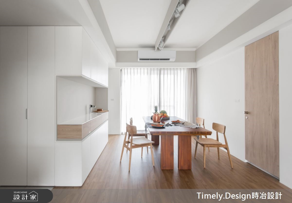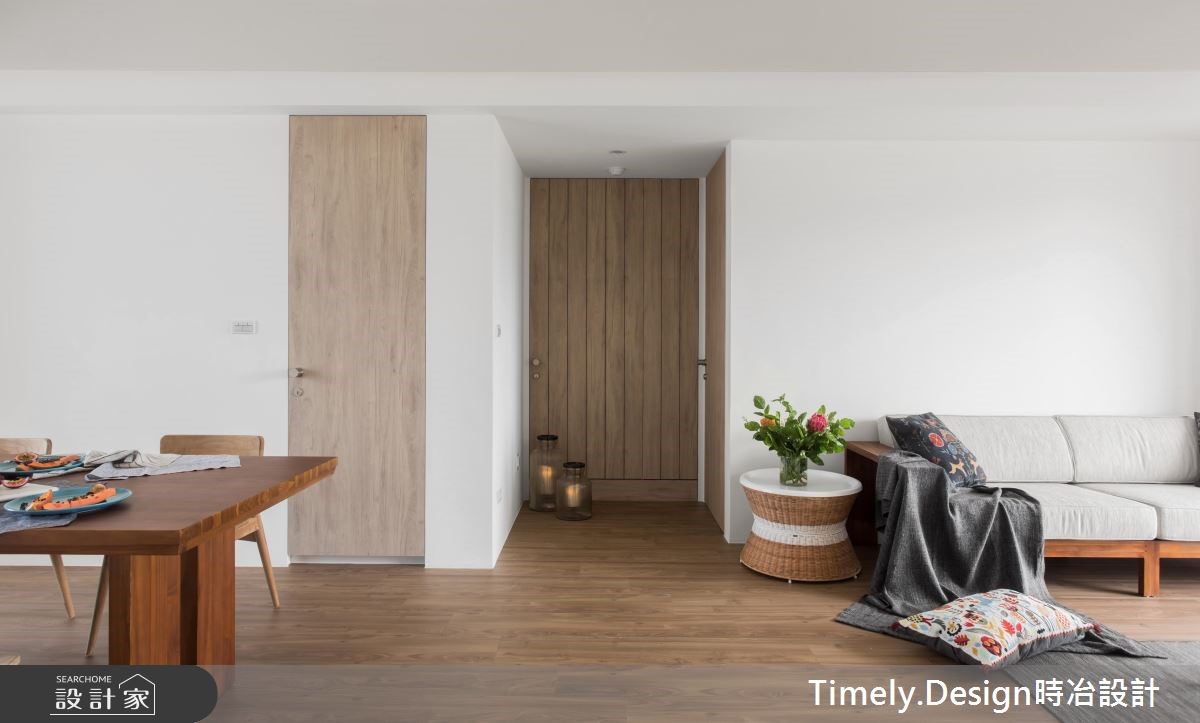退休夫妻购置了89平方米的新屋,全面展开退休生活,设计师替屋主思考的不仅是充裕的收纳机能,更以无障碍设计为规划原则,放大空间动线,打造宛如日系住宅般的质感生活。【清亮色调,打造时尚退休宅】设计师以三大方向着手,分别为收纳、无障碍空间及佛堂设计。由于夫妻俩从旧家搬迁大量物品,需要充裕的收纳机能,且无障碍设计也需预留足够动线,因此设计师将柜体安排在空间外围,并采用活动式家具,为公共领域与走道保留充裕的动线。针对佛堂设计,由于空间有限,设计师取消传统独立佛堂的做法,将礼佛区设置在沿窗处,并采用垫高榻榻米,兼具休憩机能。风格方面,因为夫妻喜爱日式风格,设计师便在简约风格揉合日系元素,并采用纯白色调与轻浅的木色,让整体空间不显老气。