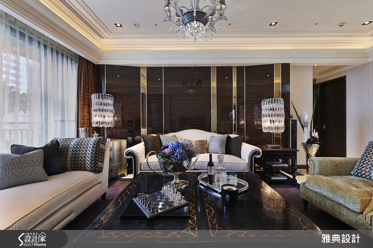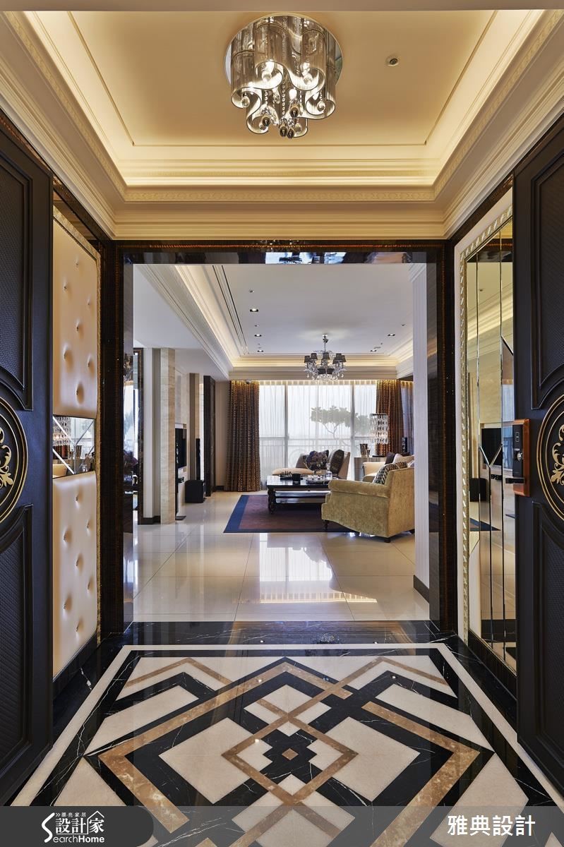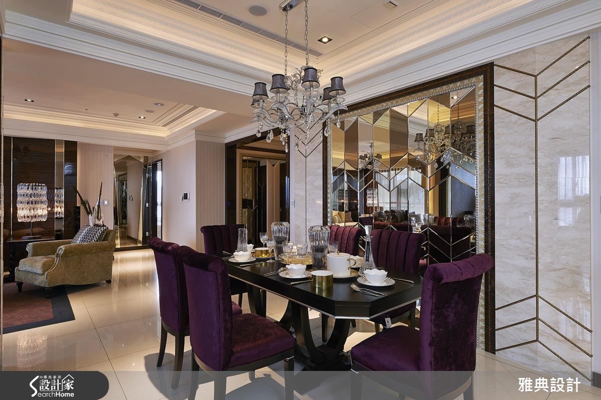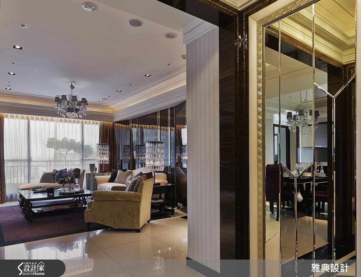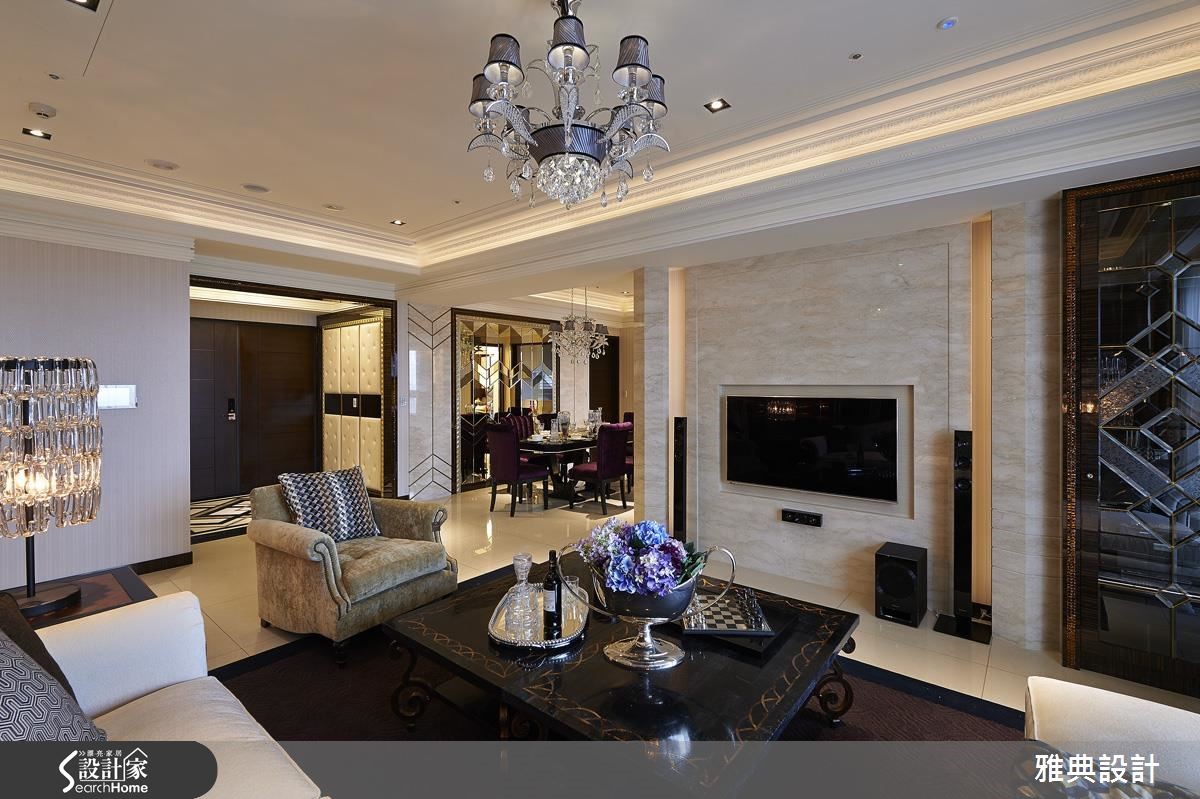 细腻的线板游走在挑高的天际线,展现壮阔气度,空间里更透过精致感的材质堆叠出时尚质感。在镜面、石材、水晶等华奢相互辉映下,调和出璀璨、剔透的艺术宅邸。 【V字线性造型,串连全室设计】旋开大门踏入玄关便扬起华丽的迎宾序曲,地坪以菱格纹线条交织而成,右侧壁面藉由镜面切割,周围以金属光泽的马赛克点缀,妆点出富丽质感。左侧以绷布拉钻与镜面铺陈鞋柜造型,结合天花板造型灯饰和黑檀木烤漆门拱界定内外领域,一展华奢气度。客厅中以米色石材展现电视墙的温暖质韵,沙发背墙则利用不锈钢饰条勾勒出独特造型,展现立体层次,再于两侧加入水晶灯饰增添动人光感。电视墙的后方为餐厅,挑选茶镜、黄铜镜与明镜交织出一道风格主墙,几何斜线的切割展现细腻工法,调和出优雅高贵风范。