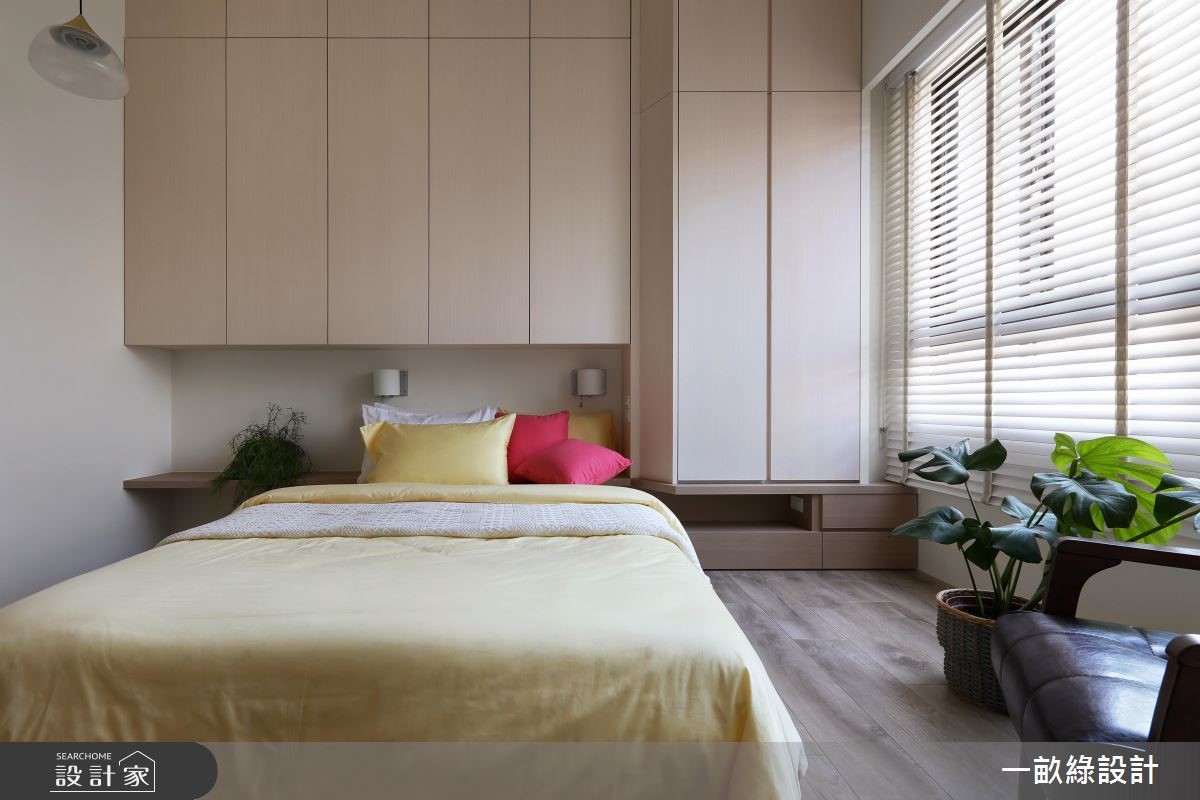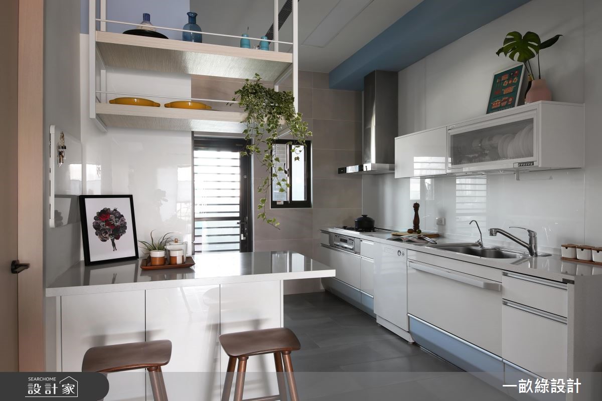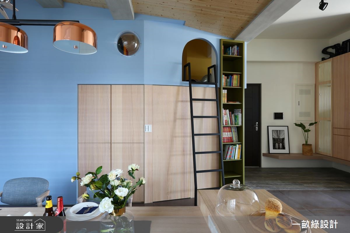 设计师在132平米的现代风住宅内,运用色彩、材质搭配自然光,营造出舒适惬意空间;并适时赋予童趣设计,造出孩子的秘密阁楼,在家就像是游乐园,凝聚出轻松休闲的氛围,平抚一日疲劳。 【缤纷用色,空间注入活力】玄关运用木作打造穿鞋区及鞋柜,格栅门片融入静谧的日式调性,营造入门的氛围转换。开放式的客餐厅则给予充裕采光进驻,照亮一室朝气及活力;再以家具、柜面及墙面色彩调和,融入淡紫、亮蓝或鲜黄等,缤纷用色展现愉悦氛围。为了让孩子拥有欢乐童年,餐厅旁打造轻巧的跃层设计,搭配爬梯、拱门造型及斜天花屋顶,仿若秘密的游戏基地。孩子可在此随意放松玩乐,交织出想象力十足的童趣视野。寝卧内,则回归休憩意义,以采光、家具型塑柔和调性,搭佐大容量的收纳柜包覆床头,搁板、抽屉、封闭式柜体等一应俱全,整合出高实用的起居机能。卫浴则加入了双洗手台功能,并让台面底下浴柜呈现清新蓝色,展现生动气息。