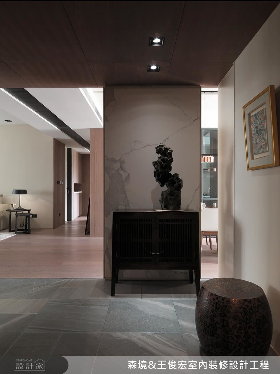 玄关打造如水墨画般的中式雅致石墙,区隔内外空间。不做满的设计,保留视线穿透感。地面则采用仿石瓷砖铺陈,并与室内木地板无高低差别的接合,展现平坦表面。
