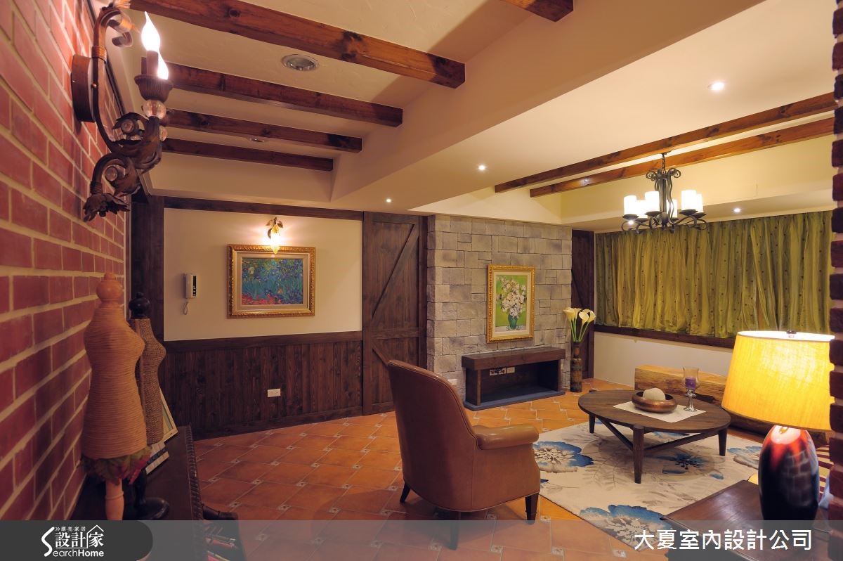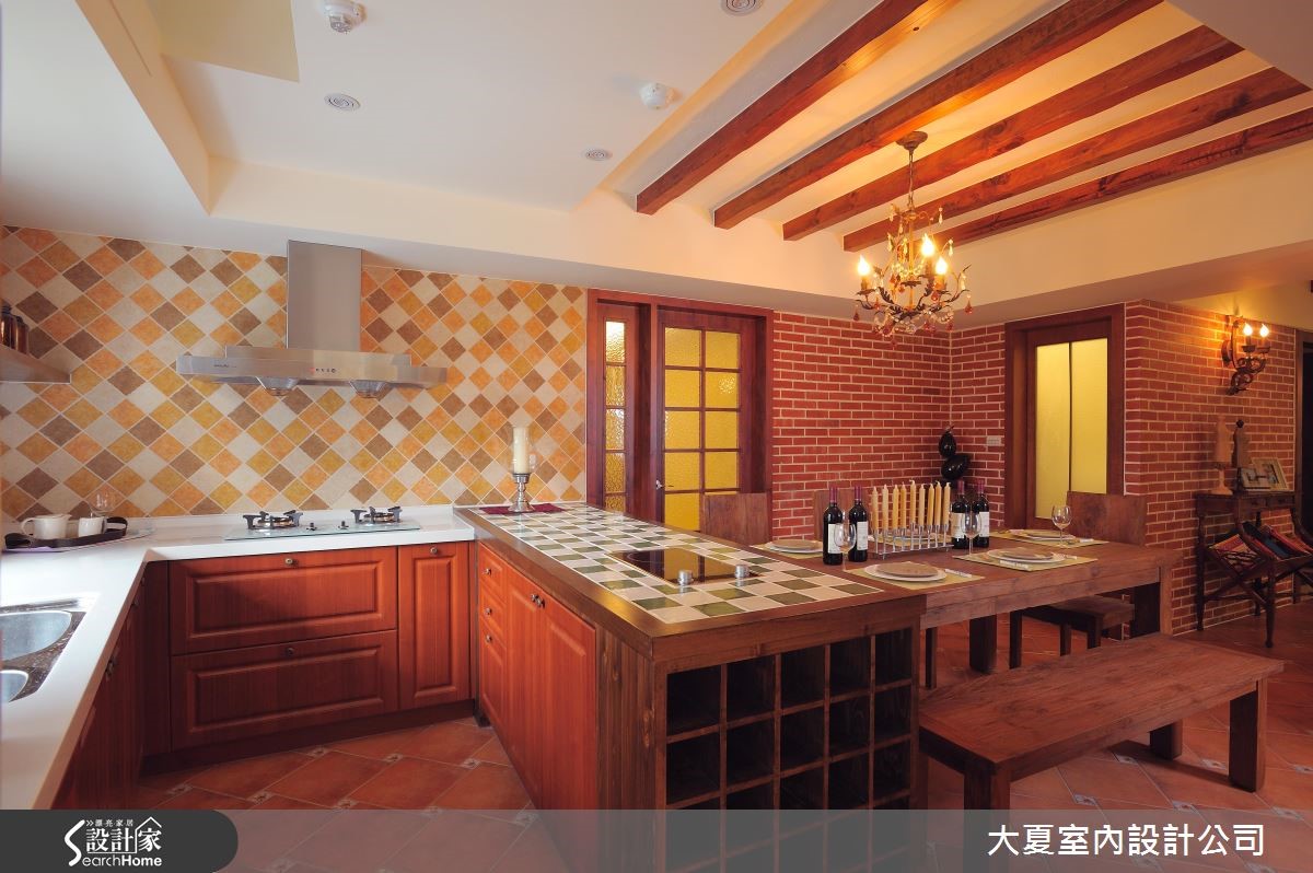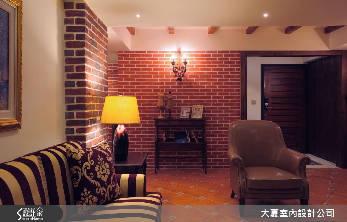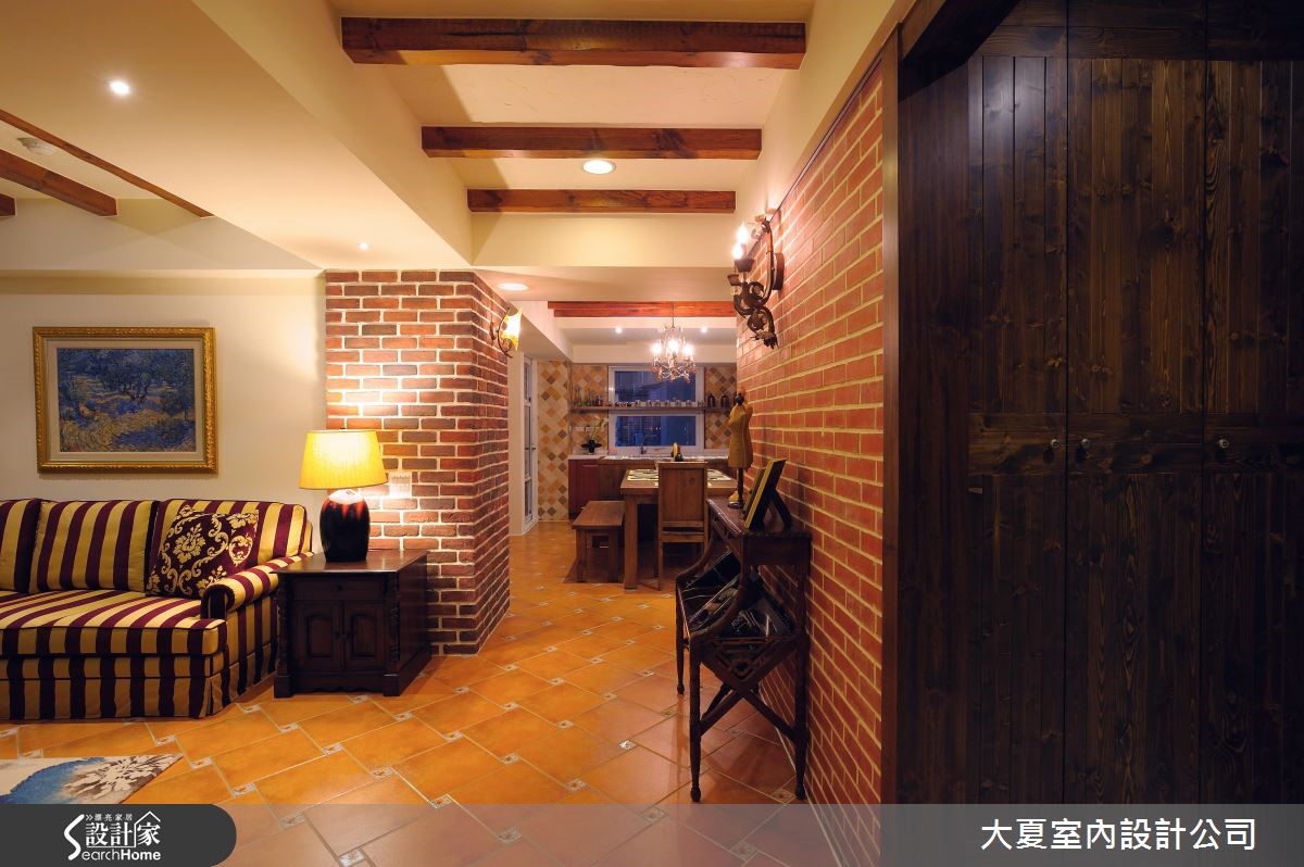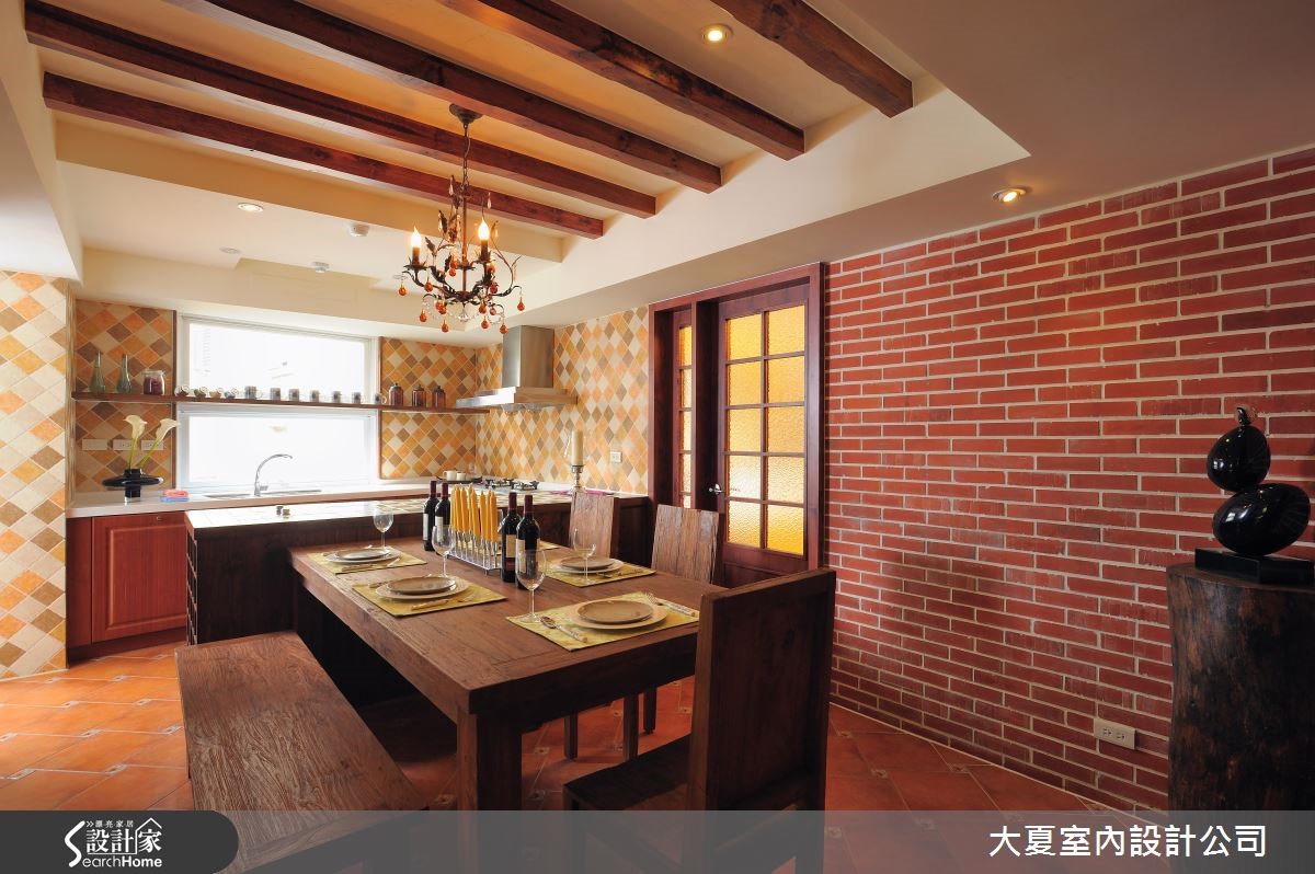 大片窗景透出户外绿意,明亮的采光与新鲜空气引入温润的欧风室内,与晕黄的壁灯、朴质红砖、原木与艺术元素构成一幅幅美丽景致。替乡村风挹注一抹英式情怀,同时也蕴藏屋主一家人的情感与日常记忆。【多种砖面,丰富英式空间表情】公共空间的墙面与地面以不同比例的砖面铺陈,沿着天花板大梁与红砖墙为界线,划分出客厅的核心区域。电视墙以粗犷感的木板铺叙,木梁串连天花板再搭配空间里的条纹沙发、皮革单椅、大原木的长座椅兼展示平台、原木茶几与花纹地毯,揉合原始与优雅的特质。餐厨区藉由红砖与花砖妆点墙面,餐桌与中岛予以串连,创造出宽敞、自在的日常动线。朴实的木头桌椅摆设,实木梁天花板搭配典雅灯饰,中岛侧边还配置红酒腰柜,台面镶嵌绿、米色系的方格磁砖,呼应燃气灶的暖色墙面,创造出惬意且温馨的用餐氛围。