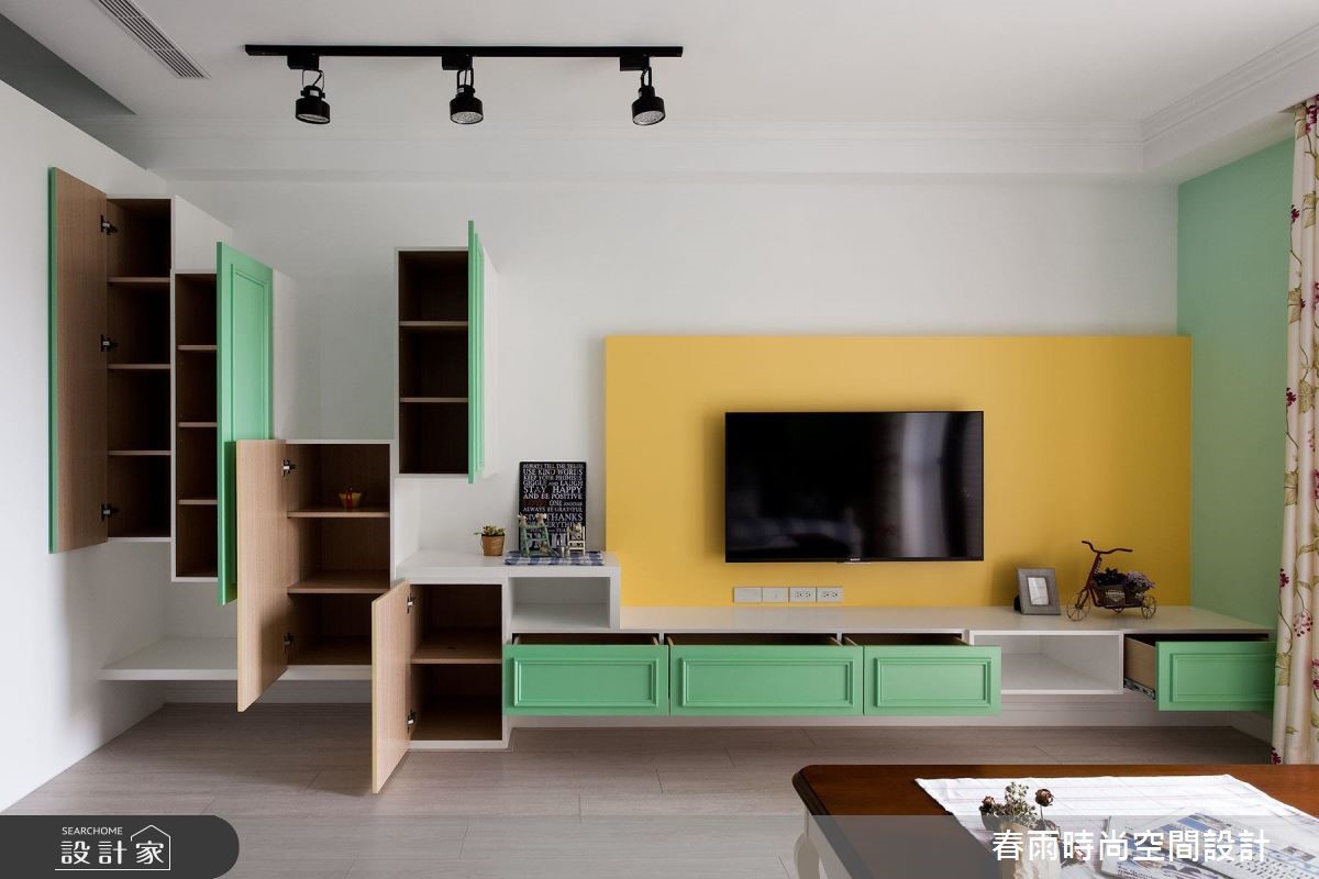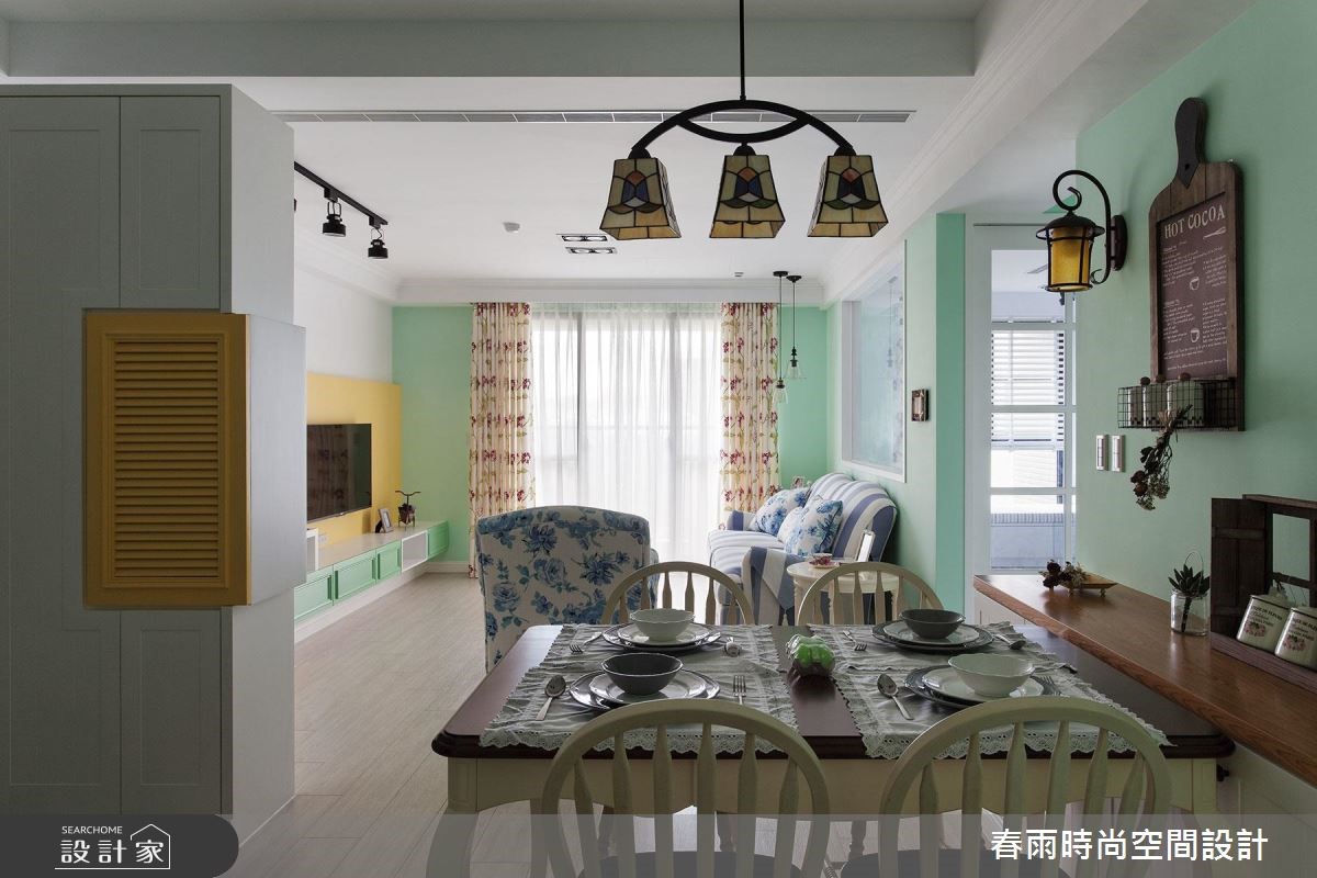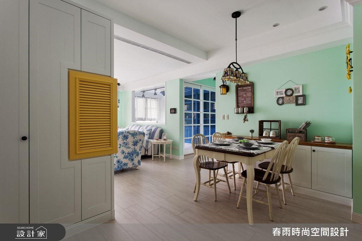 在这户83平的空间中,春雨设计以色调清新的乡村风格为主调,串连一家人都喜爱的公共空间。更依据家中每一位成员的性格打造专属卧房风格,让欢聚、独处皆能怡然自得。【抹上清新色调,打造经典乡村风】入门处以西班牙复古砖以及以鲜黄色百叶门片点缀的白色柜体不露痕迹的框设玄关区域。并以散发暖黄光芒的雕花玻璃吊灯笼罩四人餐桌,一进门就感受温馨气息。薄荷绿色系由入门、餐厅一路延伸到客厅,更表现与收纳柜体门片上,与柠檬黄电视墙达成跳色搭配。针对风格营造,以水蓝色家具与书柜相互呼应,搭配格状玻璃拉门与细致的线板,以及碎花与条纹样式点缀,经典乡村样貌表露无遗。