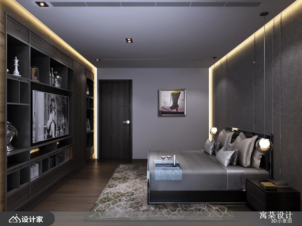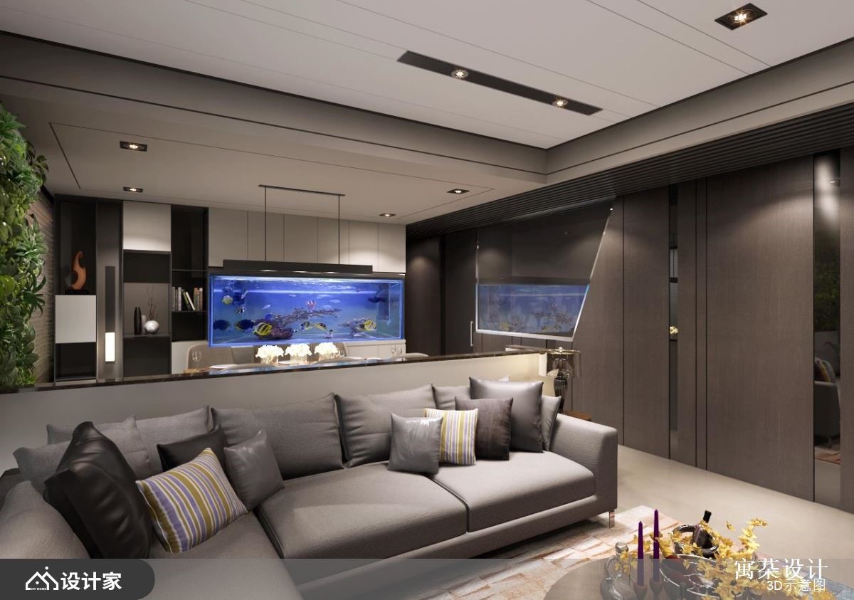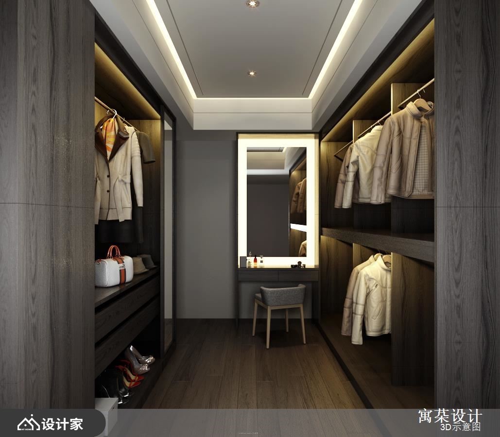 设计师在132平米居宅内加入现代风设计,让公共空间形成有如酒店般的大器场景,满足迎宾待客需求;而私领域内,则打通居室,让主卧多了额外的衣帽间,并给予轻盈简约的机能规划,让家中每个场景都显得品味十足。【运用镜面与木皮,打造利落风格】客厅内因大面窗景带来良好的自然光和景观优势,并运用窗帘调节光线,延揽明亮的采光效果,同时于墙面加入染色木皮铺陈,融入线条与局部镜面穿插,型塑工整利落的立面表情。【矮墙和天花造型,画出场域界线】在客餐厅之间安置一道矮墙,保有二者的开放互动,且在天花作出高低落差,让空间线条错落有致,达到拉抬视觉与隐性界定场域的效果,而在色彩安排上,则采以灰色、大地色等交织而成,透过抱枕或植栽提亮视觉,构成安静平衡的生活画面。【主卧纳入更衣间,满足屋主需求】主卧内藉著木地板铺述,使空间氛围得以转换,并于沉稳色调之中妆点间接光源,营造舒适情景,并于衣帽间布局完善柜体,让衣物可整齐收纳,创造出符合期待的使用情境。