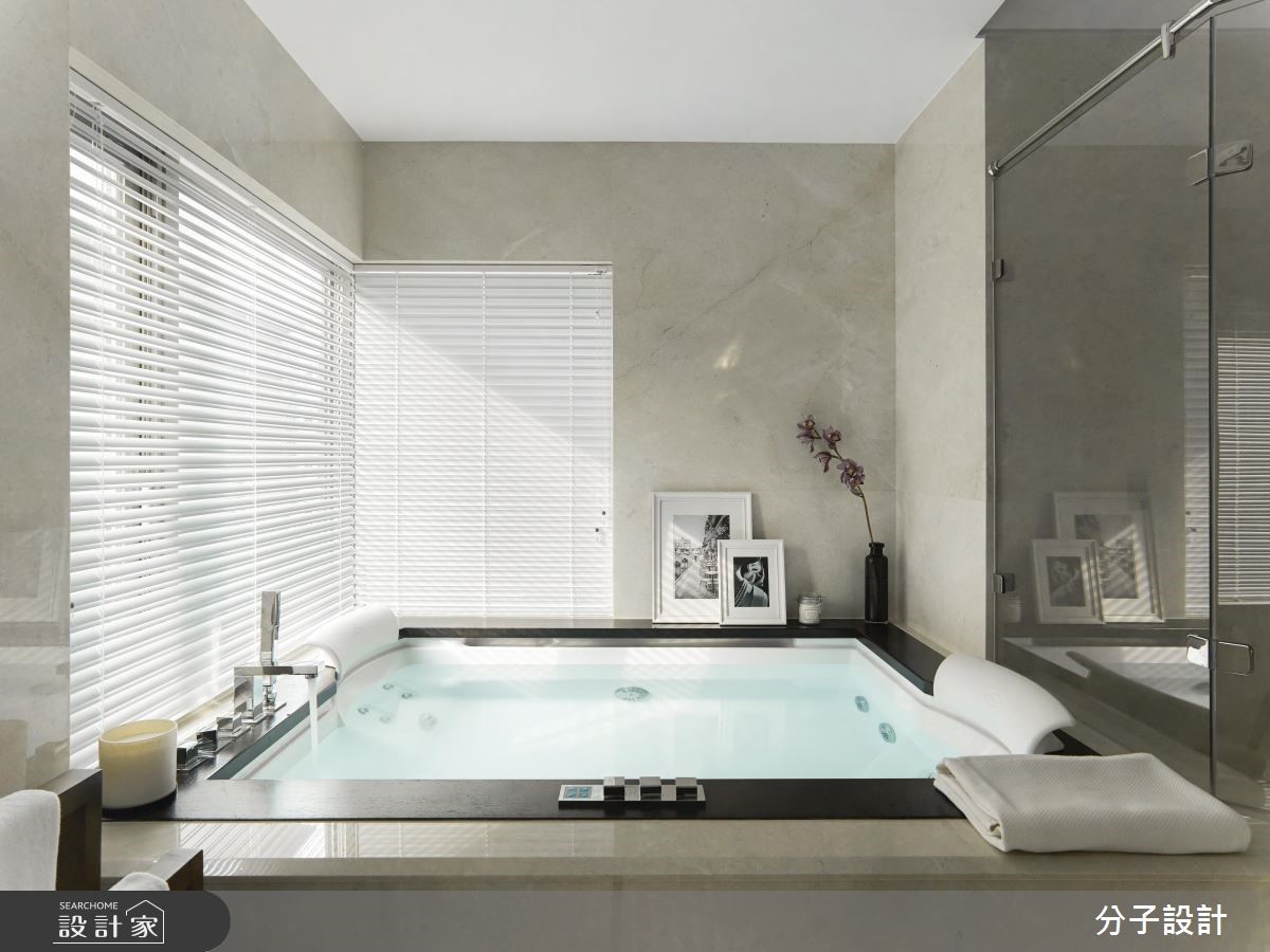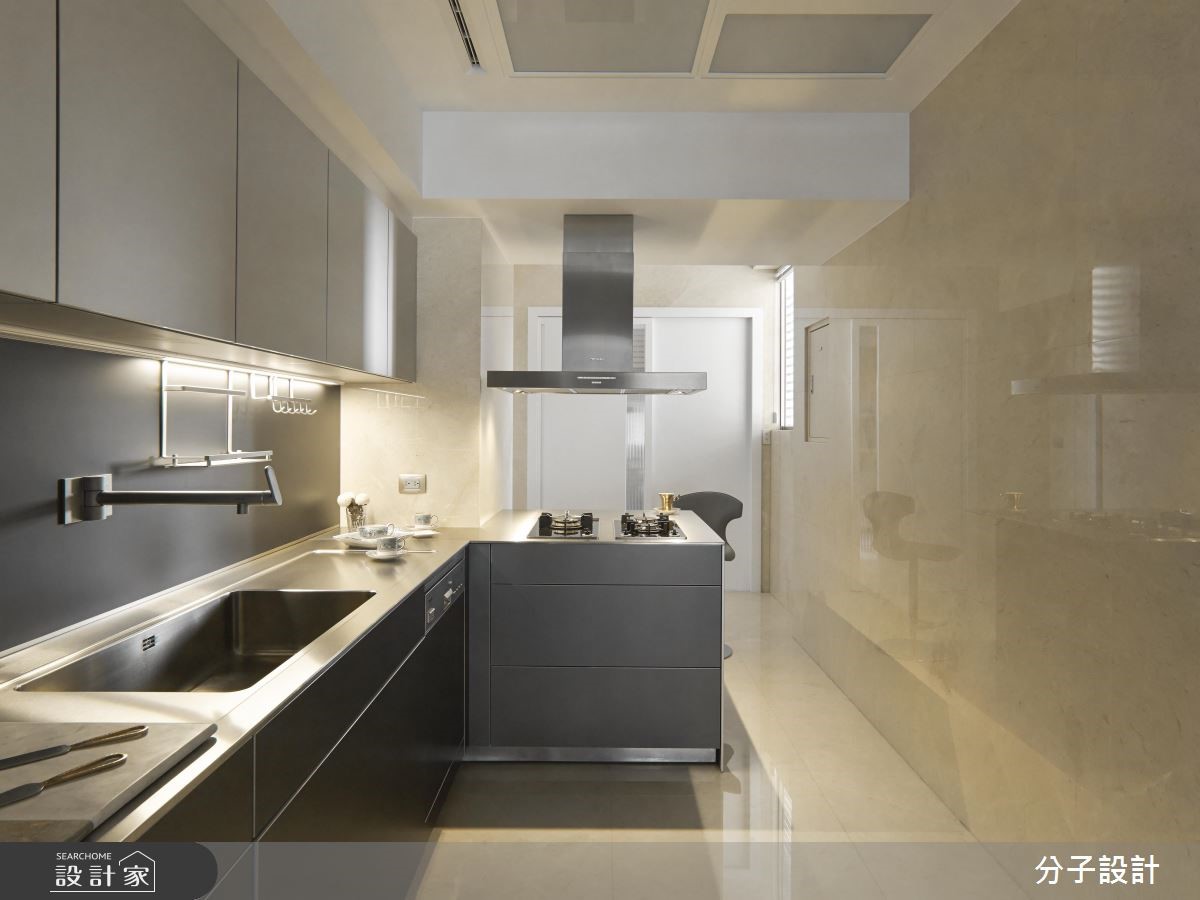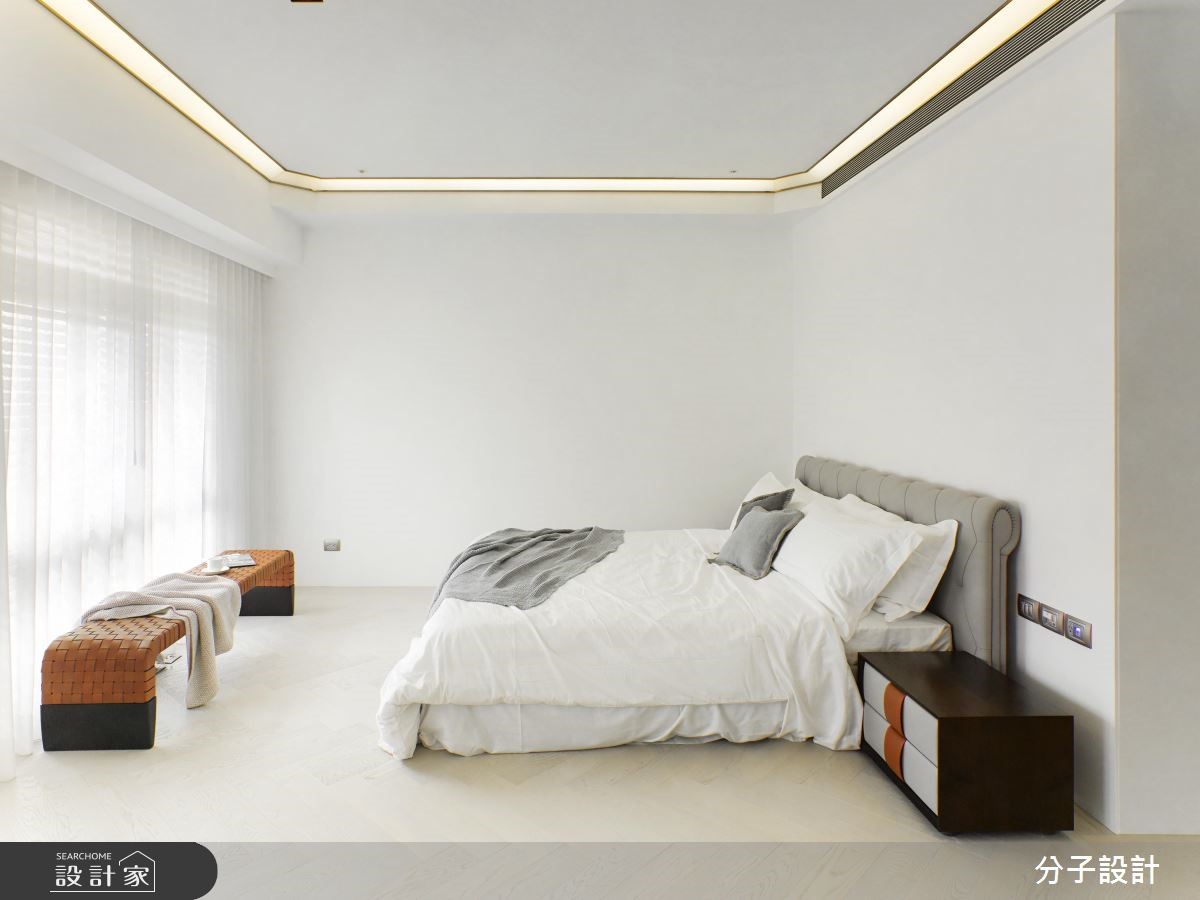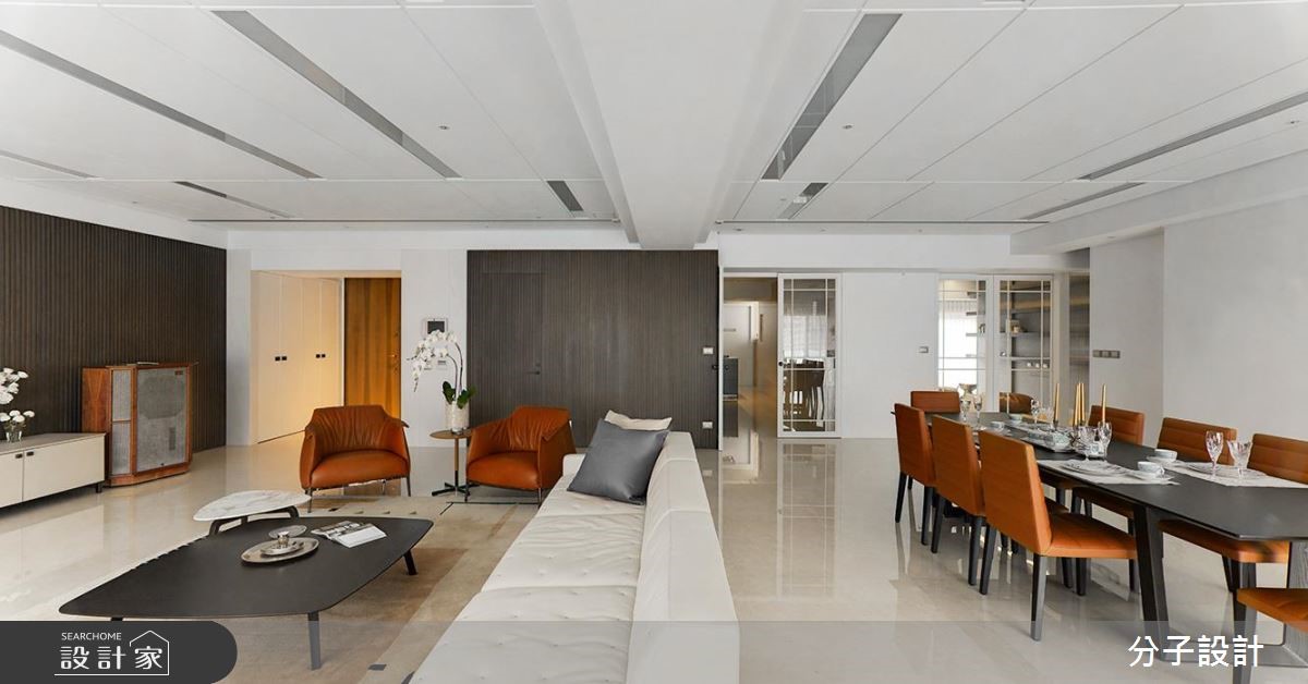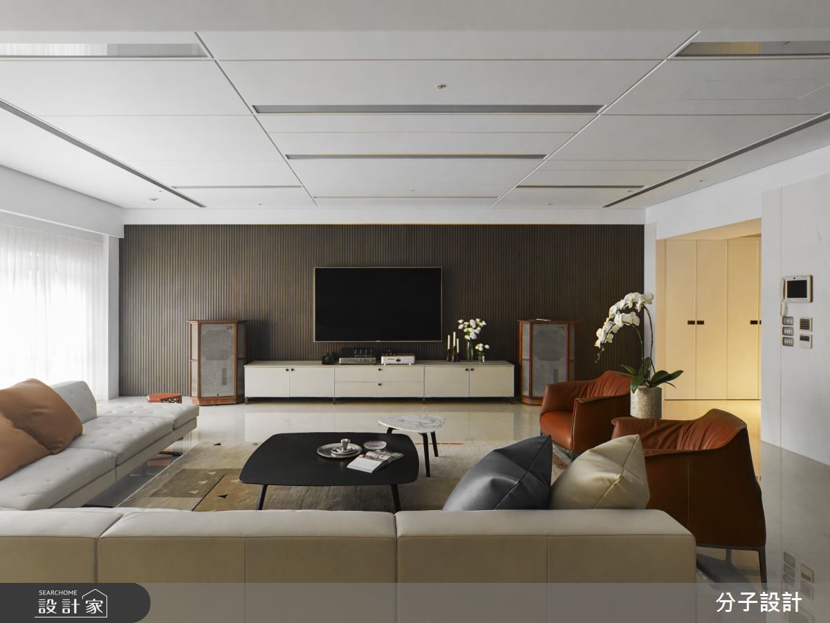 264平方米大宅,设计师以现代风做为基底,让大面积的白色底调与深色木质相互搭配,塑造明亮简约的空间场景,并让家具做为居家主角,运用恰到好处的主配分布,凝聚利落不杂乱的现代风印象。【简约色调与名牌家具,不失大器】客厅采纯粹简约的色调背景,让屋主指定的全套Poltrona Frau家具作为主角,呈现出化繁为简、不求奢华,却依旧开阔大器的视野。材质使用上,除了大面积留白,亦选用深色胡桃木型构格栅立面,挹注沉稳表情,同时保留窗面,运用清玻拉门的处理,促进生活环境的敞亮氛围。【间接光源,让居宅亮度更加匀称】灯光营造则务求干净利落,减少不必要的垂坠灯饰,全面采用间接光源、灯带等,让居宅亮度更为匀称。厨房中刻意选用bulthaup厨具,要求轻薄利落的材质表现,其中与厨具结合的小吧台更可说是巧思呈现,既让空白地带发挥妙用,也增进了餐厨的互动意义。