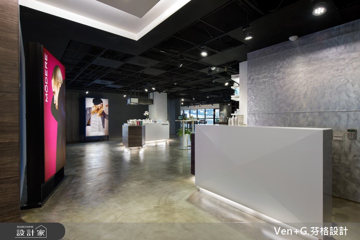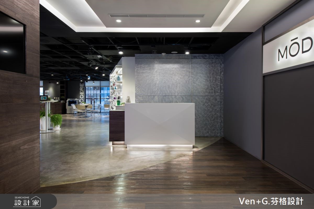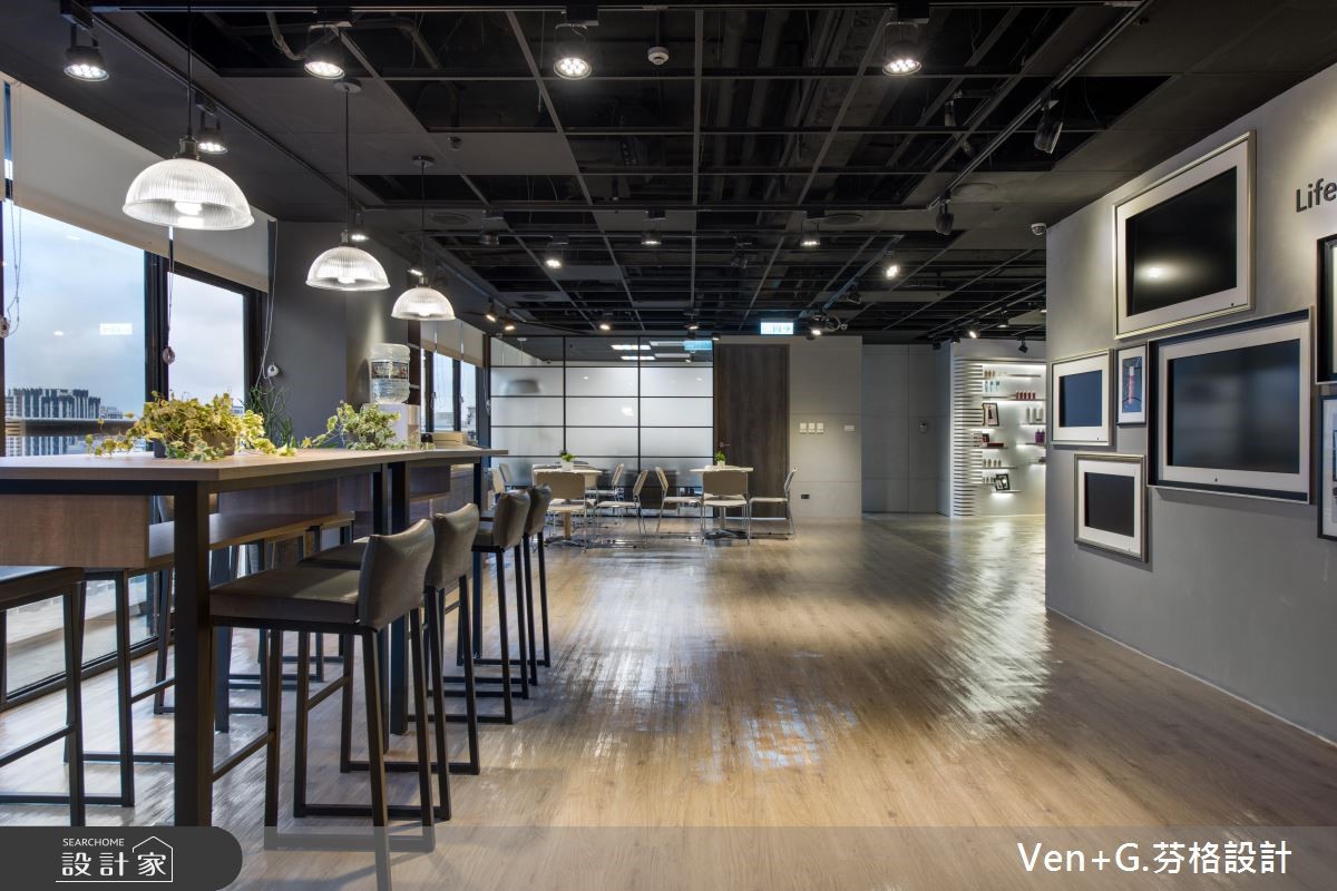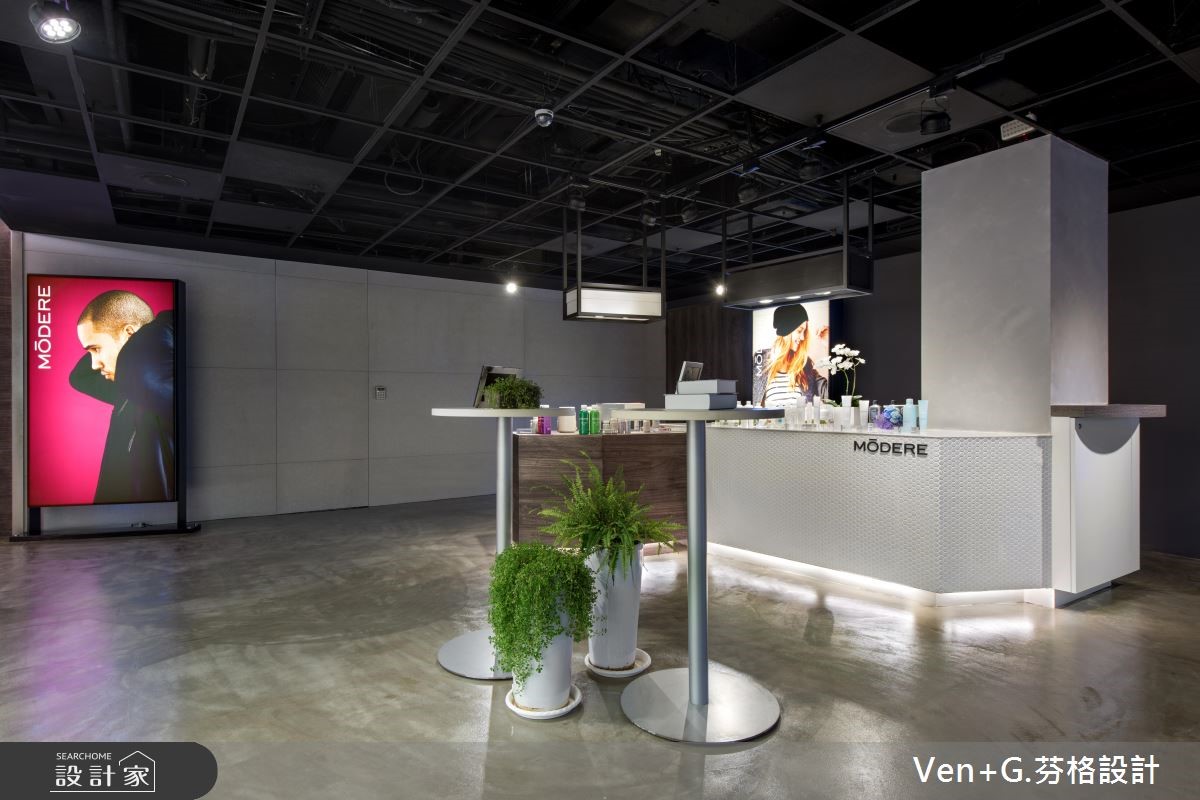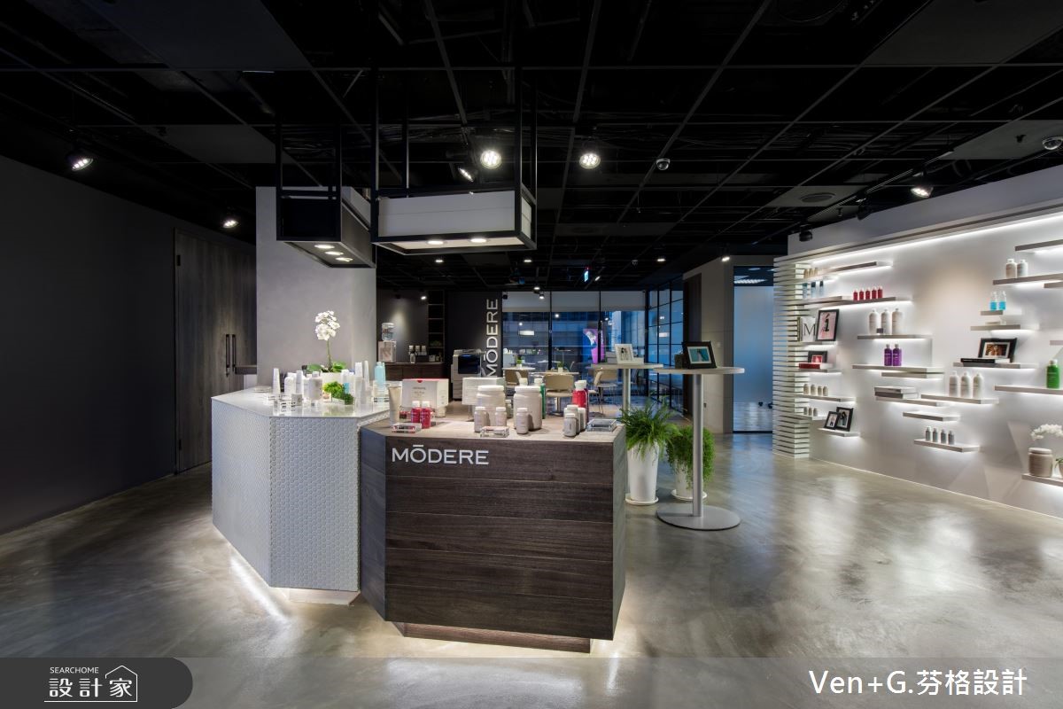 多年的老屋,摇身一变成为Loft风貌的商业空间。崇尚自然、时尚与健康的品牌,进驻在这个百坪的室内里,不仅做为展售之用,同时也成为会议与教育训练中心。【材质混搭,柔化Loft冰冷印象】为了克服楼高过低问题,天花板以工业风的裸露感呈现,管线重新规划且喷染黑色,不仅解除压迫感受,且呼应粗犷不羁的Loft风尚;地坪则以仿清水模涂料铺陈,局部柜体以木纹肌理展现,带来些许温润感,再利用嵌灯照明酝酿情境,映照出商品本身散发的自然魅力。幽暗的室内,藉由美感与实用兼备的空间安排,特别是以白色层架强化产品的展示效果,让外观设计与内在特质相互融合;局部壁面陈列形象海报,充满活力的模特儿姿态,传递清新与健康的品牌形象,再搭配绿意植栽的点缀,为空间注入充沛的自然生命力。
