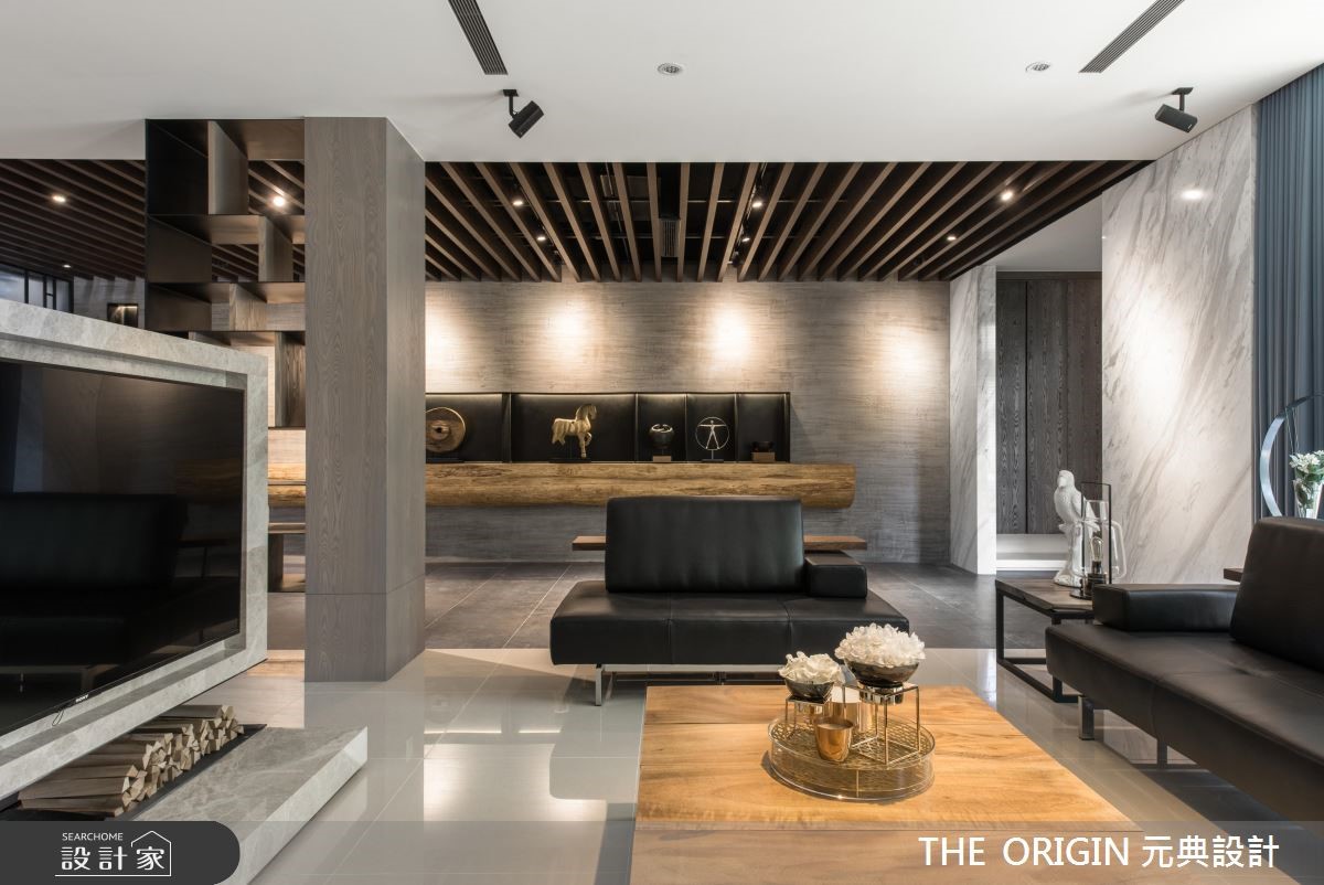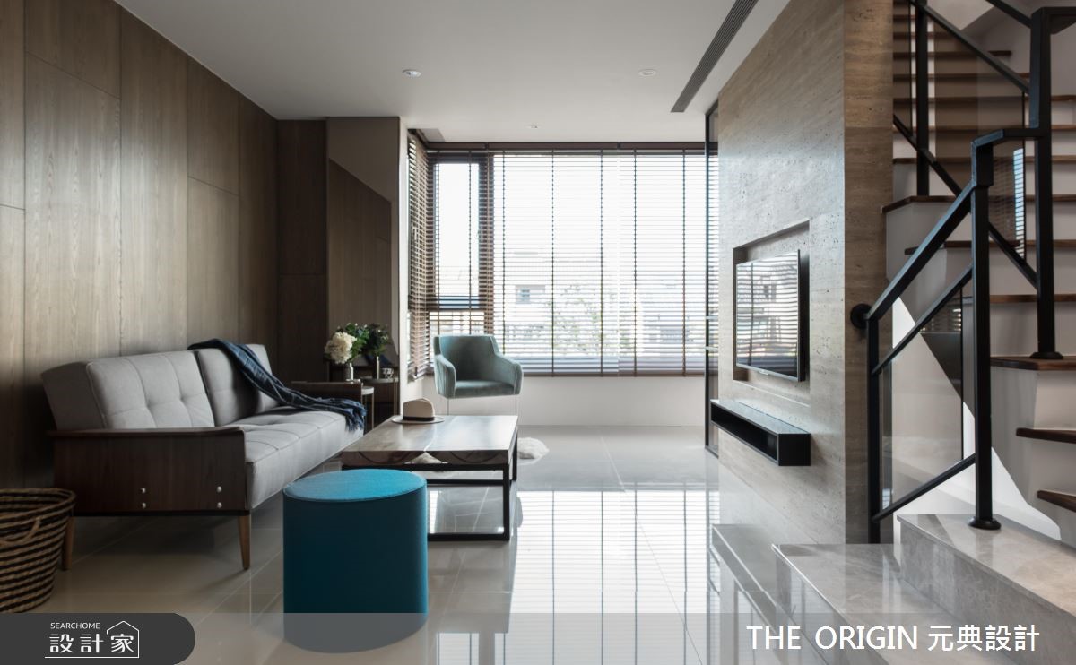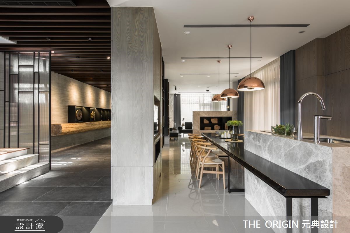 百平别墅,设计师以大量的温润木质结合浅色天然石材为基底,并运用光与影的烘托,让冰冷石材也散发出温煦气息,在流畅的动线布局之中,传递出淡雅内敛的禅风韵致。【善用材质比例,铺陈大器居家】进入玄关,墙面上不加修饰的原木展示区随即映入眼帘,搭配木格栅天花与廊道光线,形成动线和视觉的指引,让人有如置身美术馆的展览情境;开放式的公共领域则利用地坪与柜体区分不同生活区块,不仅能串联各场域,也让视野更加穿透延伸。楼梯引用玻璃与铁件为扶手,使光线得以穿透,踏阶材质更悄悄做出差异,诠释不同场域的转换;楼梯下方则陈列简约的桌椅,搭配着窗外蓝天绿意的景色与筛落光影,营造静谧放松的空间氛围,让居家生活也能享有惬意的度假感受。
