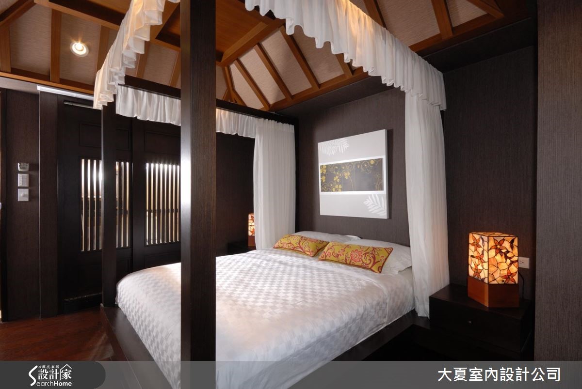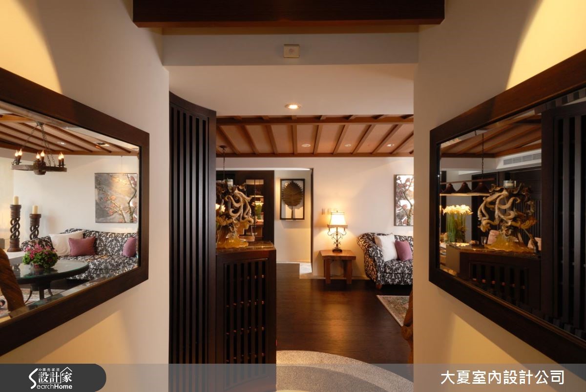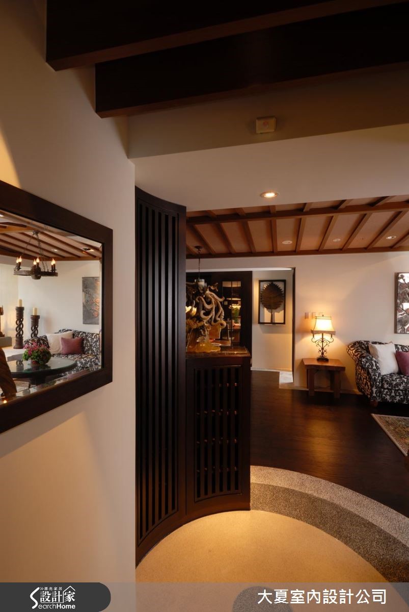 许多人喜爱休闲感与静谧气息的居家风格,设计师将本案以休闲风加以改造,引用瀑布、流泉、石板椅、鸟笼、油伞、砂岩等巴厘岛元素,成功将居家转化为度假时尚酒店。 【自然元素,营造放松的居家感】入口玄关处,规划柳暗花明的景深画面,走道两侧利用对称的长镜,交互映照出公共空间两端不同角度的影像,型构出两幅随时变化的现代画,迎接着主人返家。与公共空间的地面衔接处则以三色洗石子,画出宛如标靶的同心圆弧,与室内木地板形成明确界限。横亘客、餐厅的三角型实木梁天花,是强化两个空间互动的媒介之一。中央拉高的三角屋顶设计,除了增添休闲气息,亦拉升了视觉高度,达到放大空间范畴作用。客厅电视墙采以立体板岩打造,搭配漂流木斜身倚过,饶富立体构图趣味,下方承接石板台面机电柜,展现出屋主的性格品味飘窗的设计经过了多次琢磨修整,外观以白色磨石子砌造,并摆设装饰品,诉说着冲突又和谐的跨界美学。餐厅运用造型吊灯辅助餐桌椅定位,厨房与房门开口则透过深色格栅拉门处理,让餐桌背景拥有沉稳大器的连续面造型,将静谧和风、闲适乡村风韵融合得恰到好处!