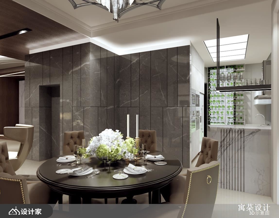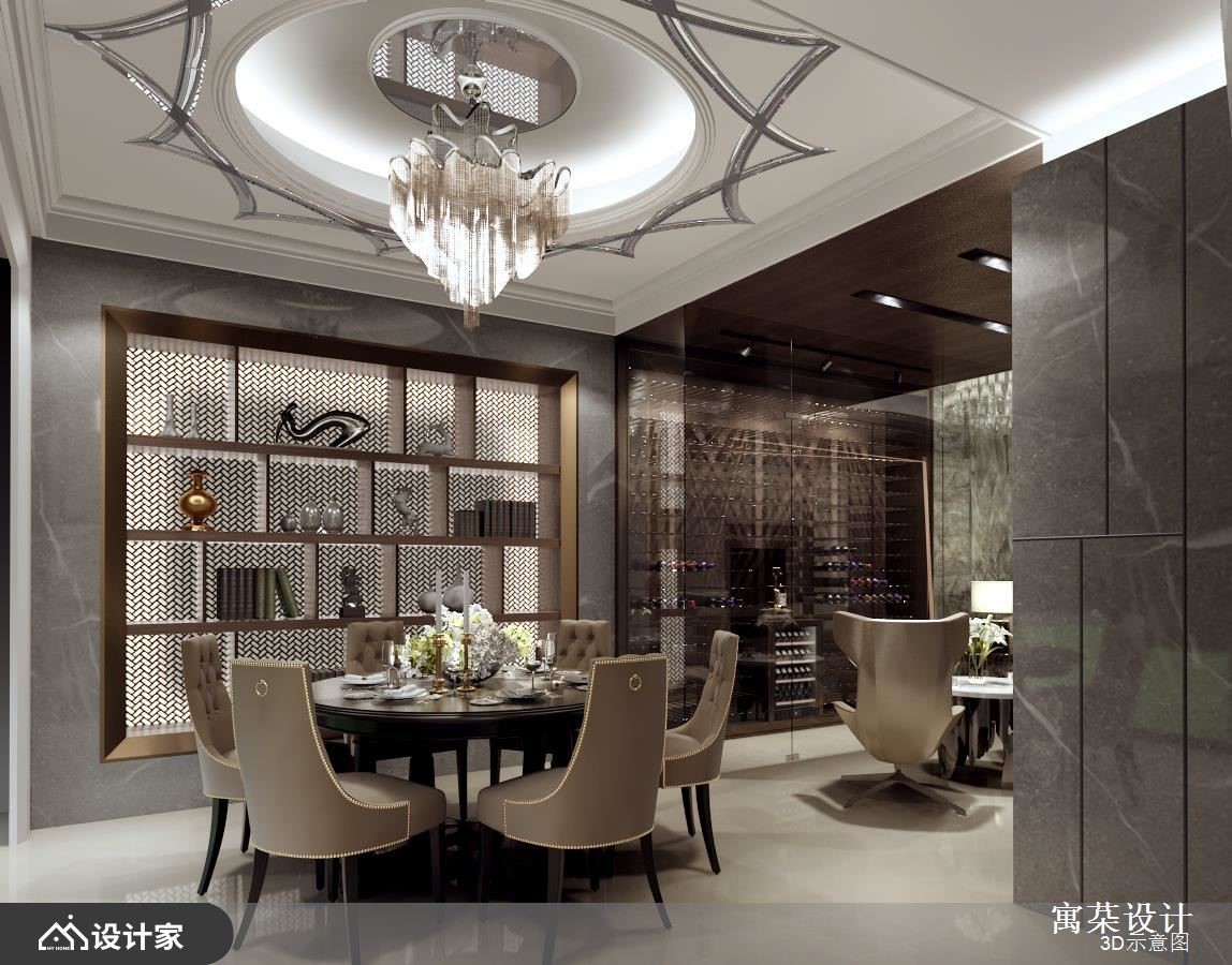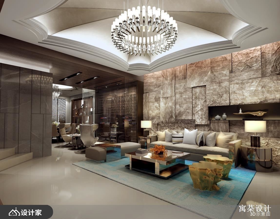 363平米的二手房,原建商格局及内装设计不佳,导致空间不耐用、过于浪费,且还存在漏水问题,于是设计师拆除大部分隔断并重新配置,替公共空间挹注犹如酒店般的大器奢华氛围,而私领域内,则呈现出适合休憩的安稳视野,打造出一家人的梦想住宅。【穹顶设计与石材,营造气派空间】考虑一楼客厅迎宾接待的需求,设计师给予独特的穹顶规划,营造浑然天成的壮观感,并利用不同种类的建材搭佐,呈现视觉层次与尊贵气息,比如沙发背墙即砌叠不加修饰的粗犷石材,引伸出磅礡的大器画面,而侧边则加入东方气息浓郁的屏风,型塑壮阔与细致的对比。【天花板造型,彰显豪宅精致感】餐厅区则透过艺品展示柜带入几何图腾,天花、圆桌则各别融入圆弧线性,以多样化的线条相互交织,凝聚优雅的用餐氛围;而从琴室到卧房,皆可见到不同的天花造型,定义各房间的主题属性,同时加入利落的灯光修饰,彰显出场域的专属个性。
