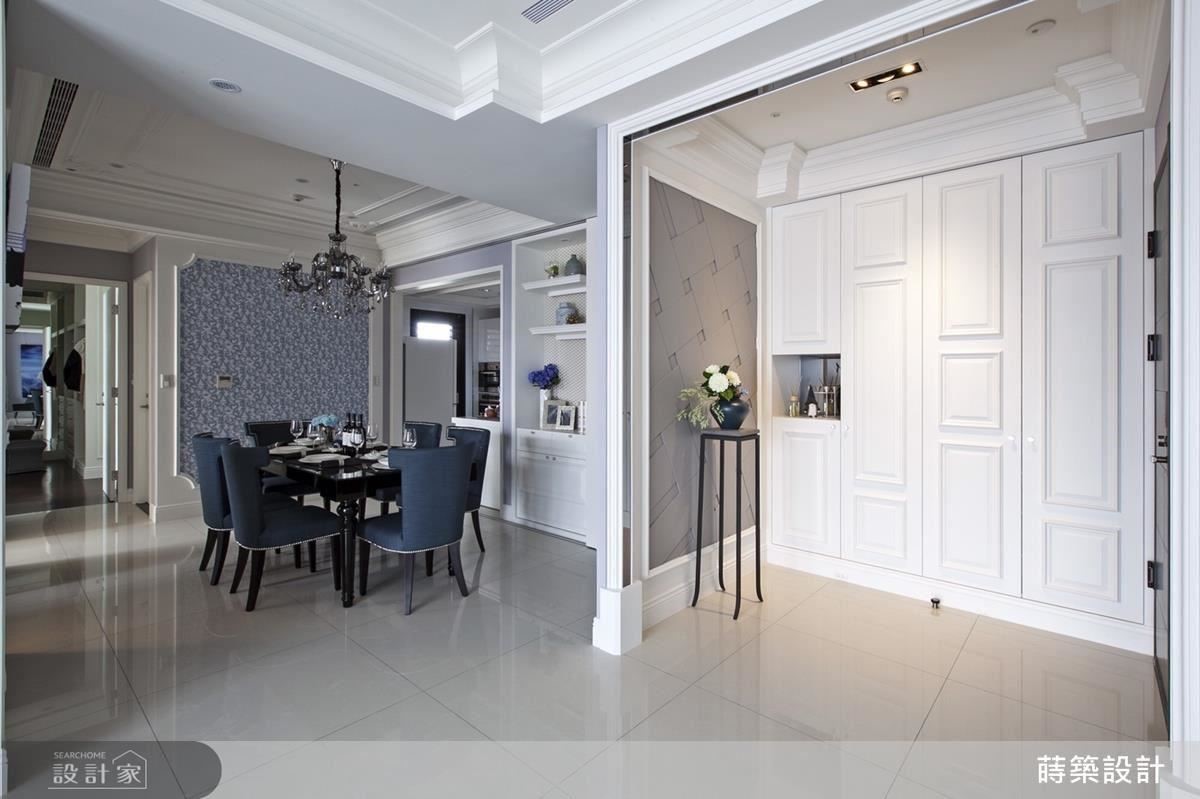 此外,书房的开放式收纳以线板规划层架,并配合间接照明及施华洛世奇水晶把手,墙纸选用与餐柜相同的白色花纹款式,呈现简单却不平凡的气息(右图)。