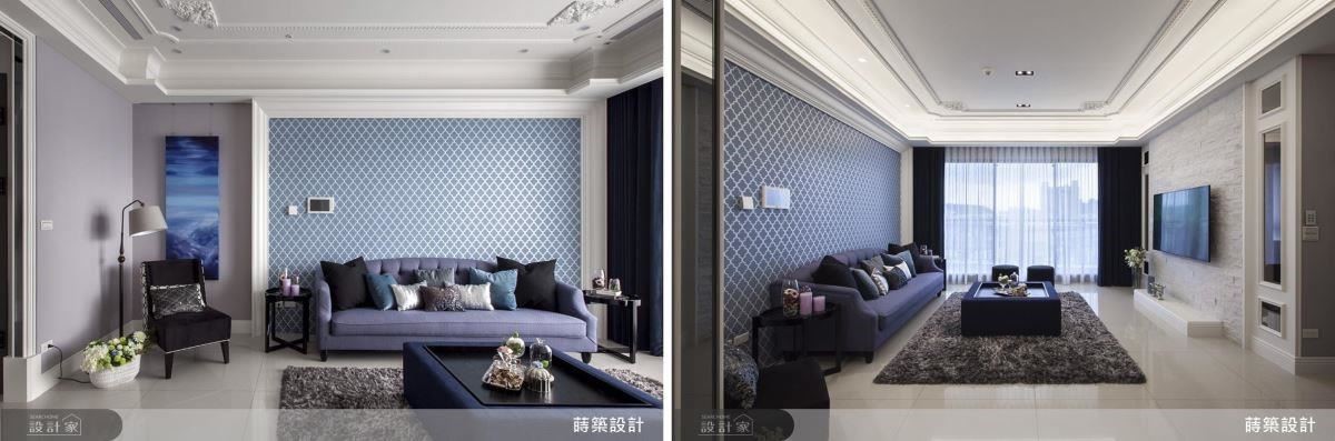 客厅使用特殊图腾的进口墙纸作为沙发背墙;为了与电视墙对称,多出的墙面以紫藕色配上莳筑团队手绘的长形绘画,蜕变成让人沉淀的阅读小角落,丰富空间的多样性(左图)。