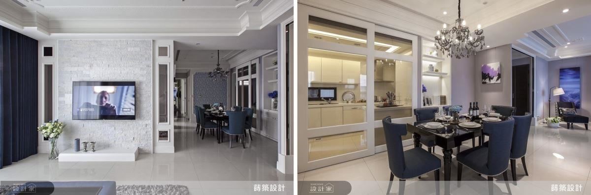 其次,呼应屋主偏好利落的氛围,客厅线条简洁,没有金碧辉煌的装饰,以多层次的线板拉高屋子深度,细致的雕花提升质感,特别是凿面石材的电视墙虽然是一片白,但层次隐然可见,展现出雅致品味(右图)。