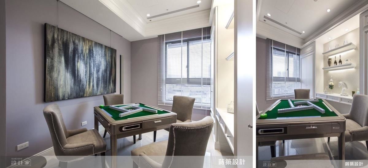 书房是屋主唯一的要求,因为经常请朋友到家里打麻将,是相当重要的社交空间。对此,莳筑团队为了搭配电动麻将桌,特别定制金属铆钉座椅,端景墙另挂上莳筑手绘油画,别具艺术气息(左图)。