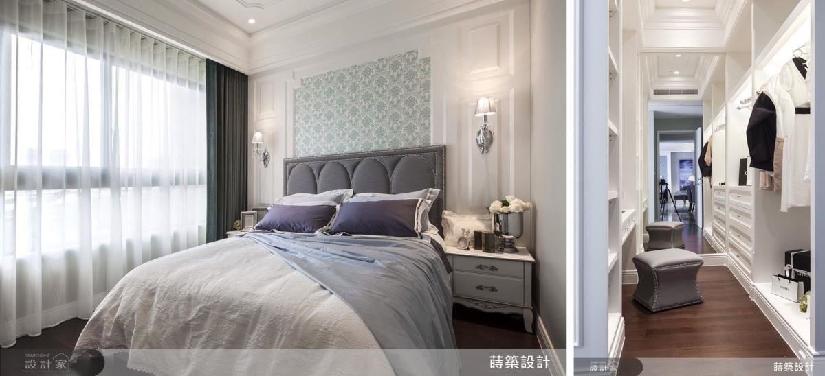 主卧的床头墙以贴近自然的绿色为主调,流泻清新舒适的味道;搭配类似欧洲贵族图腾的墙纸、内敛的线板、贵气的壁灯装饰,以及采用绷布及铆钉制作的床头板,呼应着主人的身分(左图)。
