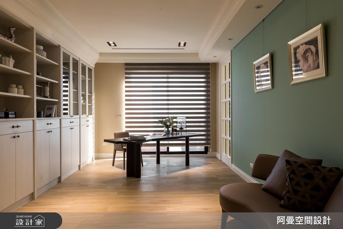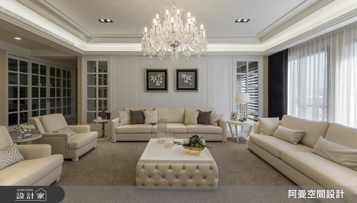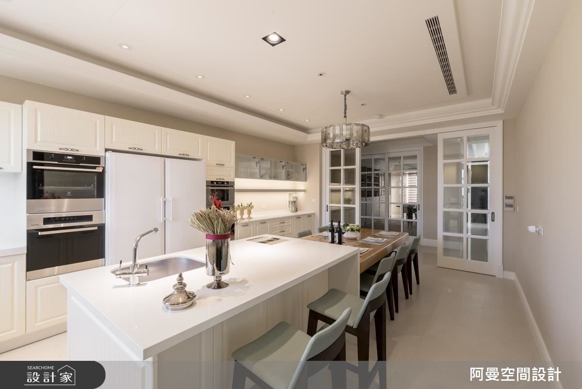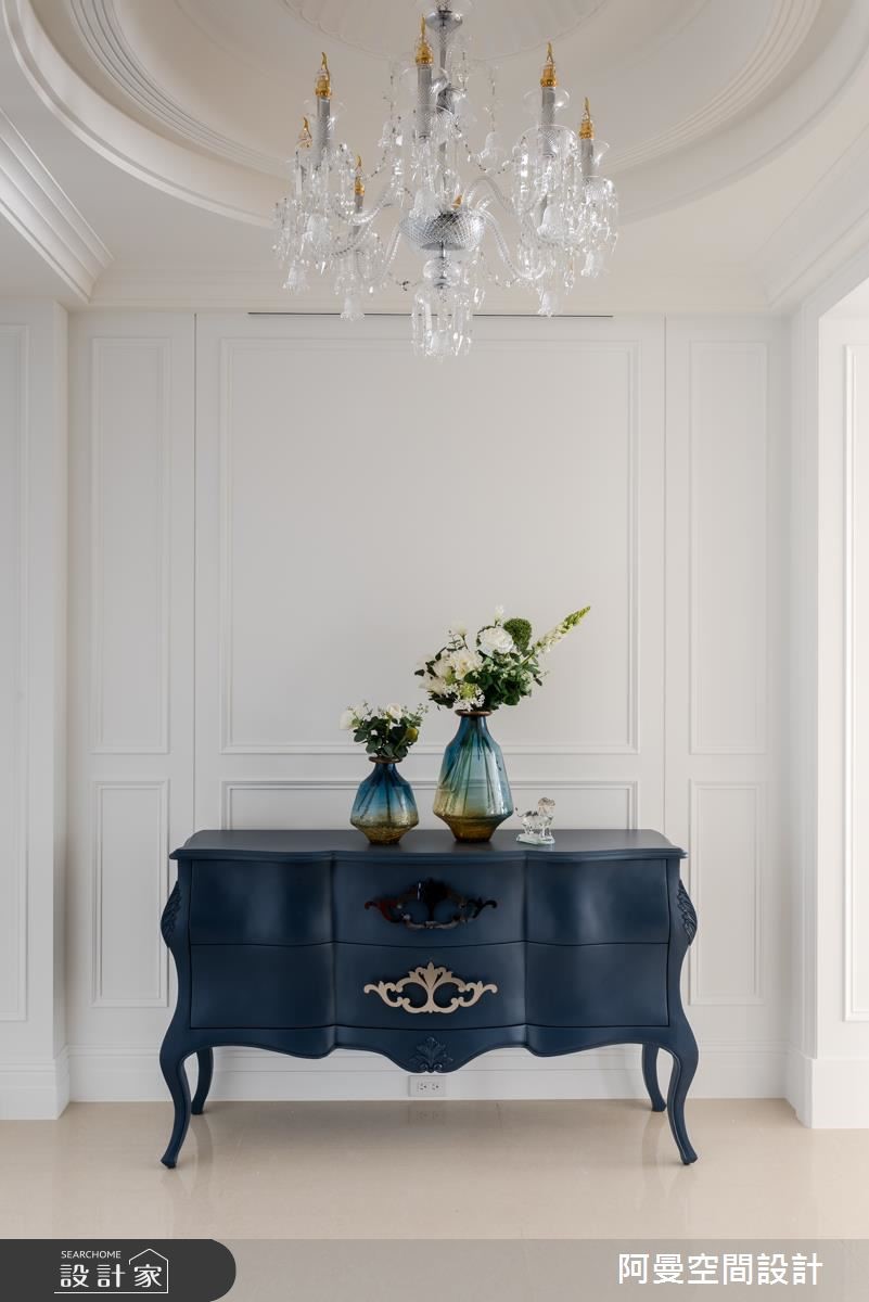 347平方米的自地自建大宅,设计师延揽居宅先天的良好采光条件,并于室内加入白色烤漆线板、方格窗及柔和的藤色水泥漆等,营造出经典的美式乡村风韵,让居宅充满着明亮雅致的气息。【善用灯饰、天花,营造美式质感】玄关区利用烤漆壁板、水晶灯及圆弧天花营造美式乡村的细致感,搭配深蓝色的玄关桌,凝聚入门口的视觉焦点。来到客厅,则可见菱格天花的细致设计,且让电视墙采以文化石搭配石材台面、两侧结合玻璃橱窗,创造大器与机能性。餐厨领域则备齐了一切实用收纳机能,呈现通透而方正的格局,塑造流畅的使用情境。主卧加入了更衣室,运用白色烤漆、线板、菱格纹裱皮革搭配水晶壁灯,彰显女性化的纤细表情。