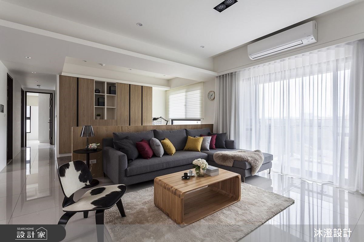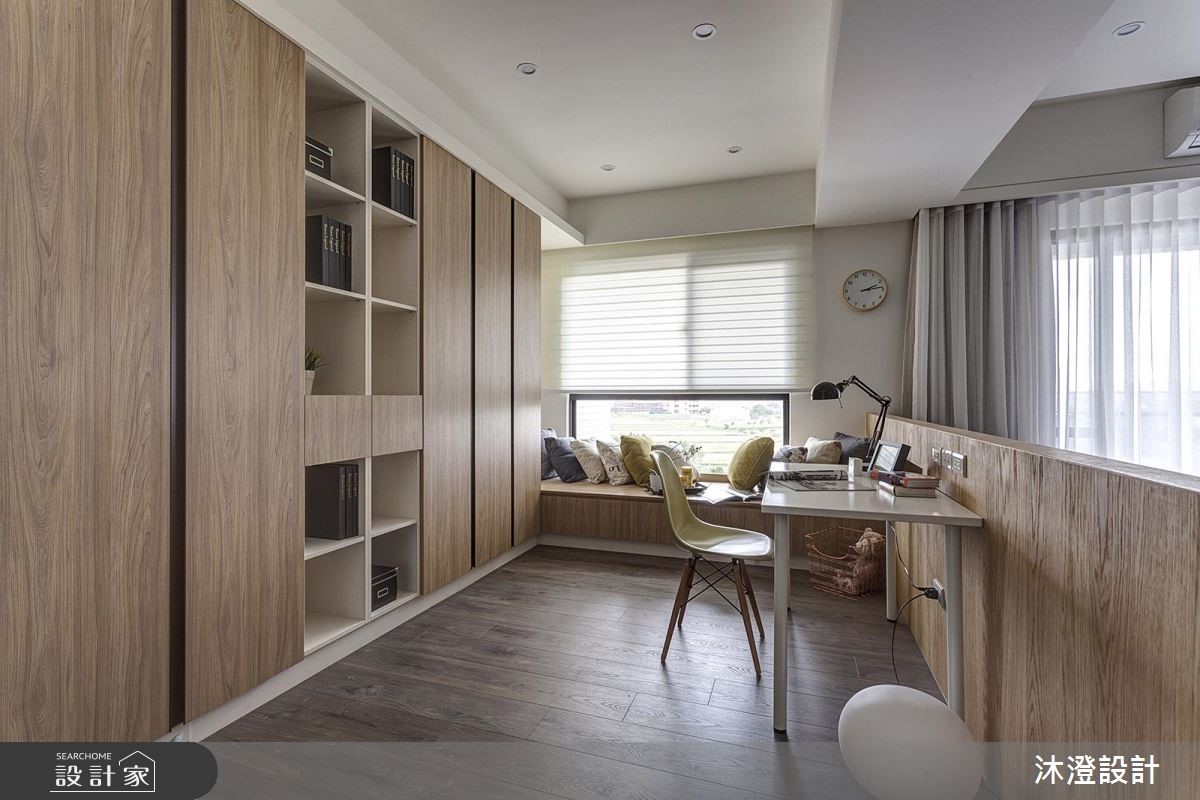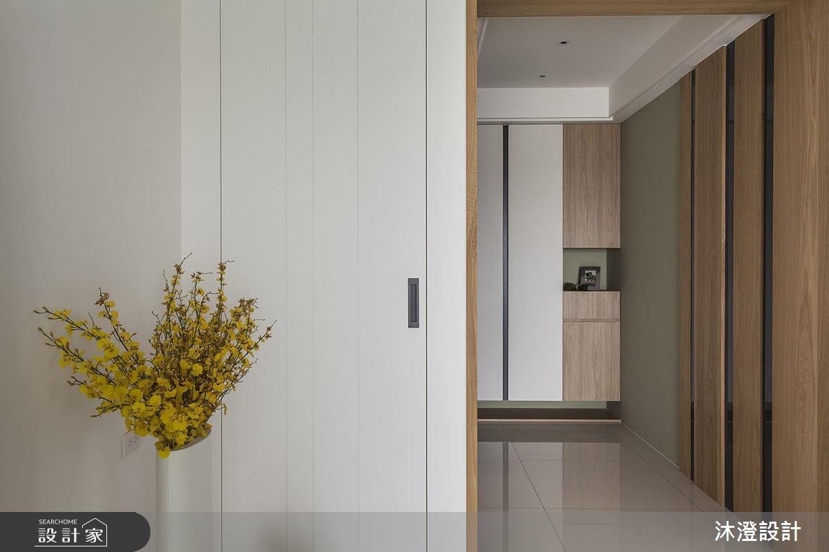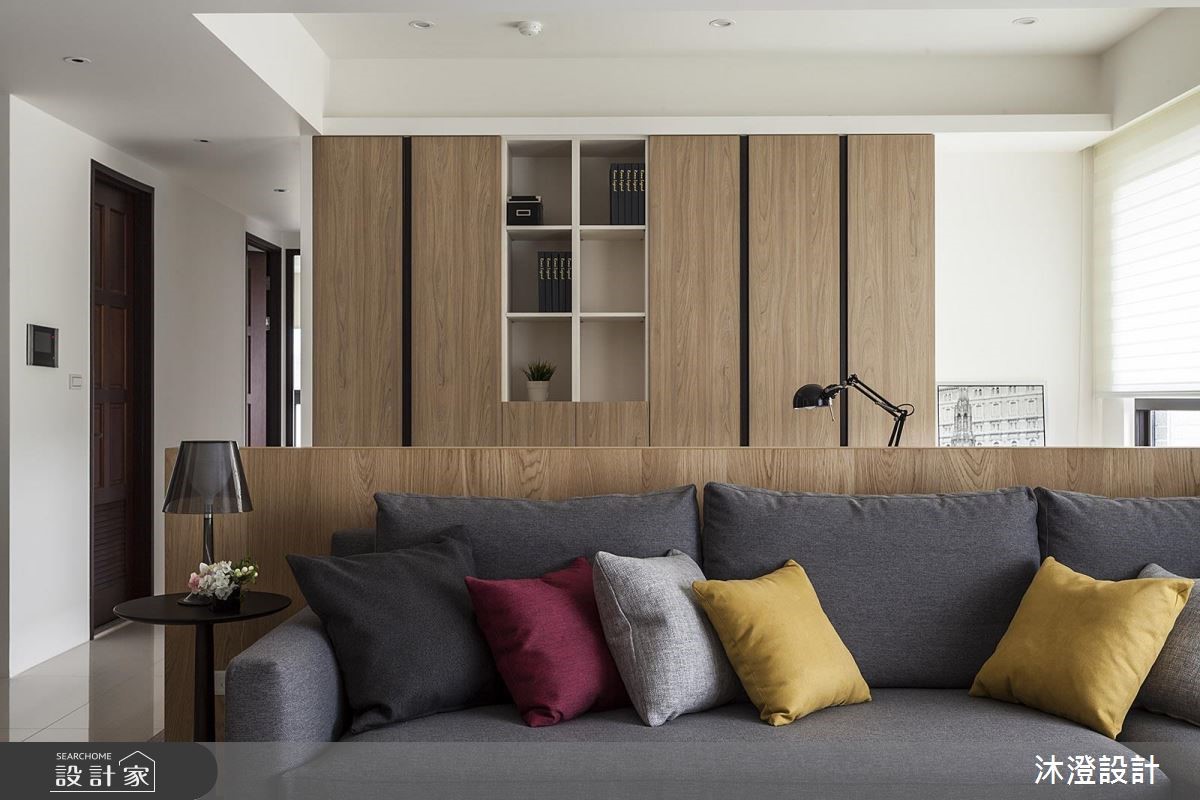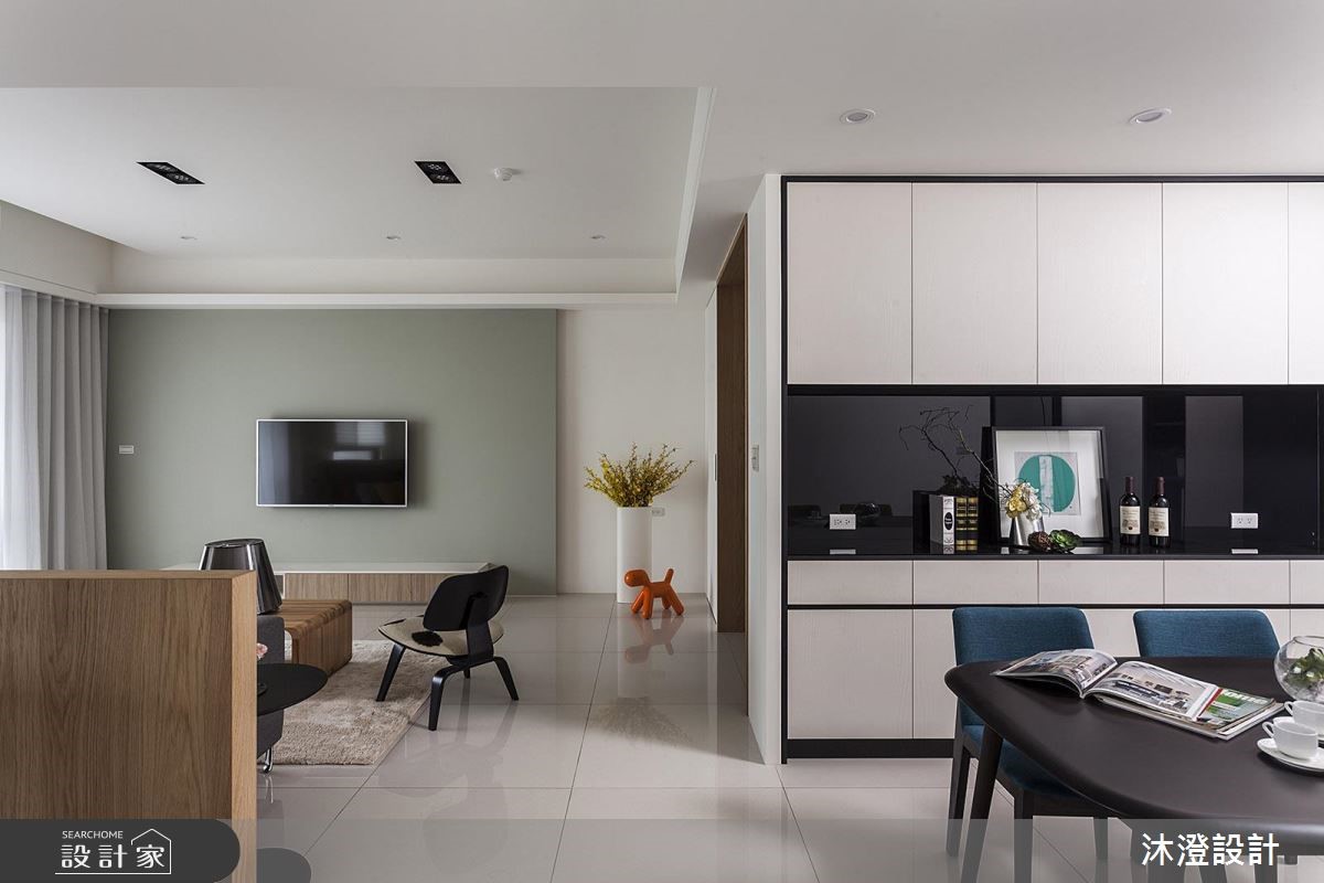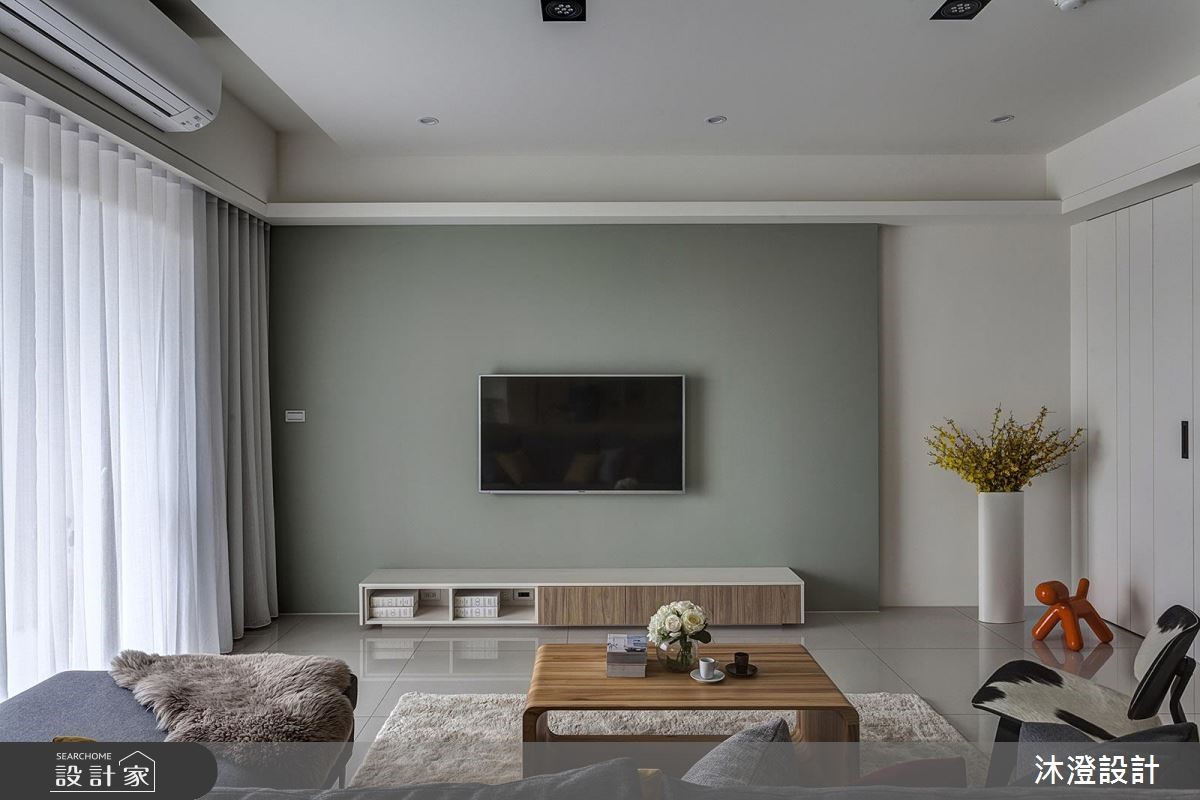 让空间回归简约自然,不过度修饰的居家设计,仅以色彩点缀主墙面,鲜明木纹化身为柜体的独特面貌;随着户外暖阳恣意流泻一室,塑造开放、舒心的生活态度。 【浅绿及深蓝点缀,添沉静气息】玄关以悬空造型的鞋柜作为室内风格的开场,刷上奶油色的柜体,展现清爽又不失温度,衔接橡木钢刷木皮与镜面穿插的墙面设计,呈现丰富视觉。客厅整体以白色壁面饰底,电视墙则改以绿色系铺陈,强化视觉焦点。窗帘也随之调整为浅绿色彩,相互搭衬。深蓝色系的沙发强调出主体重点,藉由缤纷色系的抱枕点缀,沉稳调性中增添活力。沙发后方以矮柜区隔出开放书房,增设原木质感的书柜,为简约空间增添暖意。窗边则另设一米飘窗,塑造悠闲的阅读角落,也成为小孩们放松玩耍的游戏区。主卧室壁面以大量的白色打底,搭佐奶油配色,展现清爽的空间美学;一旁打造更衣室,满足日常的收纳机能。