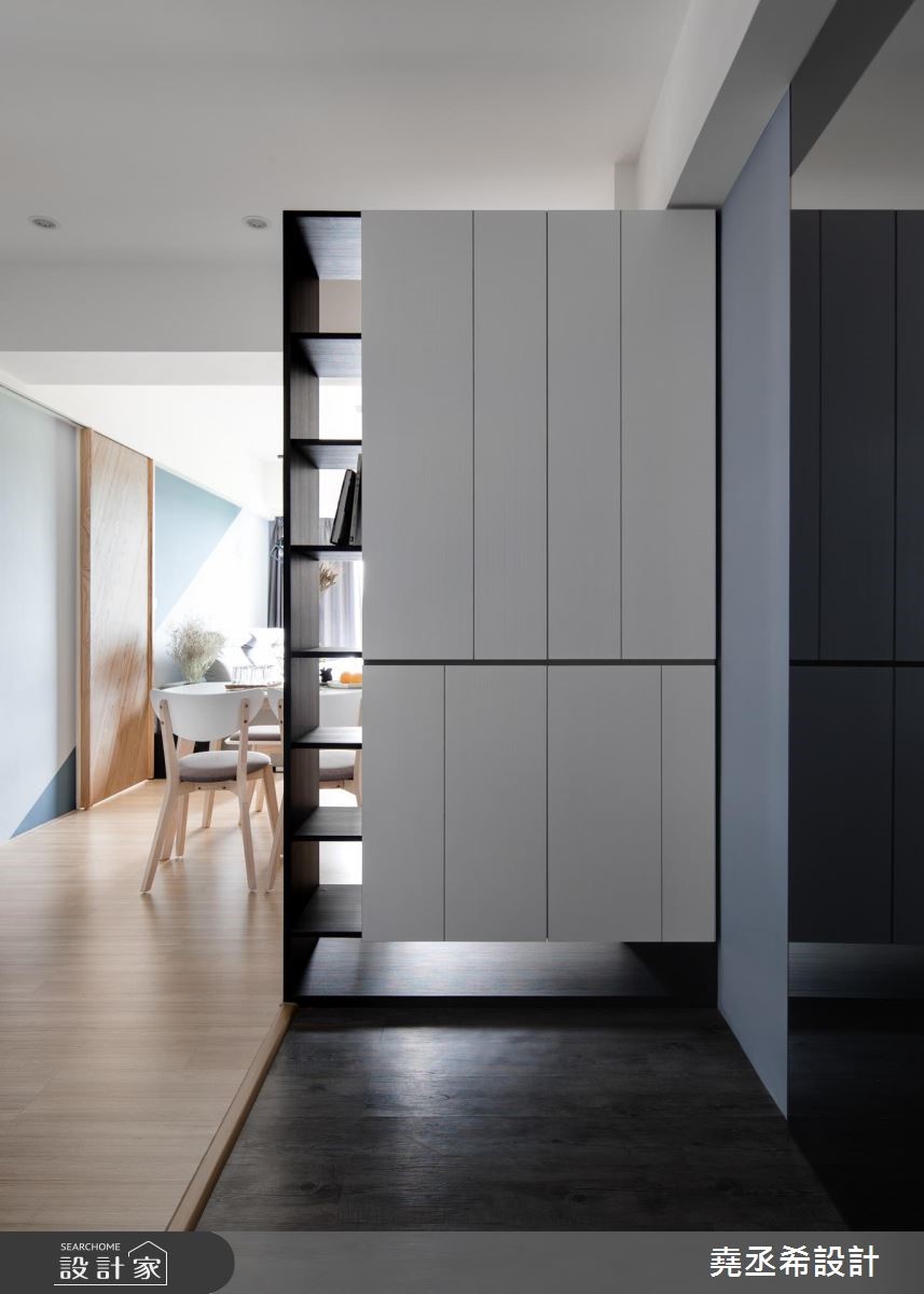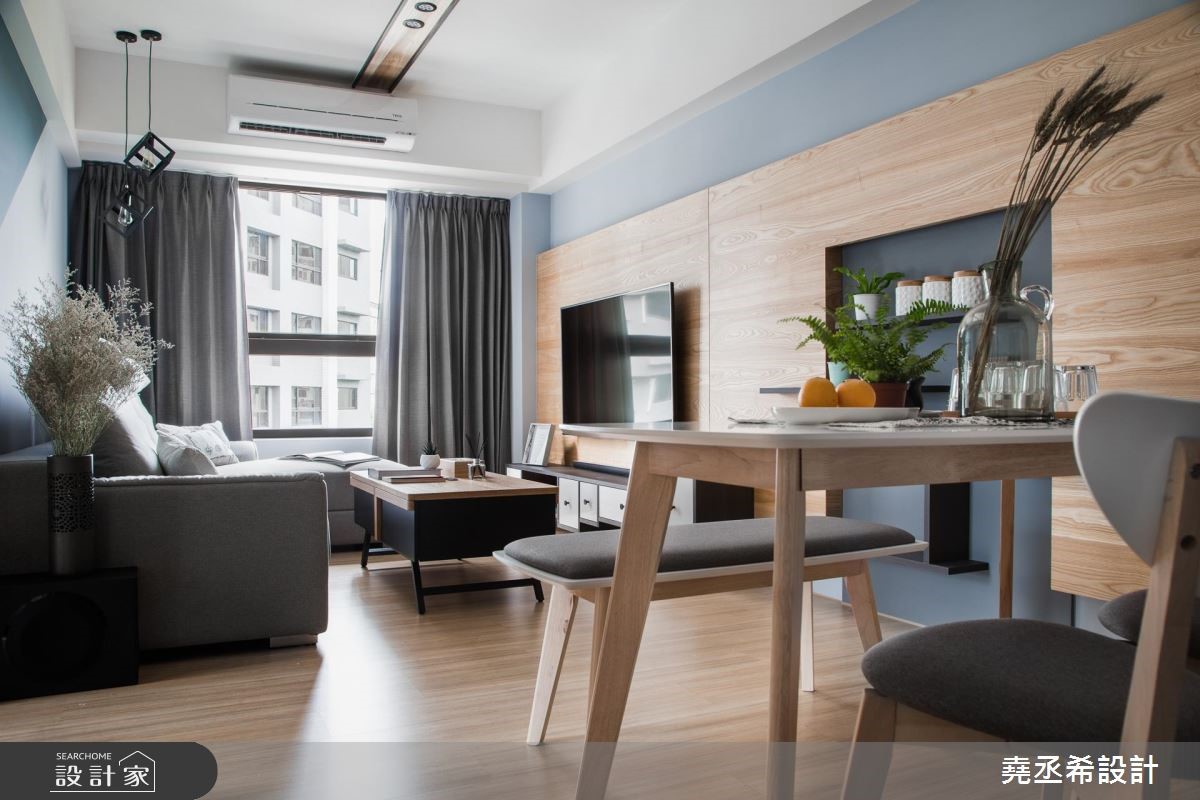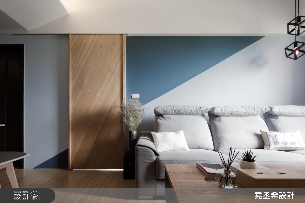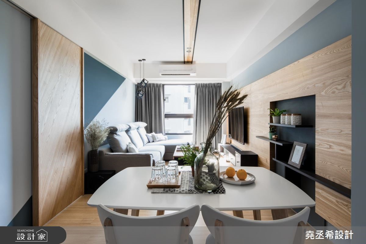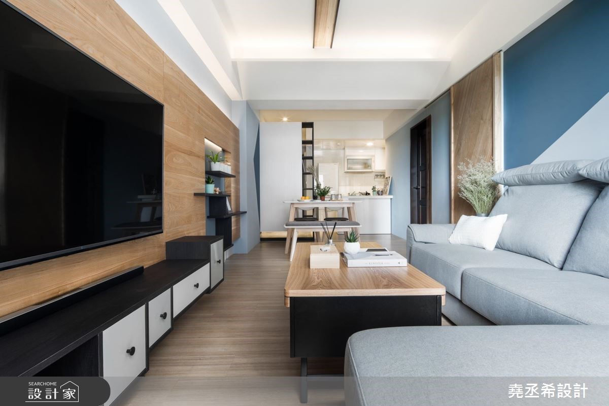 钟情北欧风的自然简约,又希望能在59平方米的室内里,打造三个休闲机能空间。设计师发挥设计巧思,利用以人为本的北欧风特质,创造美学与机能兼备的风格宅居。【深淺色靈活運用,調和室內氛圍】进门处,透过悬空鞋柜与深色木纹地坪界定出玄关场域,也让光源穿越镂空层板进入玄关。走进室内,公领域以开放格局安排,深浅蓝色相间且以倾斜角度衔接,淡雅之中流露清爽的质地,引喻海洋般辽阔胸怀,灰色调的沙发背墙更融入浅色壁面中,展现简约安定之感。鲜明的木纹肌理仿佛神来一笔,转化为地坪、门片、电视墙与茶几风貌,引入自然的疗愈生命力,餐桌更选用椭圆线条勾勒桌体边缘,降低尖锐的视觉感受,替家屋增添一股温馨、疗愈气息。