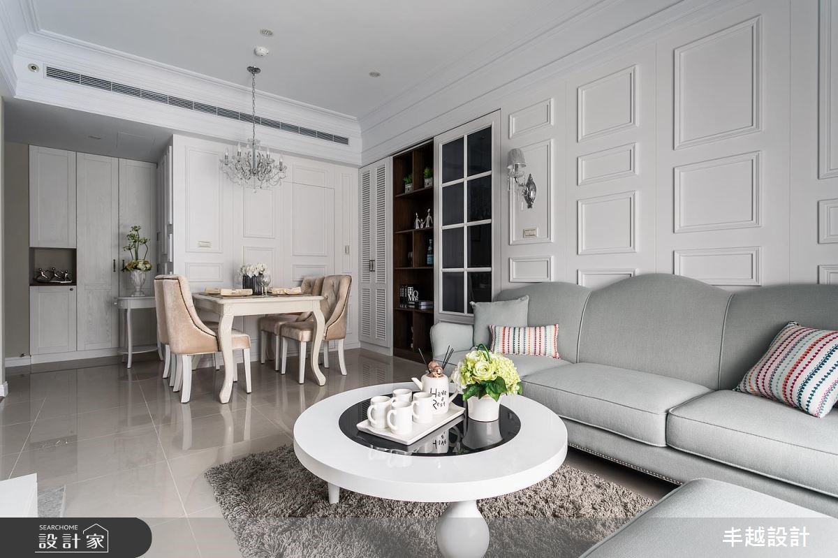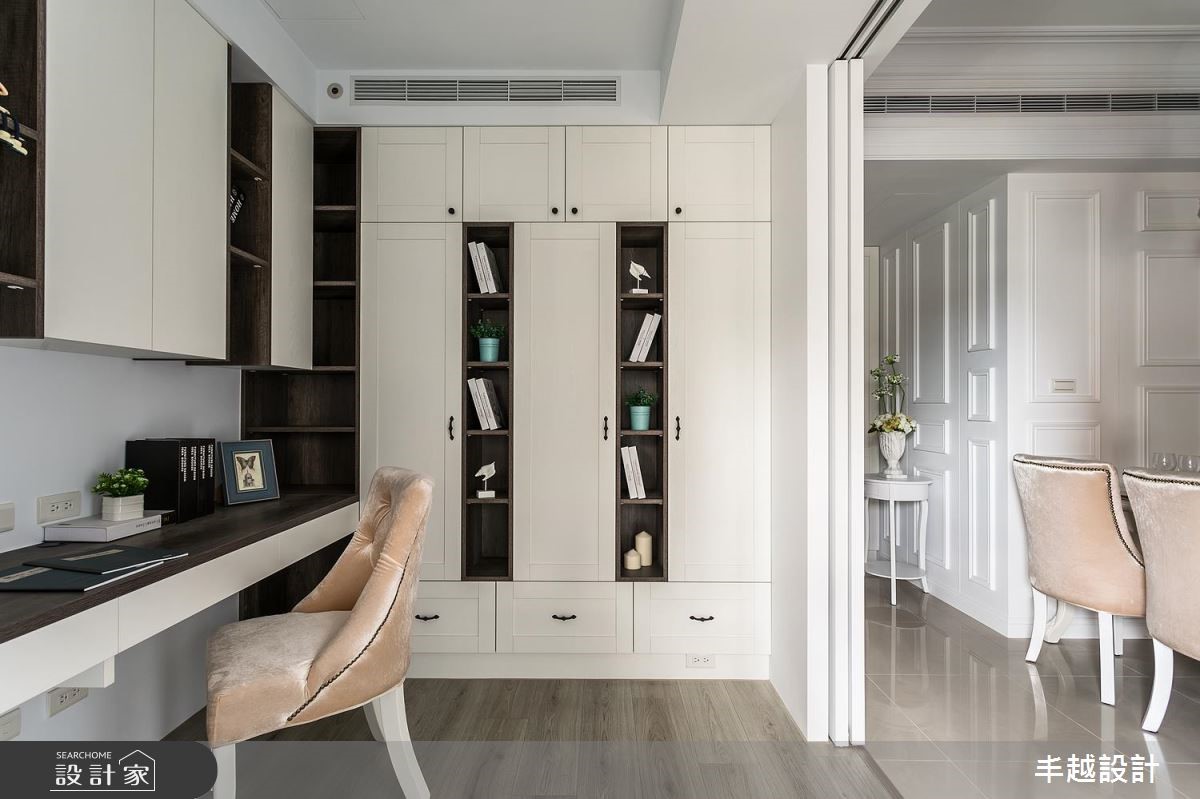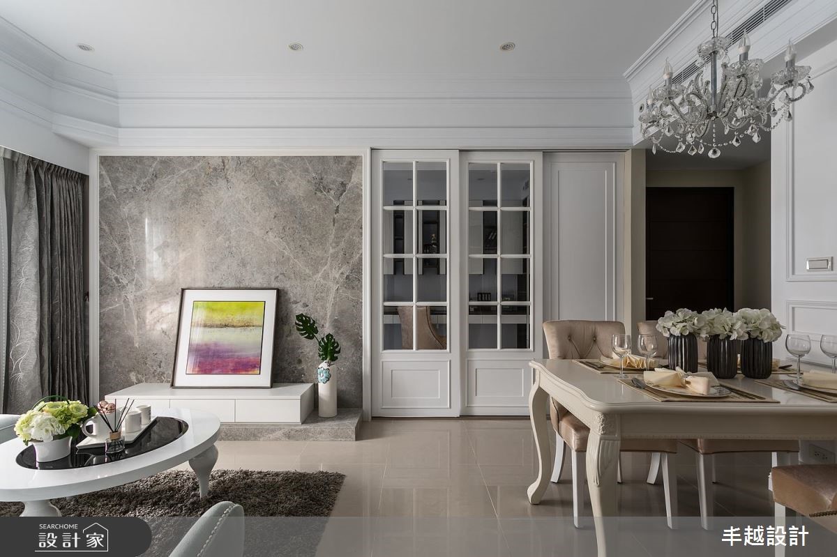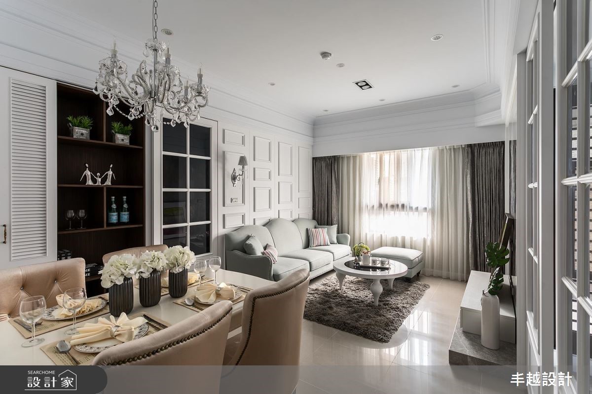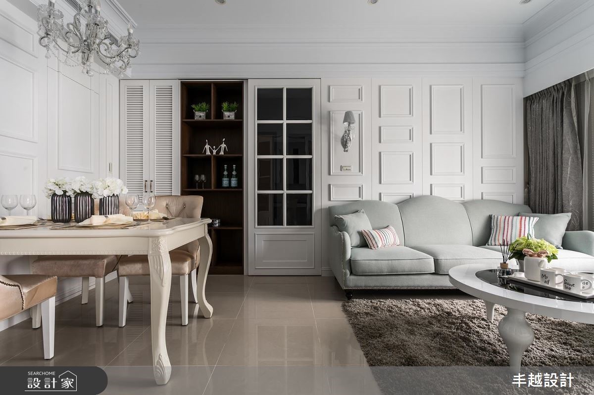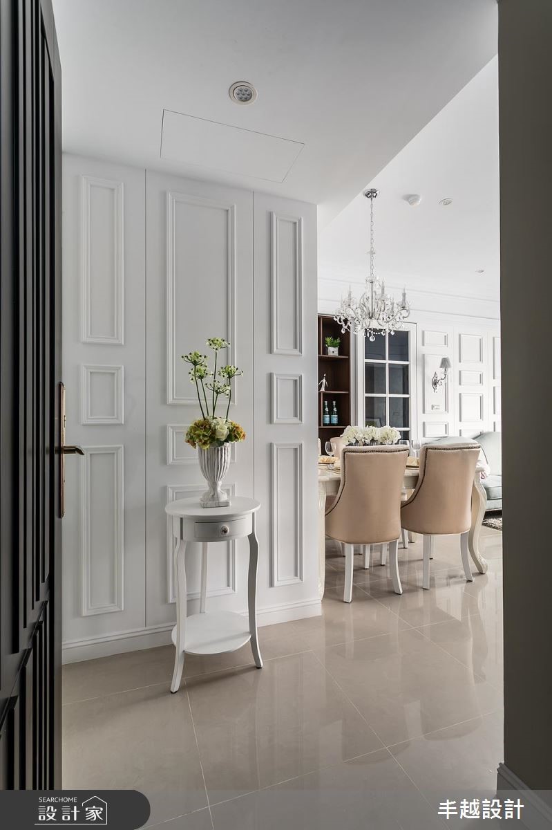 设计师以新古典作为基底,搭配少许美式风,创造出白色系的浪漫与梦幻,并替居宅重新布局,借着格子拉门的配置,隐藏书房与卧房场域,让每一道动线皆层次分明,营造充满流动感的生活情境。【活动门片,创造弹性生活动线】玄关区,以白色底搭配优雅植栽营造入门后的梦幻序曲;公共领域则运用白色调与大理石等堆叠华美气质,局部利用亮眼剔透的灯饰加以妆点,显现美学风尚,所有立面均可见线板的凹凸修饰,创造整体空间的律动层次。通往书房与私领域的廊道,藉由玻璃格子门片加以划分,既维持了光线、视野的延伸,也赋予更为明确的使用范畴;主卧空间加入绿色壁纸、营造清新情境,以细致的白色勾边道出质感,搭配带有古典气息的软装与床头,引出雅致的生活品味!